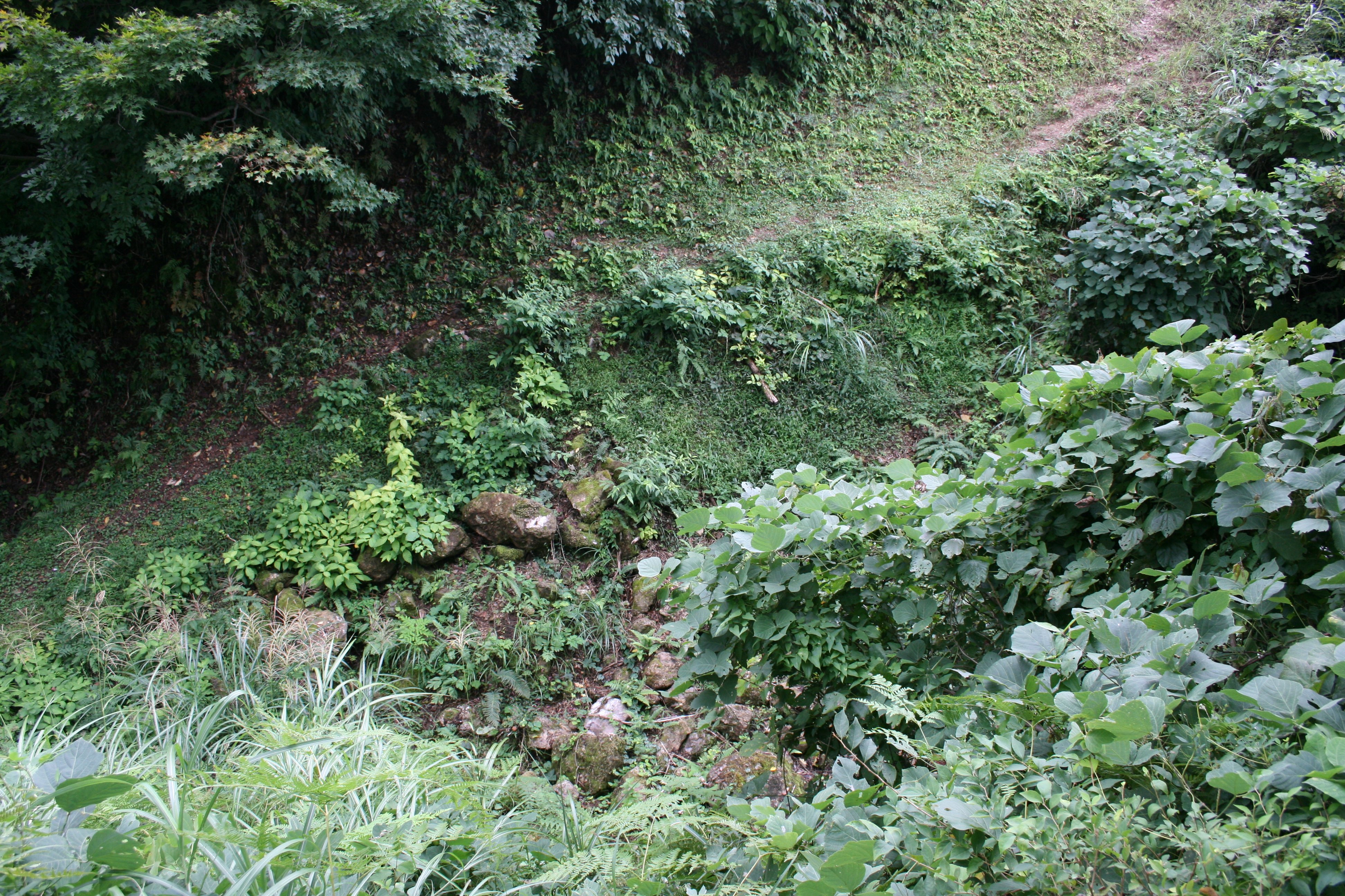 この松倉城は、基本的には土塁と堀切が主体の山城ですが、小規模ながら石垣もあります。