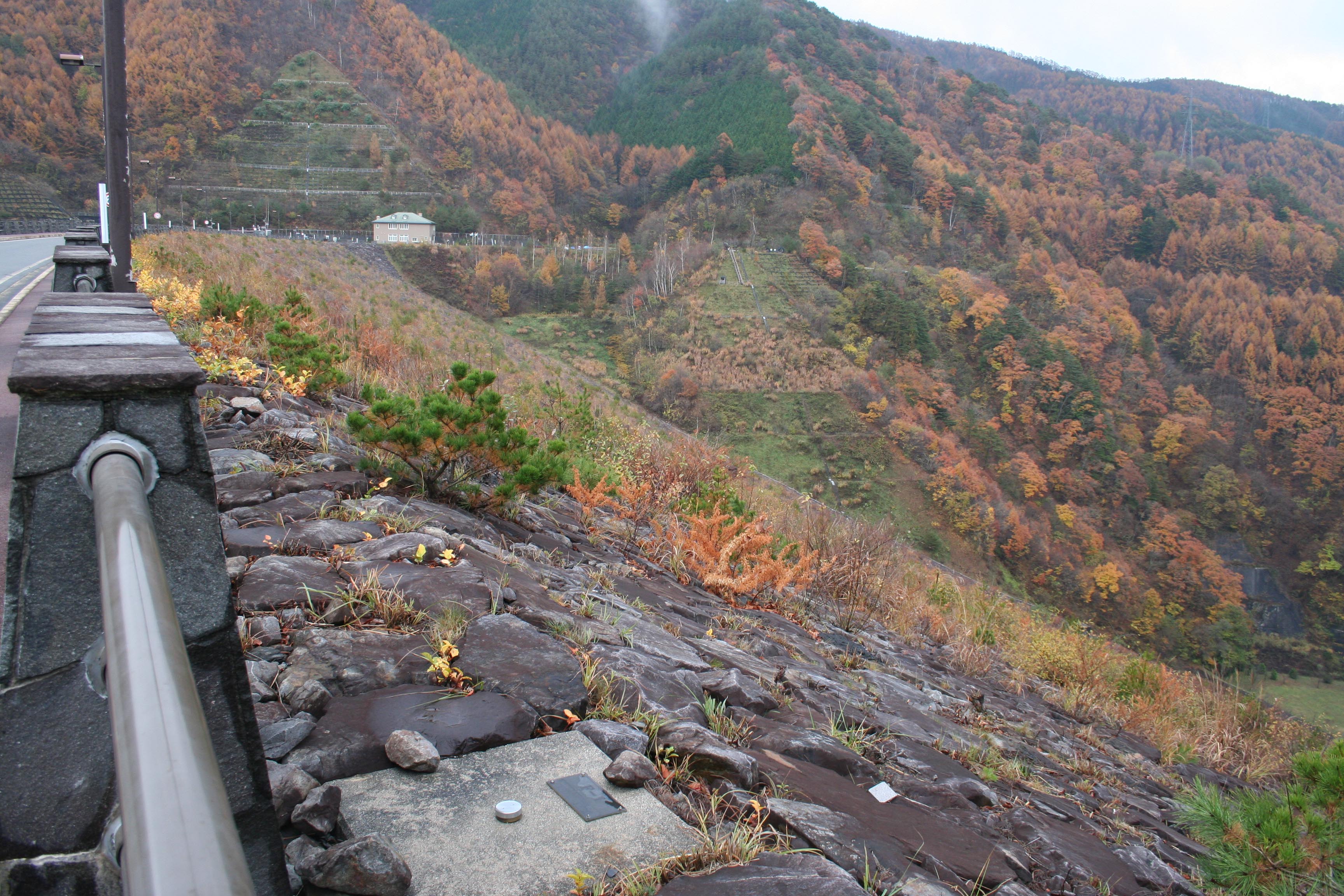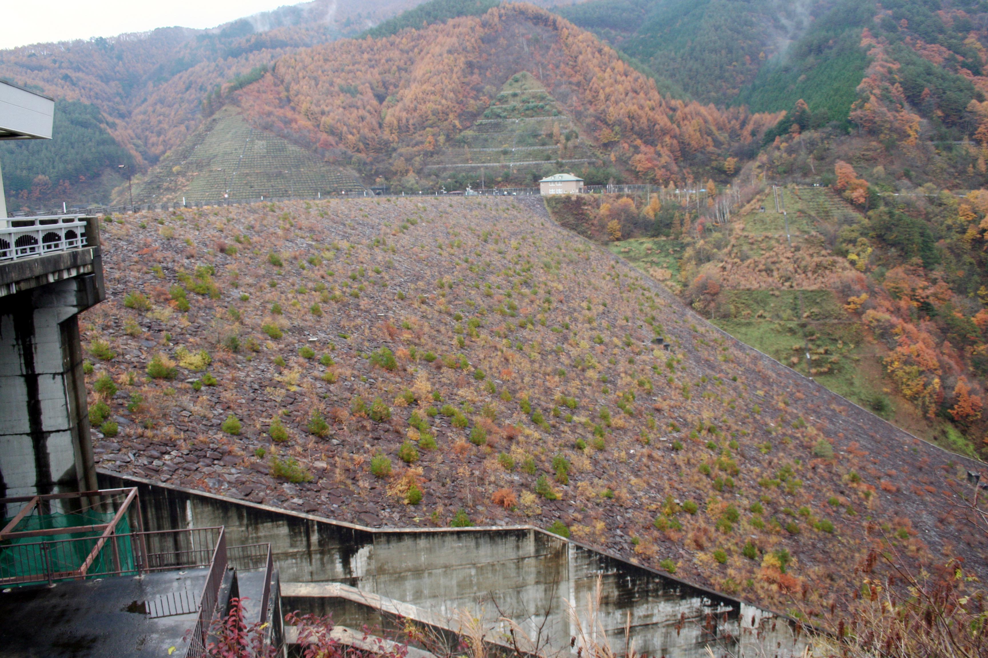 堤体を右岸から見る 非常用洪水吐き