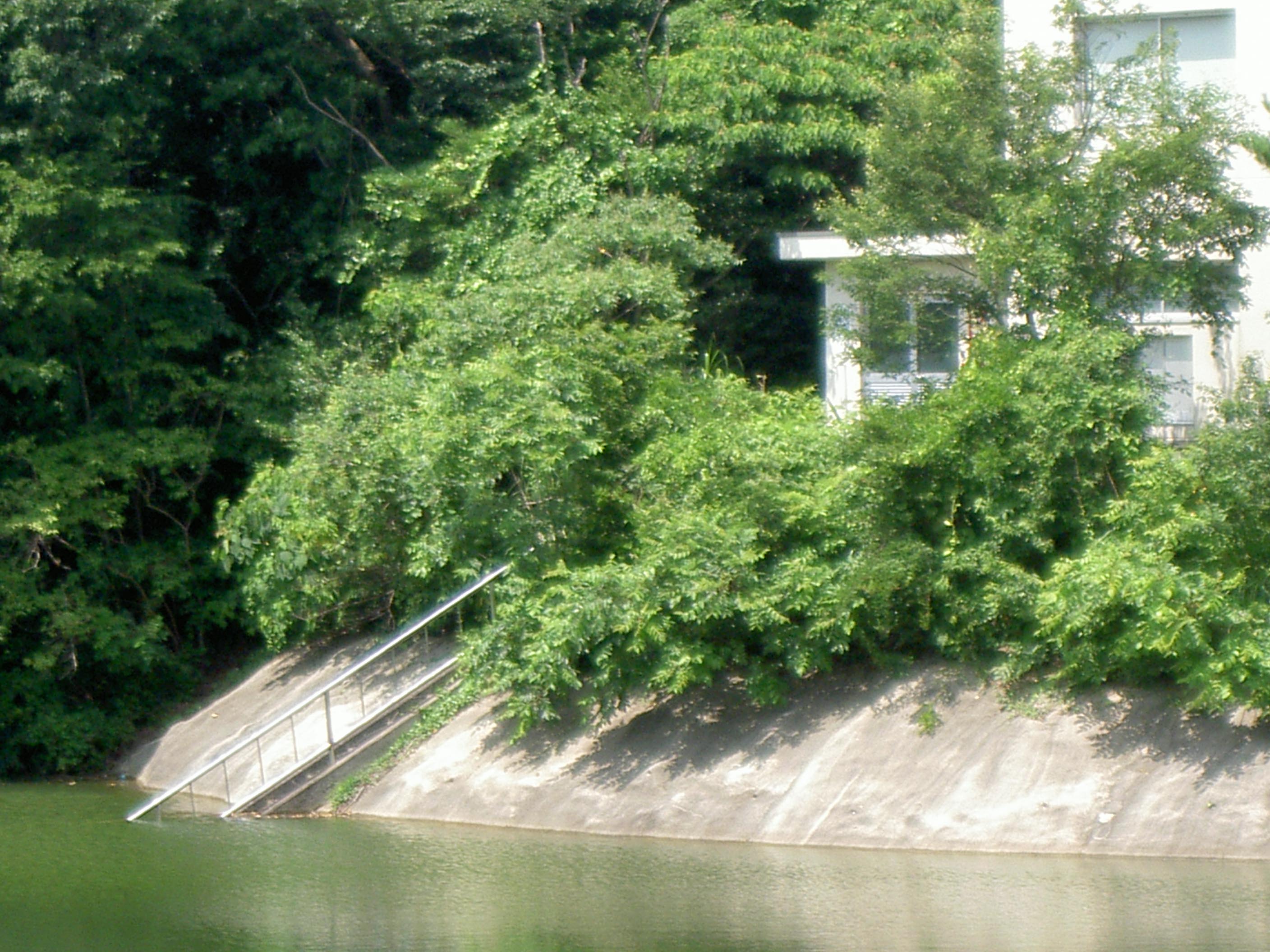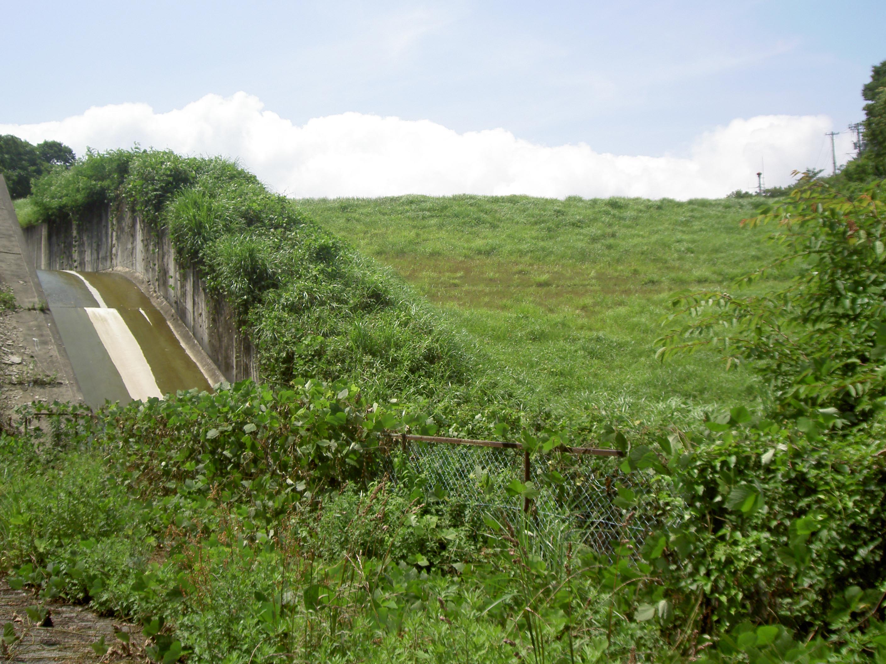 治水専用ダムであれば、夏場はもう少し水位を下げておくのが普通でしょうが、このダムには常用洪水吐らしいものが見当たりませんので、そのような調節はできないのでしょう。 |