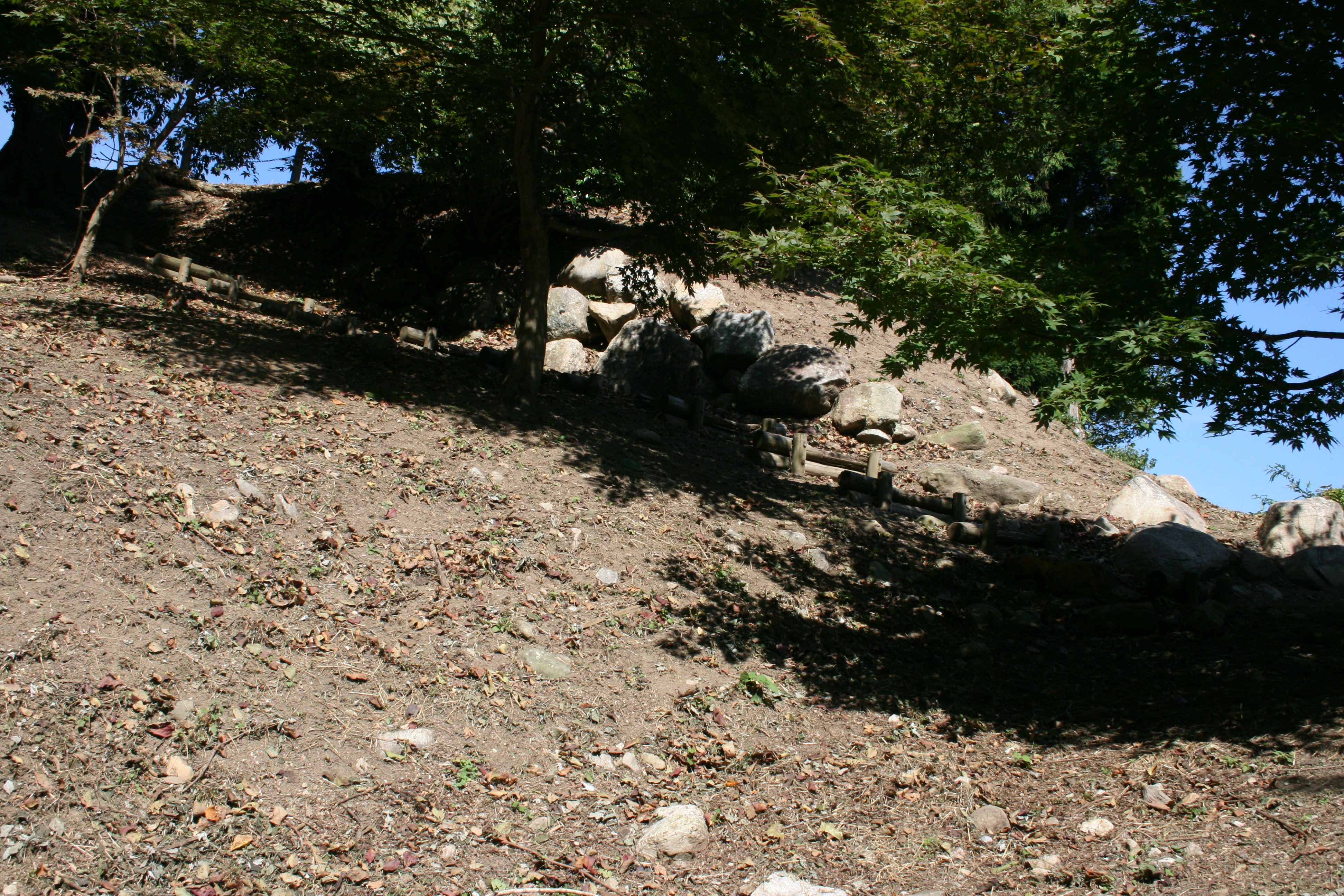 | 本丸の石垣跡の外側には空堀があった |