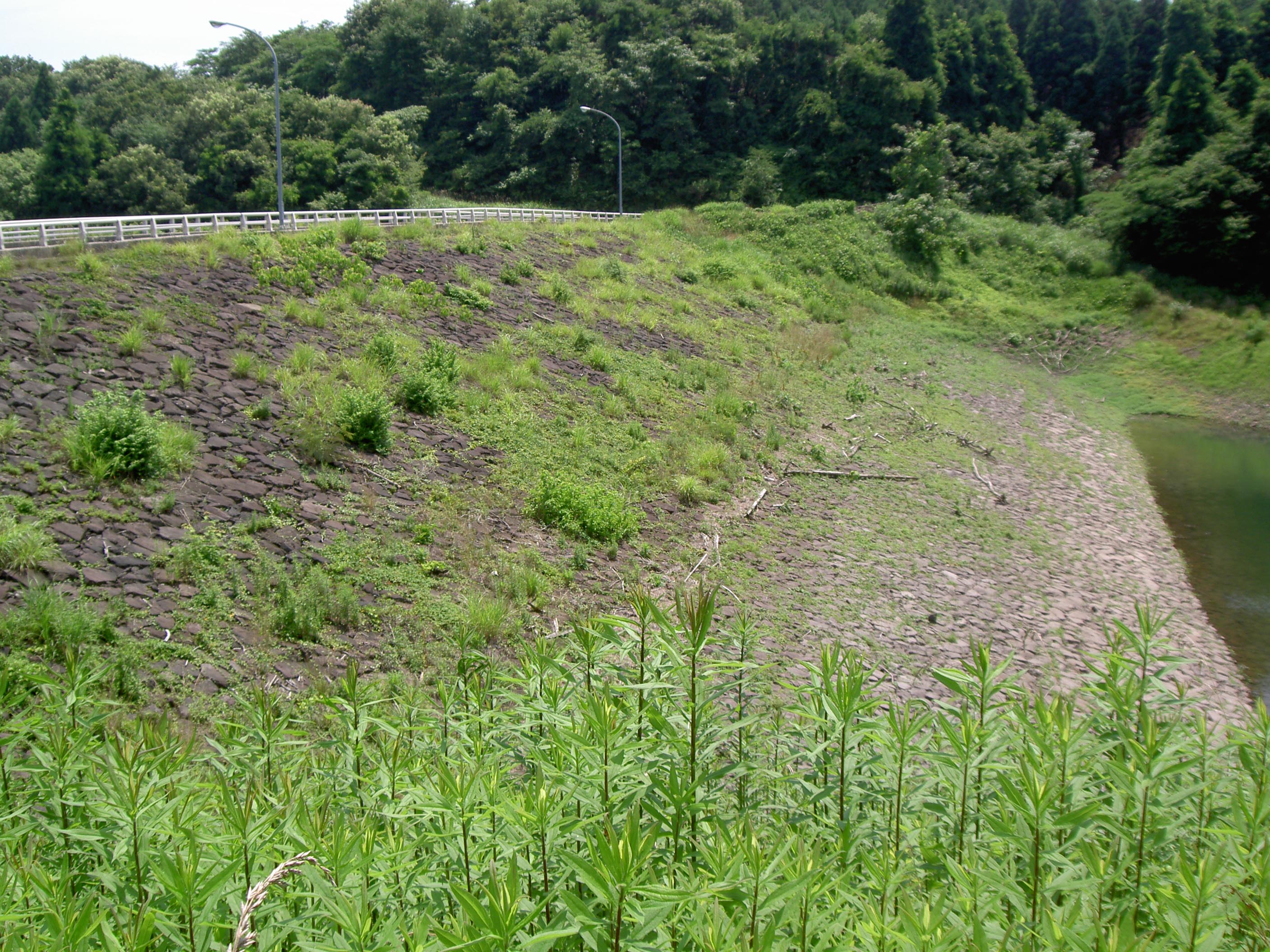 堤体には草が生い茂っていて一見アースダムかと思いますが、よく見るとやはりロックフィルダムでした。