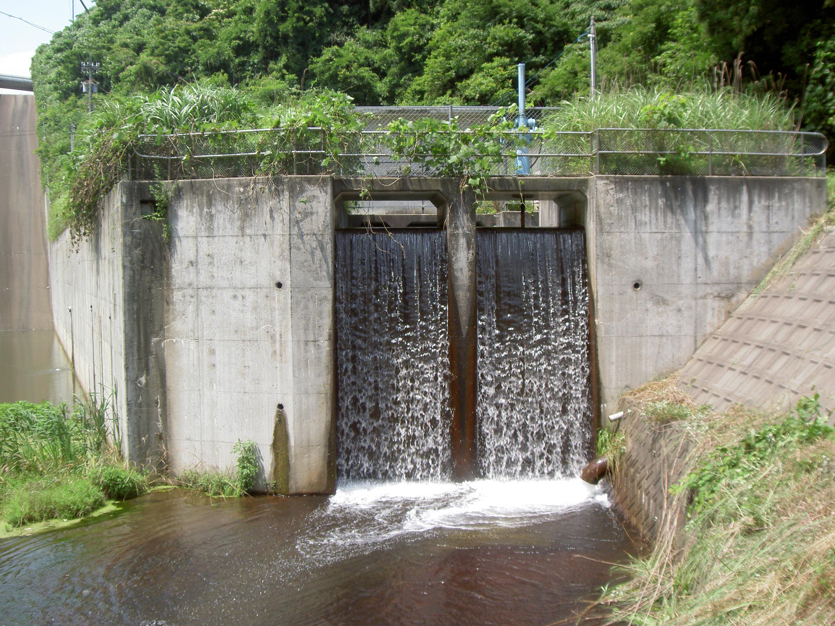 このダムには、自由越流式洪水吐がありますが、ゲートらしいものは小さなスライドゲートらしいものが1門あるだけでした。