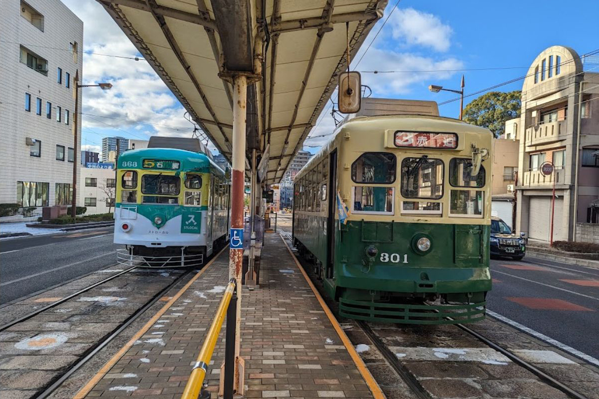 奥に蛍茶屋車庫 長崎電気軌道370形電車