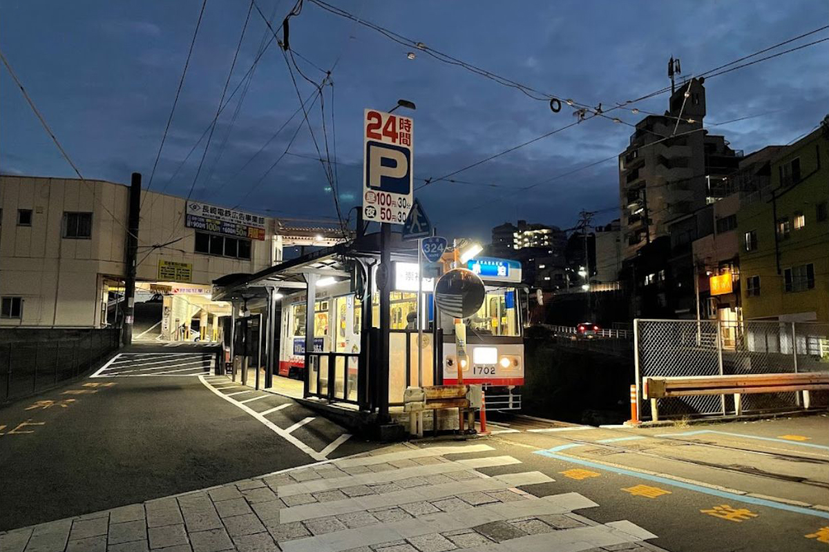 思案橋停留場から坂を上った先、複線の軌道が合流し単線になった先にホームがあります。