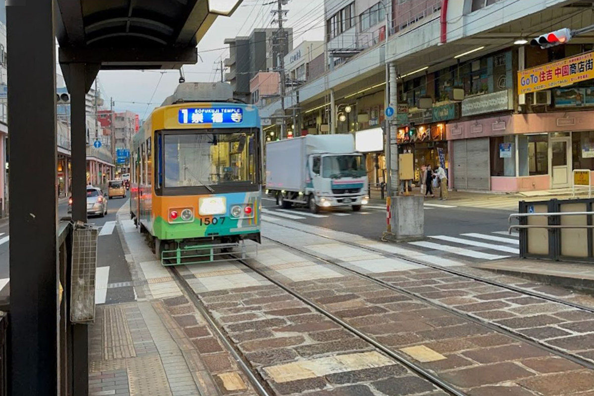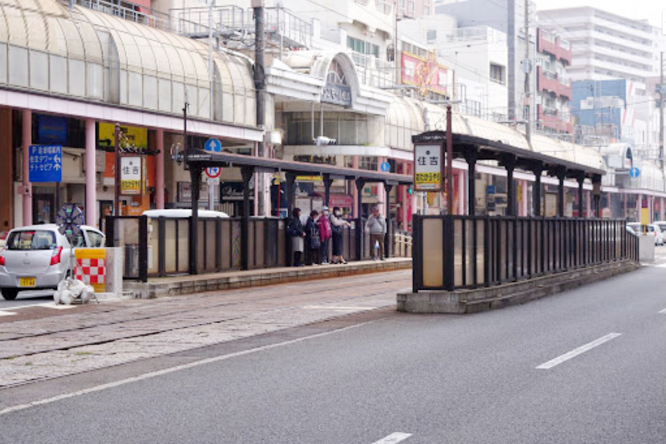 住吉停留場は併用軌道区間にあり、ホームは道路上に設けられています。