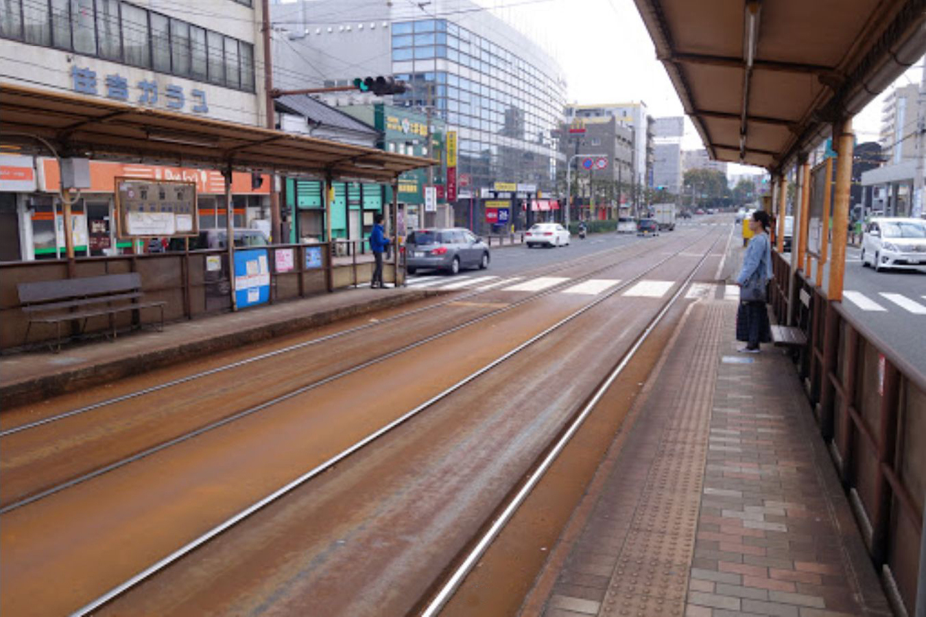 若葉町停留場は併用軌道区間にあり、道路上にホームが置かれます。
