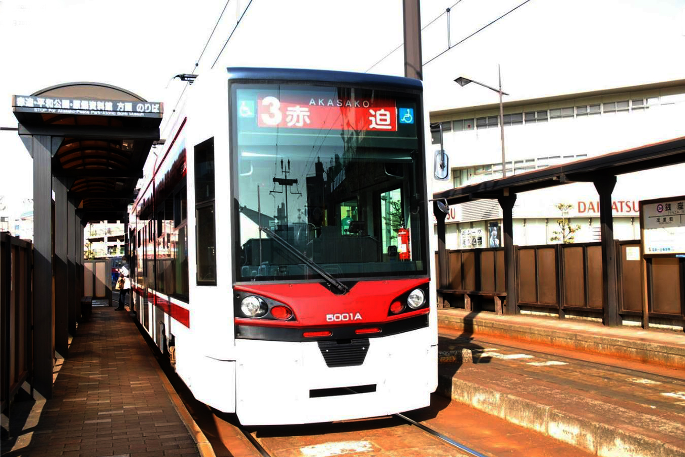 八千代町停留場は併用軌道区間にあり、道路上にホームが設けられています。