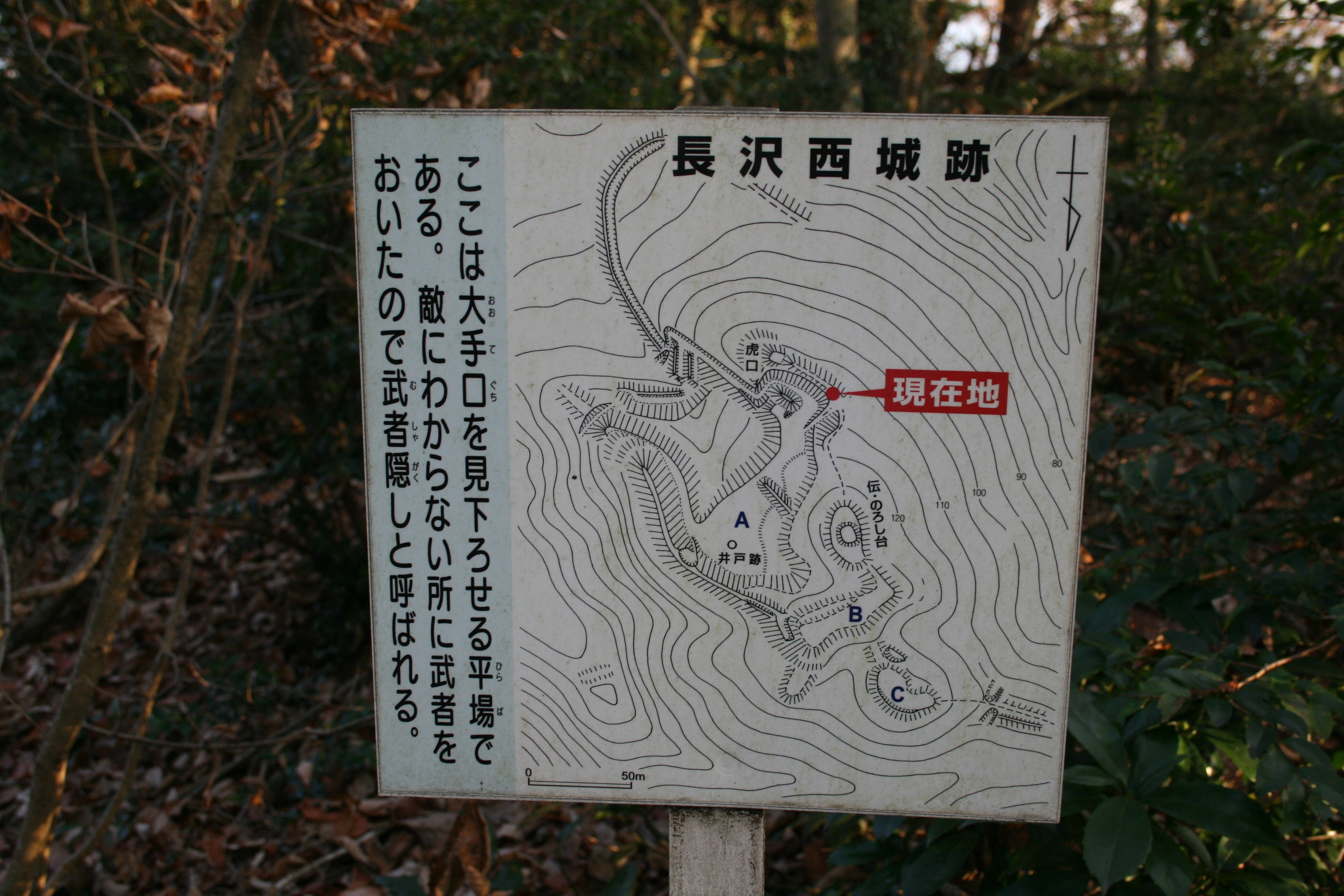 城山と呼ばれる尾根の頂上に築かれた中世山城です。谷を挟んだ西側には長沢東城があります。一般には長沢西城を「長沢城」、長沢東城を「家老屋敷城」と呼んでいますが、むしろ長沢東城の方が全体的な標高も高く規模も大きく、郭も多いことと、こちらの長沢西城には狼煙台があることから考えると実は長沢東城の方が本城なのかもしれませんが、実際には一城別郭と見る方が本当なのかなと思います。
