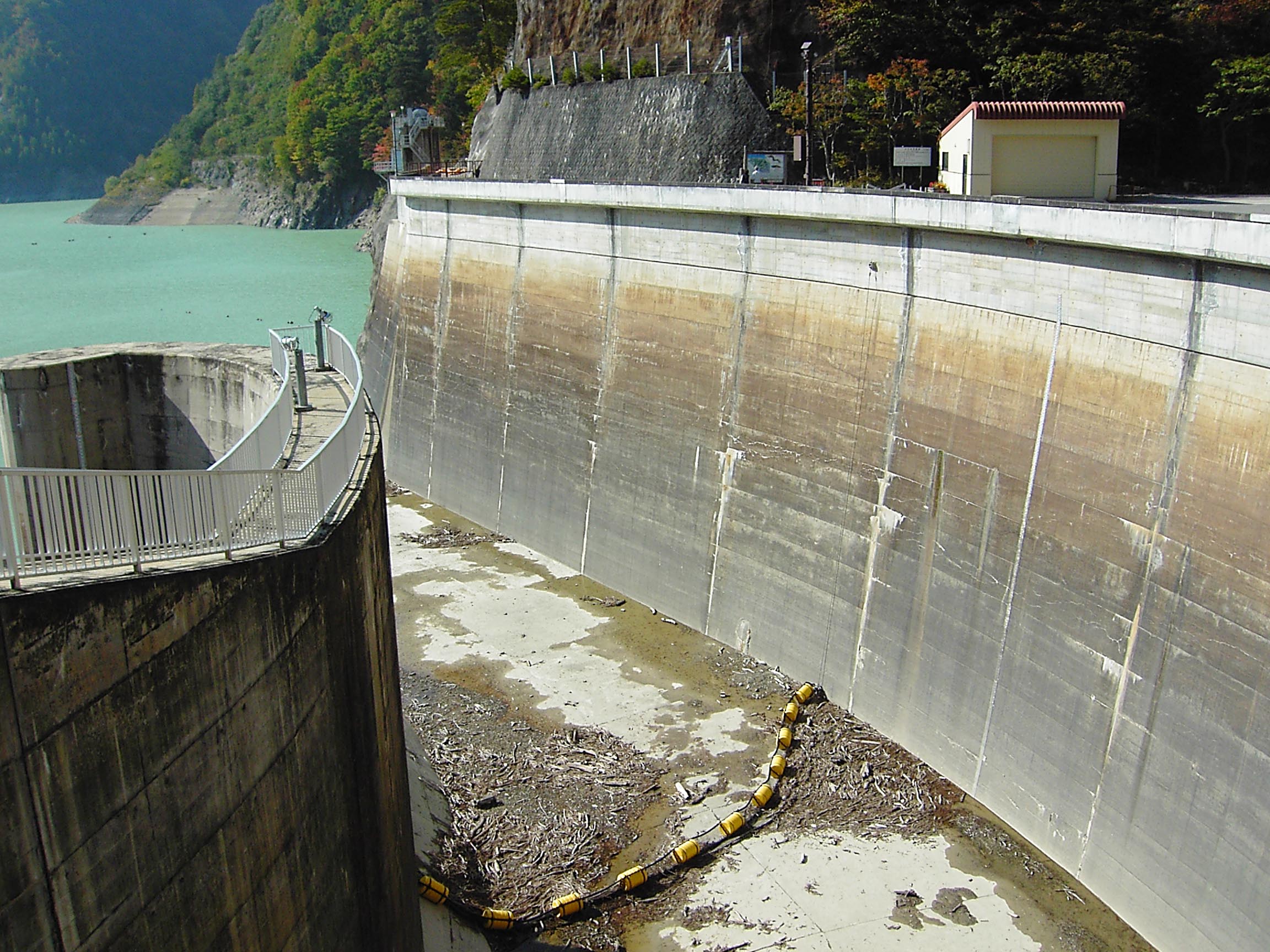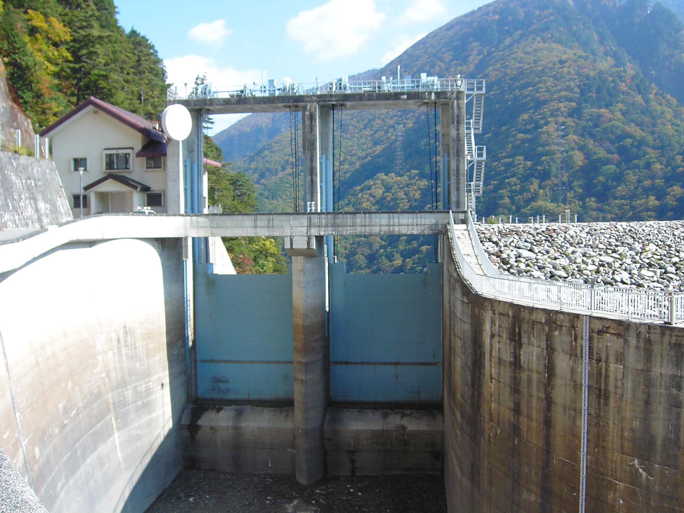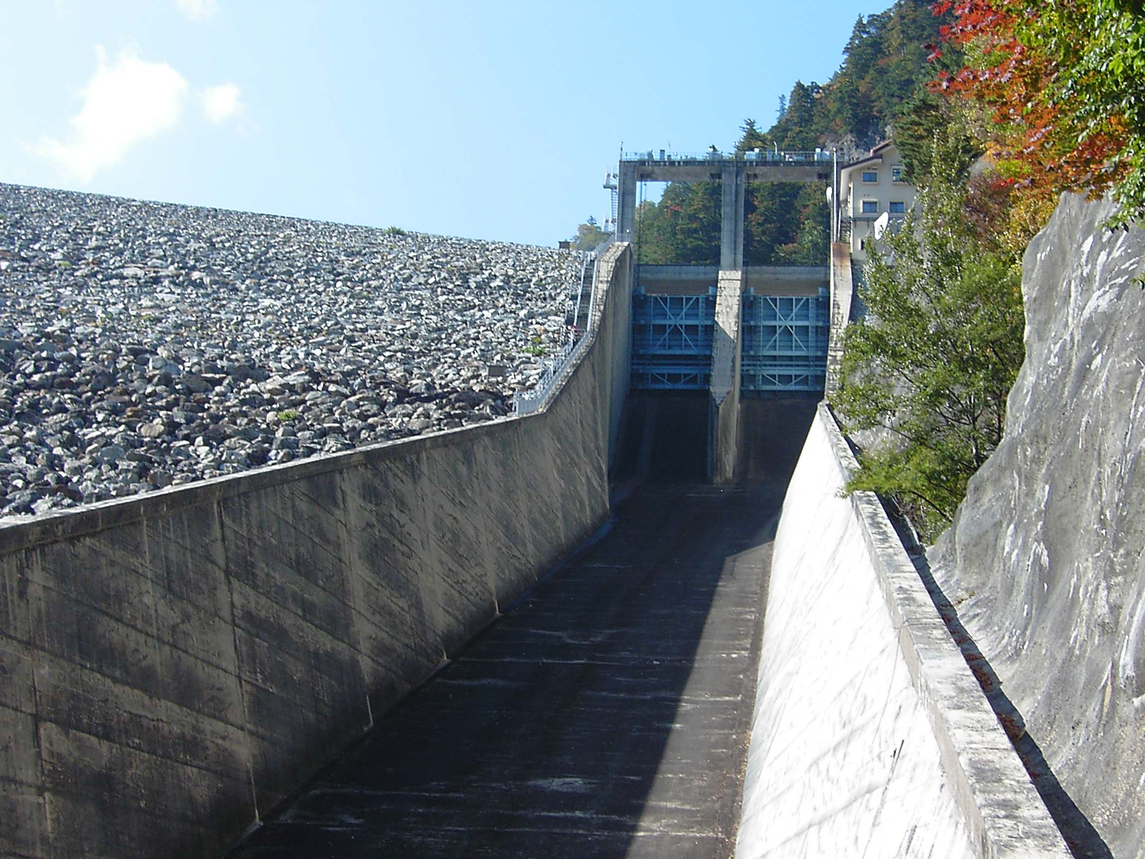 この七倉ダムには非常用洪水吐としてローラーゲートが2門ありますが、取水設備ははっきりとは確認できませんでした。