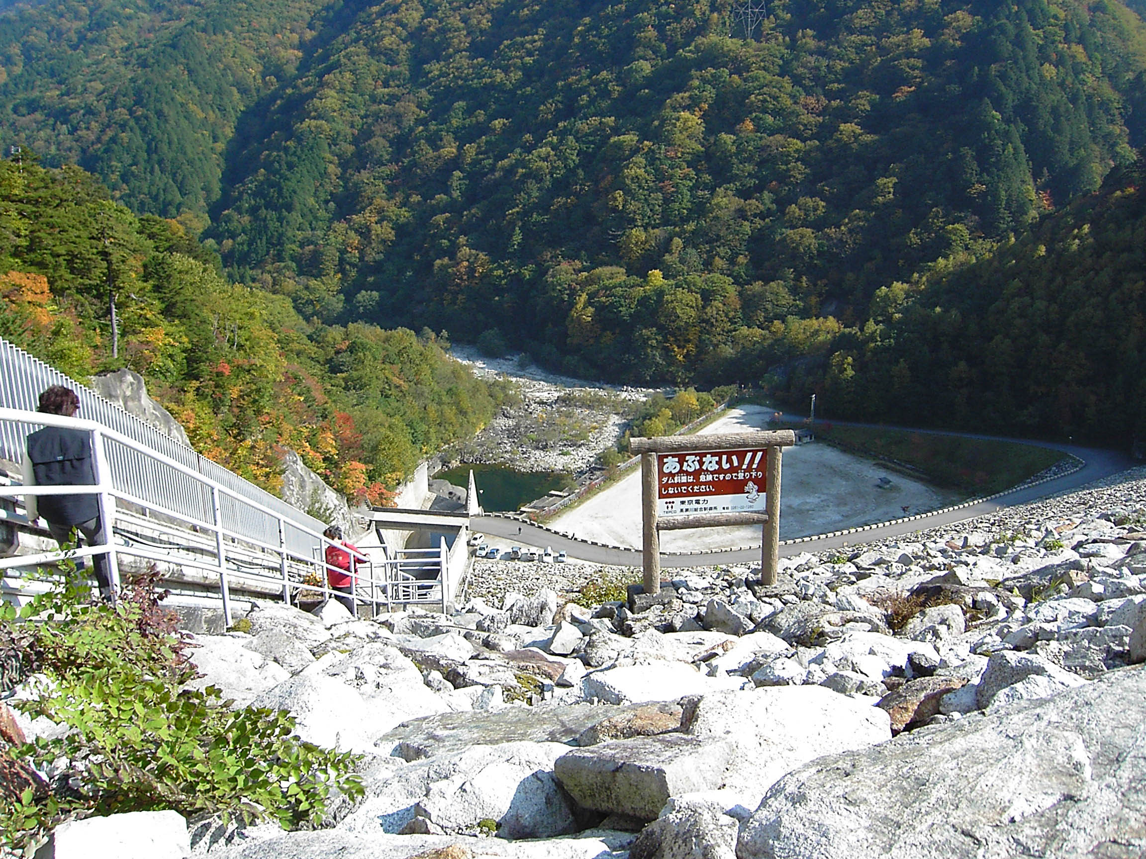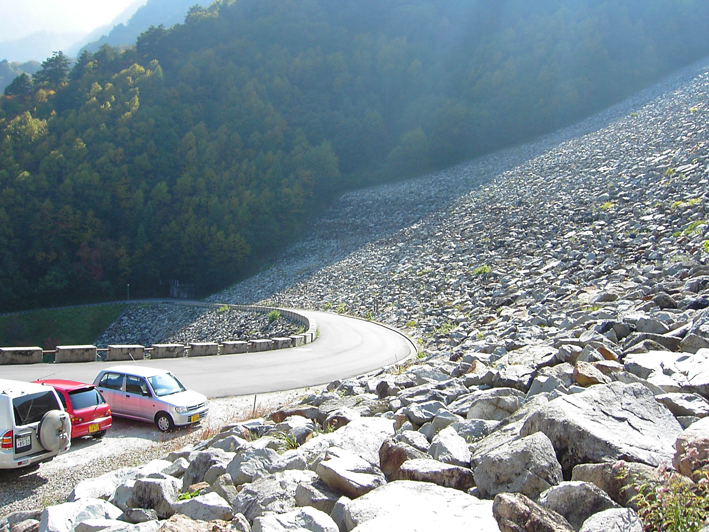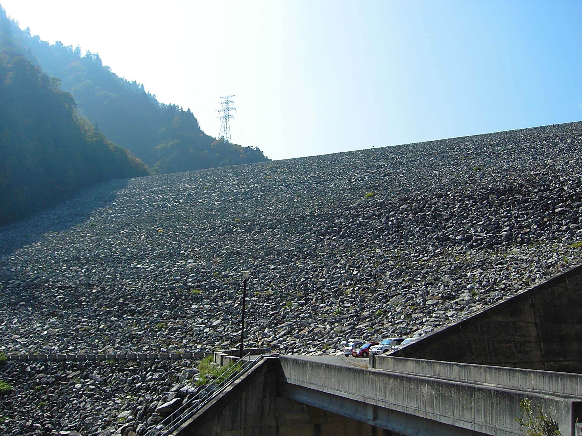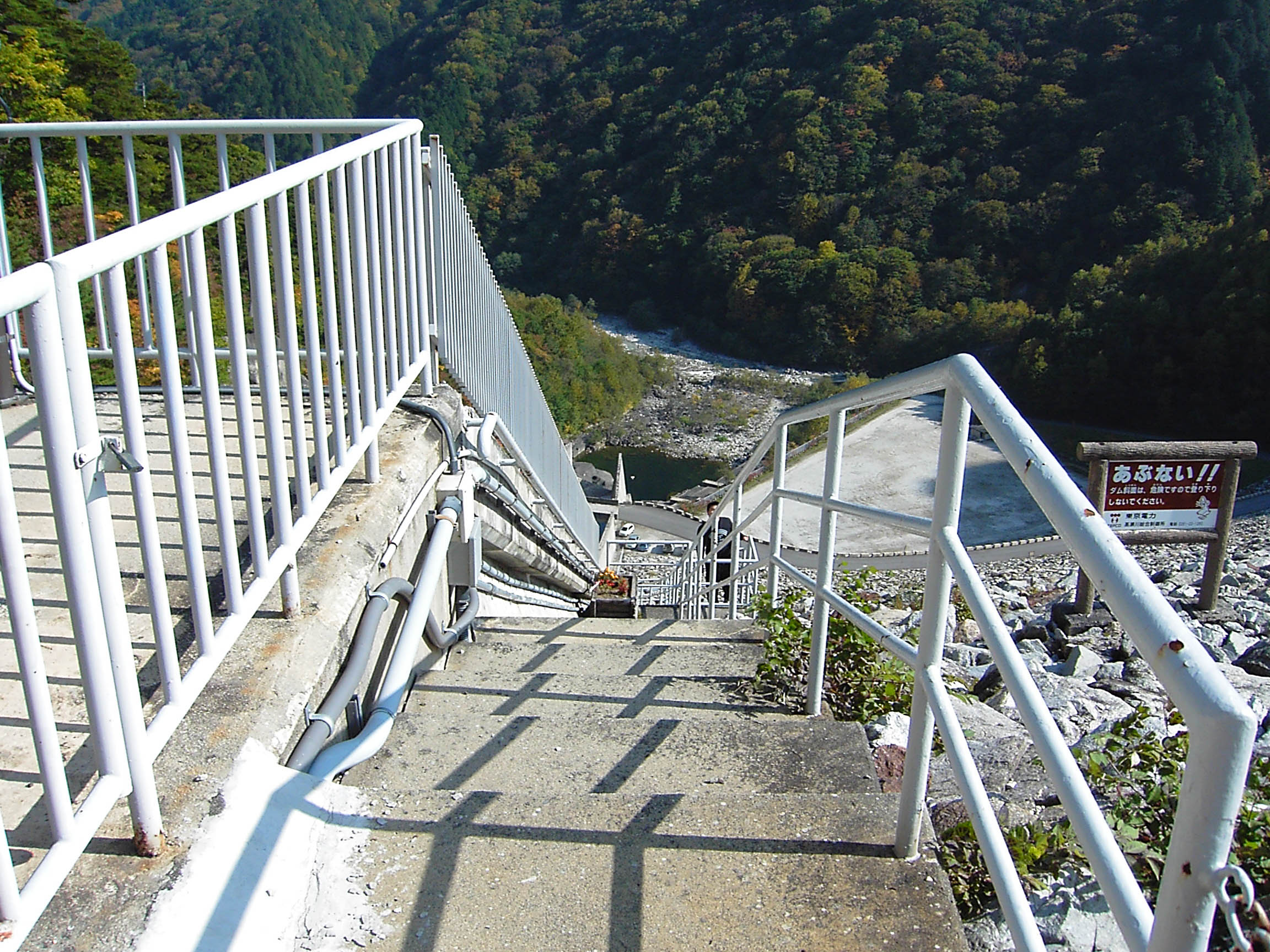 七倉ダムは、アクセスは容易ですが、堤体の下部に駐車場があり、天端に上がるには導流部そばの階段を登らないといけません。ところがこの階段を登るのはかなりの苦行ですので、あなたの体力が試されることになります。