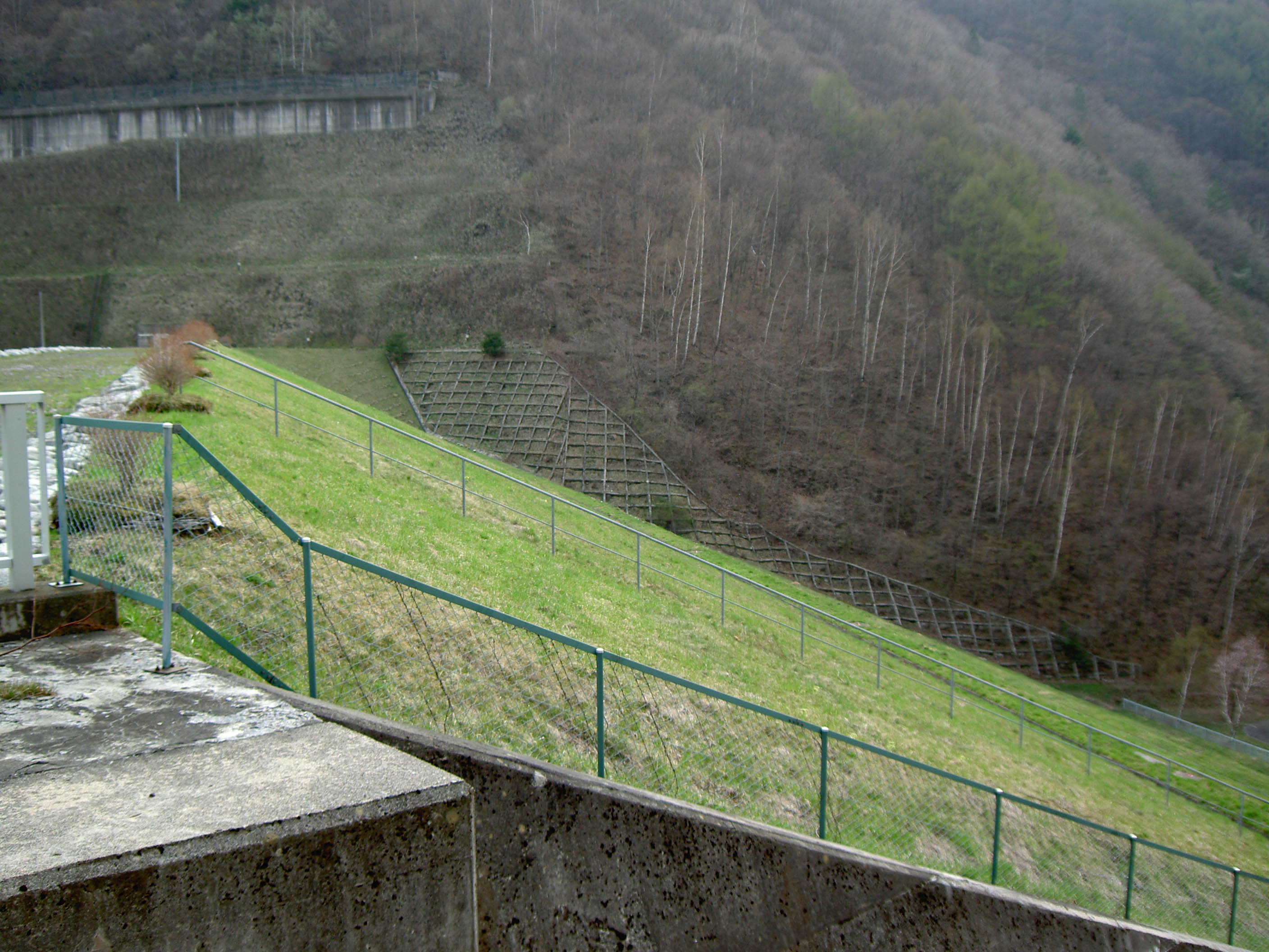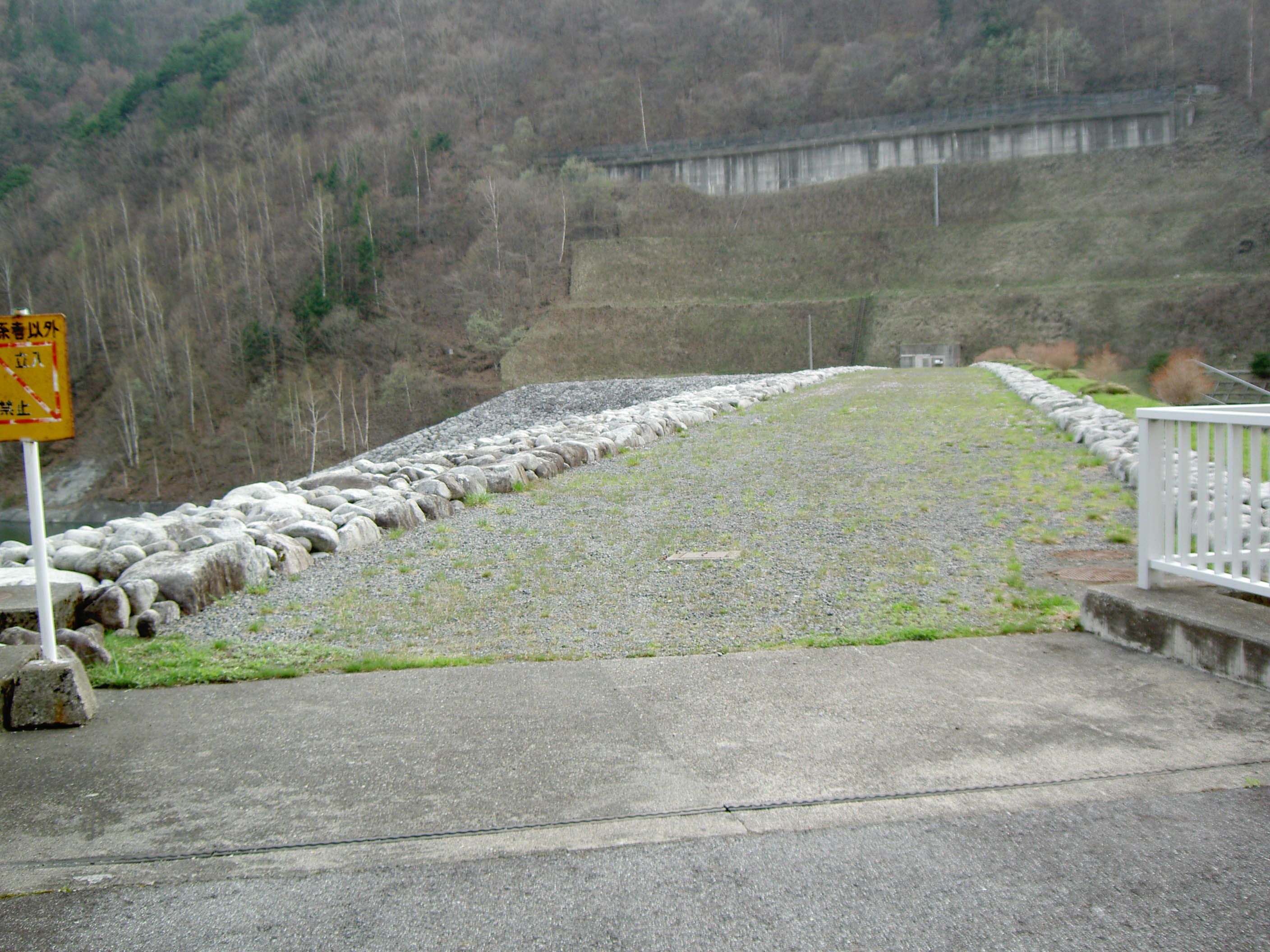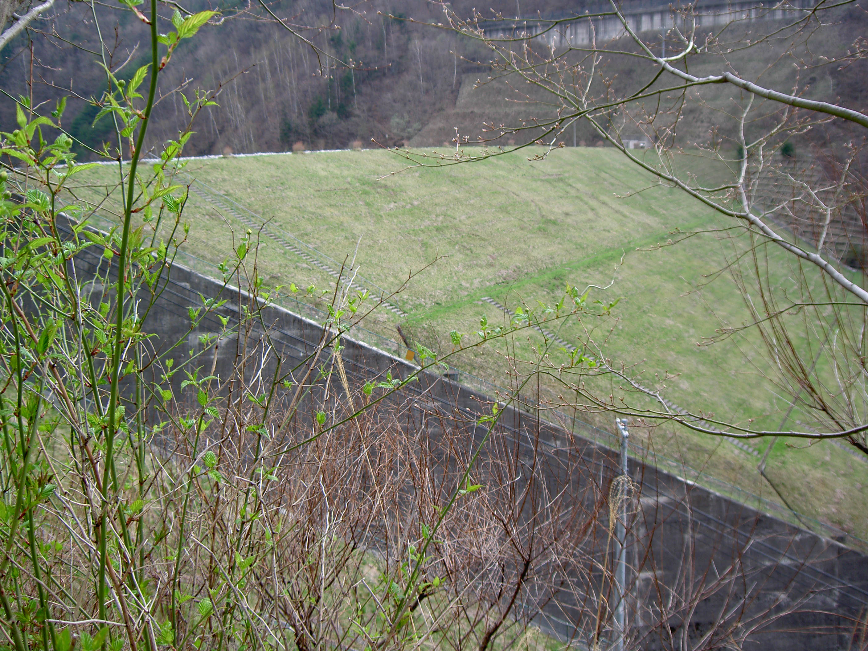 | 堤体下流側は草が生えロックフィルらしくあません |