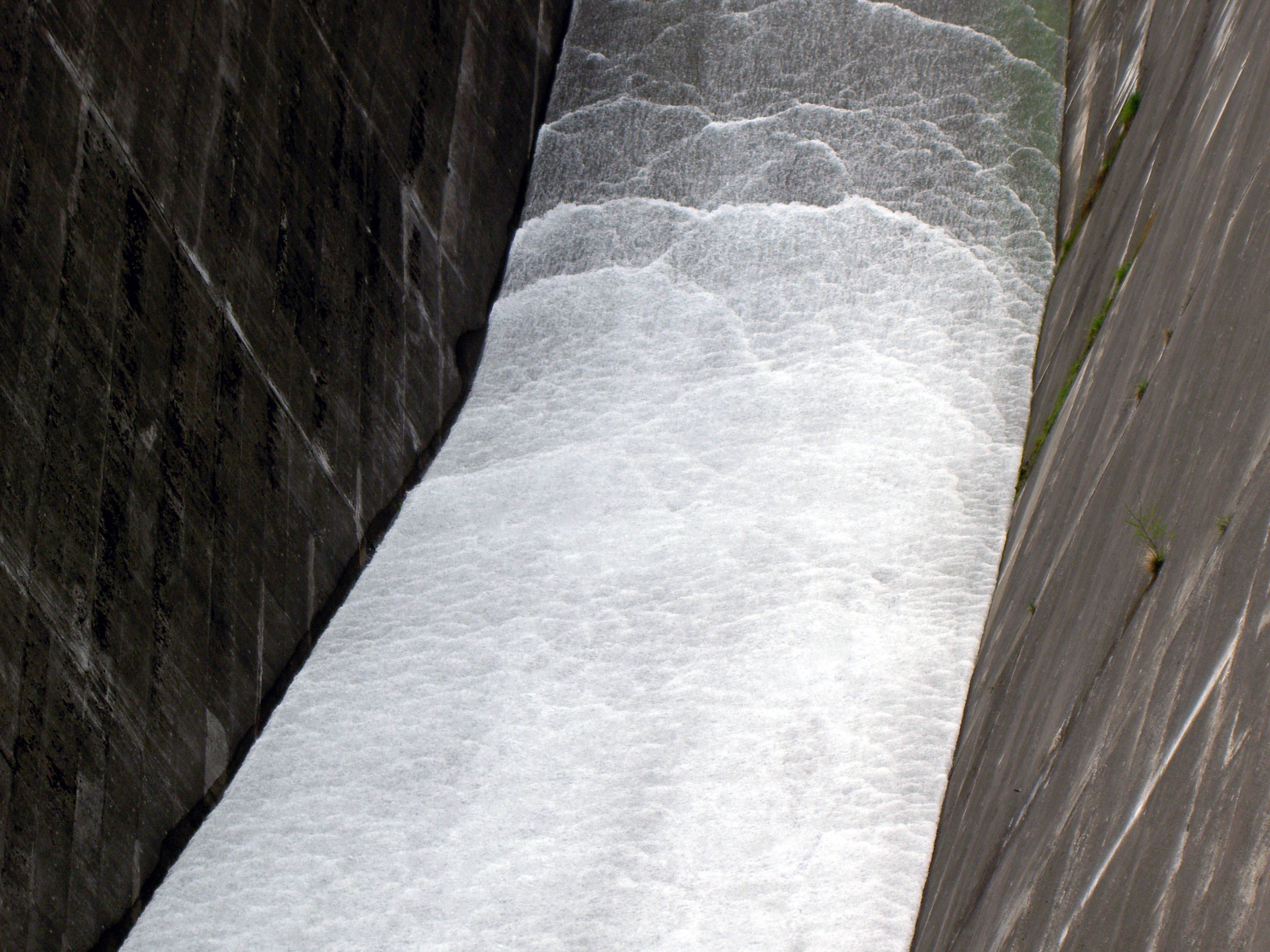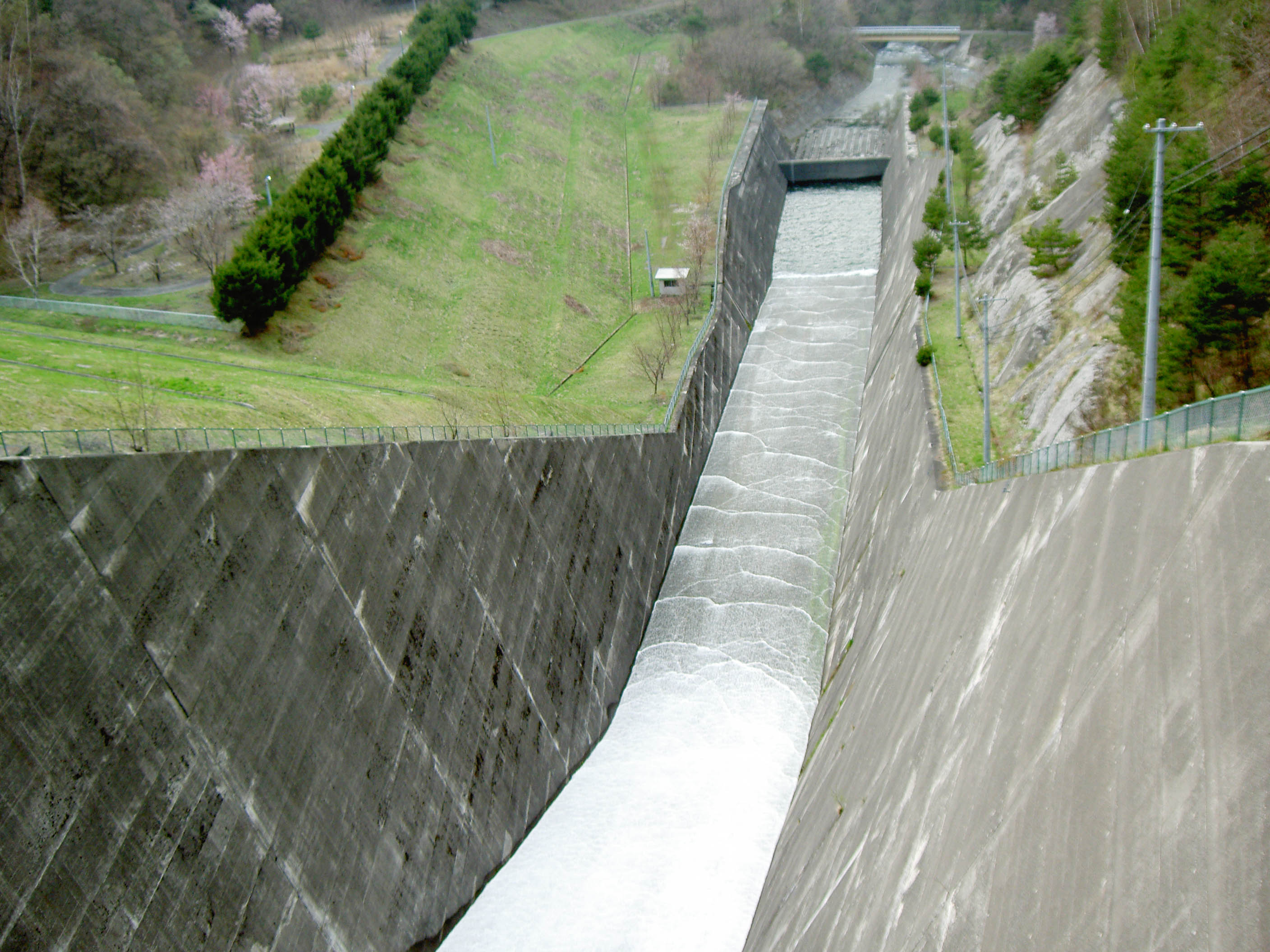 ここの洪水吐はちょっと変わっていて、自由越流式の非常用洪水吐があって、その下部にローラゲートを備えた常用洪水吐があるという複合構造になっています。