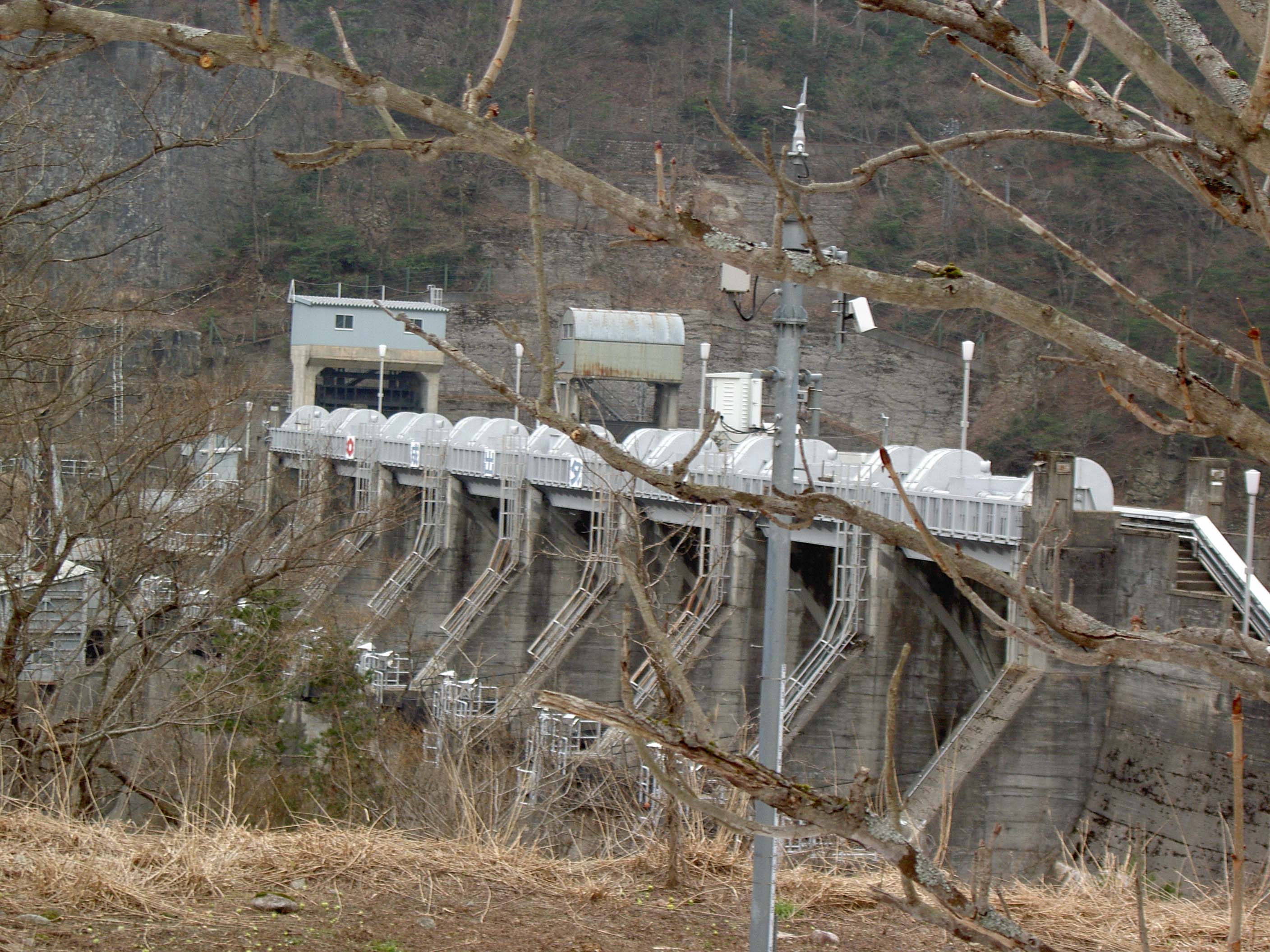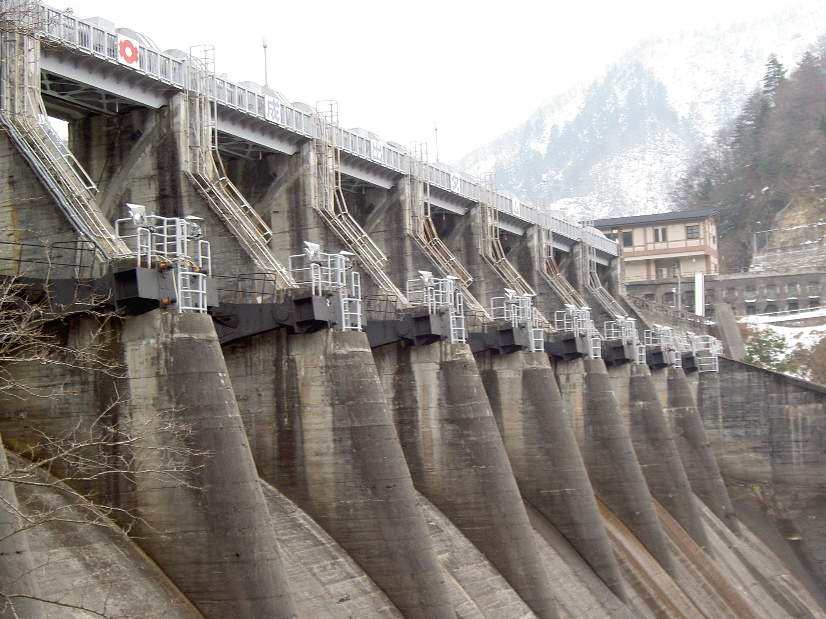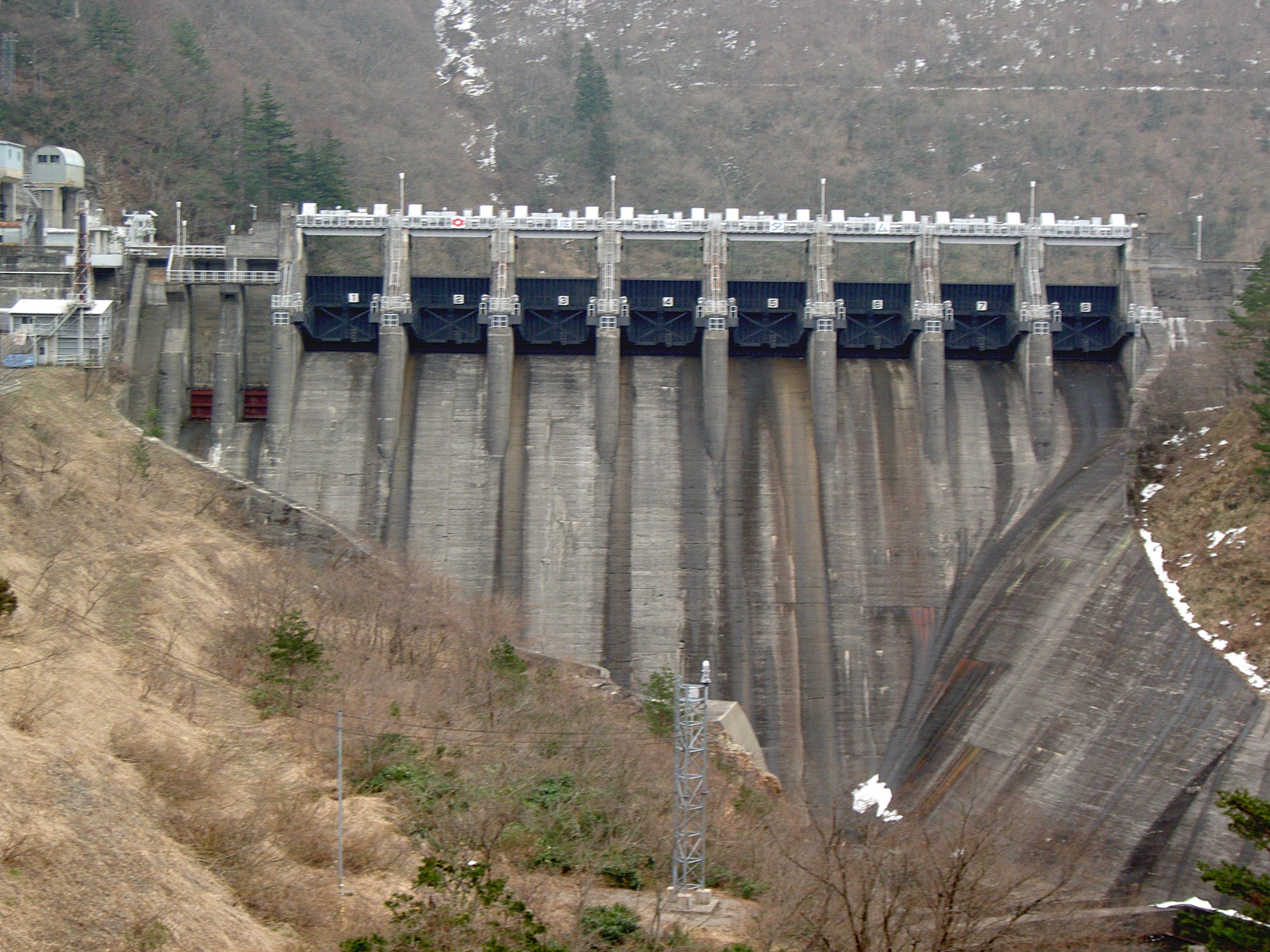 このダムも庄川流域の発電用ダム群のひとつで、例によって巨大なクレストゲートをずらりと8門も並べています。