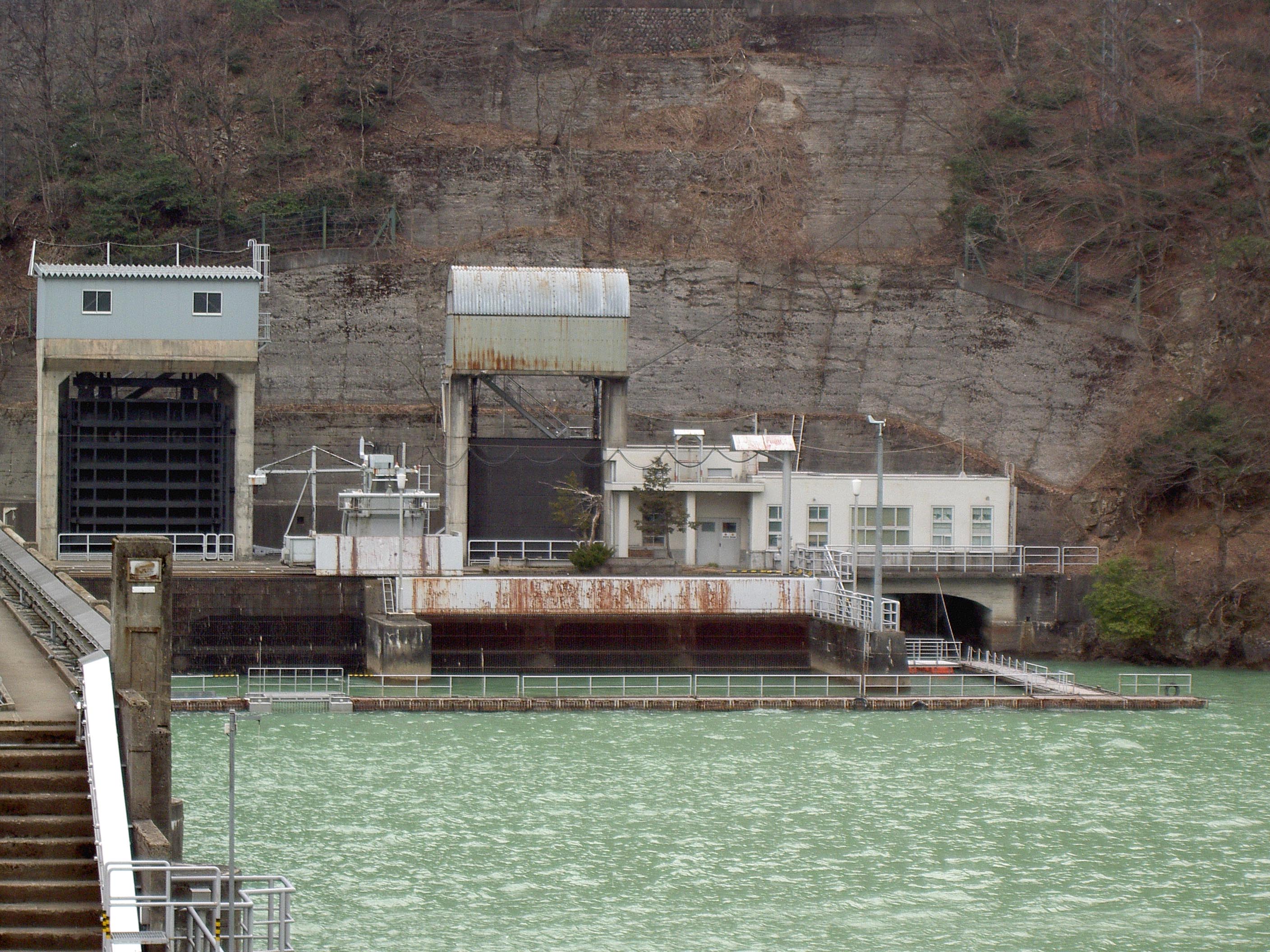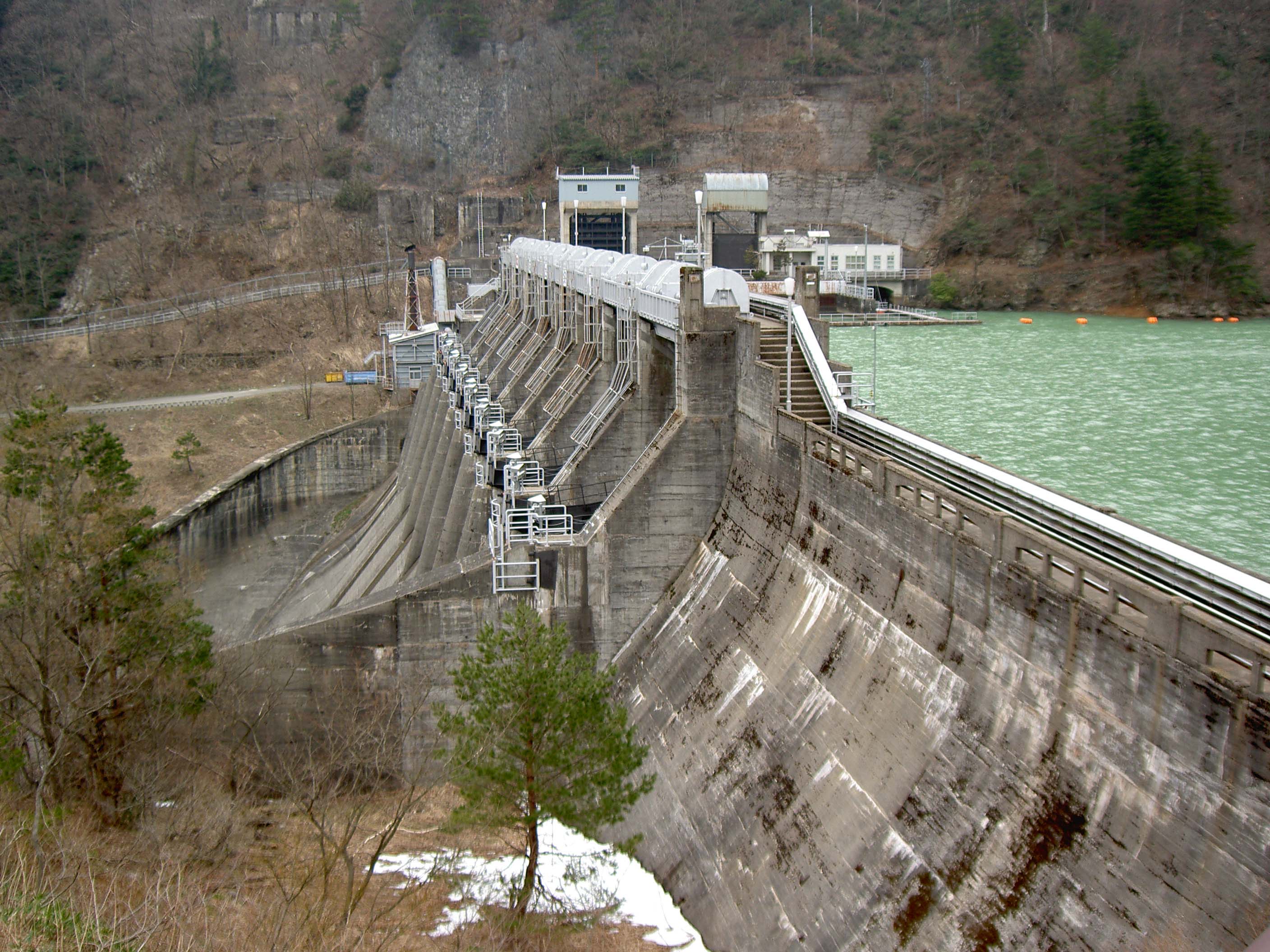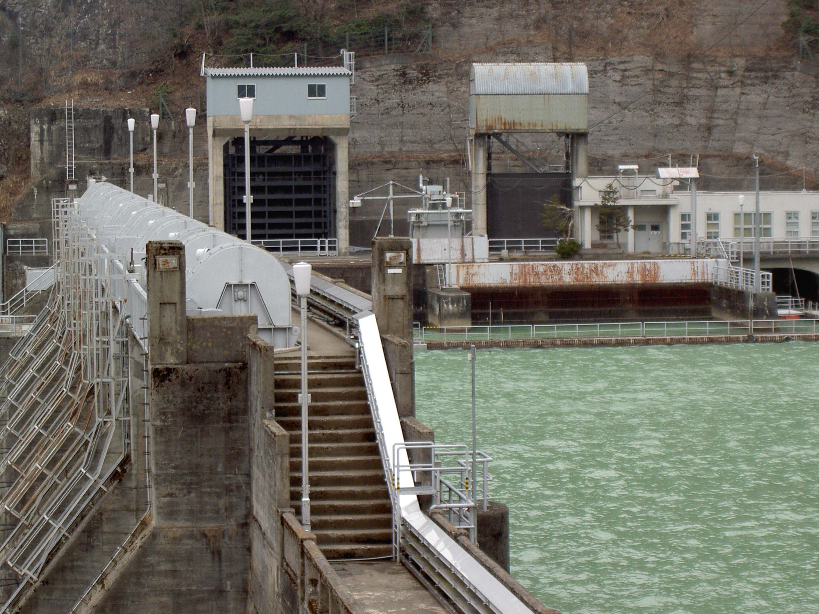 このダムも庄川流域の発電用ダム群のひとつで、例によって巨大なクレストゲートをずらりと8門も並べています。