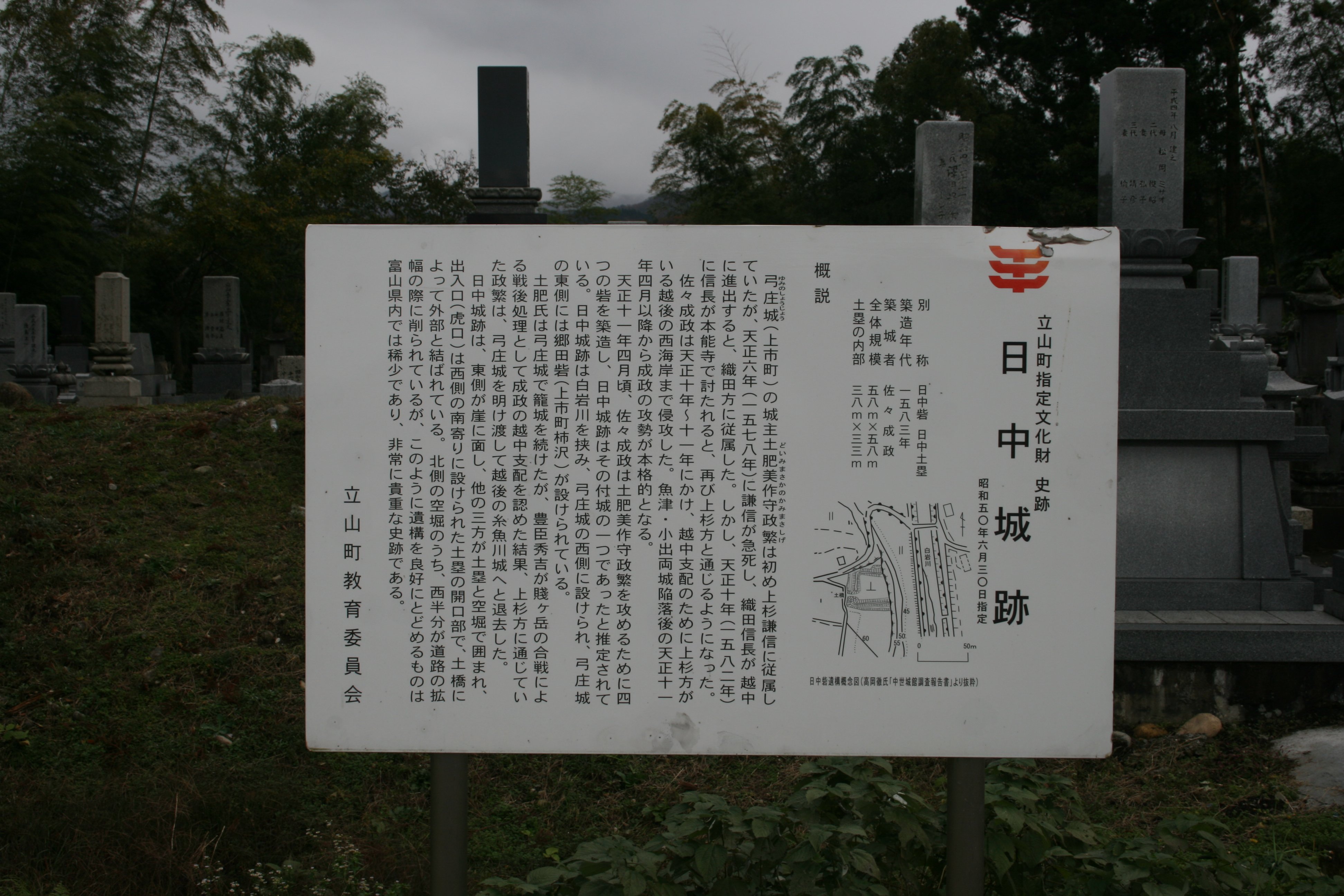 佐々成政は天正10年〜11年(1583年)にかけ、越中へ再侵攻して魚津城、小出城を陥落させています。さらに同年4月以降からは佐々勢の攻勢が本格的となり、佐々成政は土肥美作守政繁を攻めるために弓庄城の周りに4つの砦を築造して、弓庄城を包囲しています。この日中城跡はその付城の1つであったと推定されています。