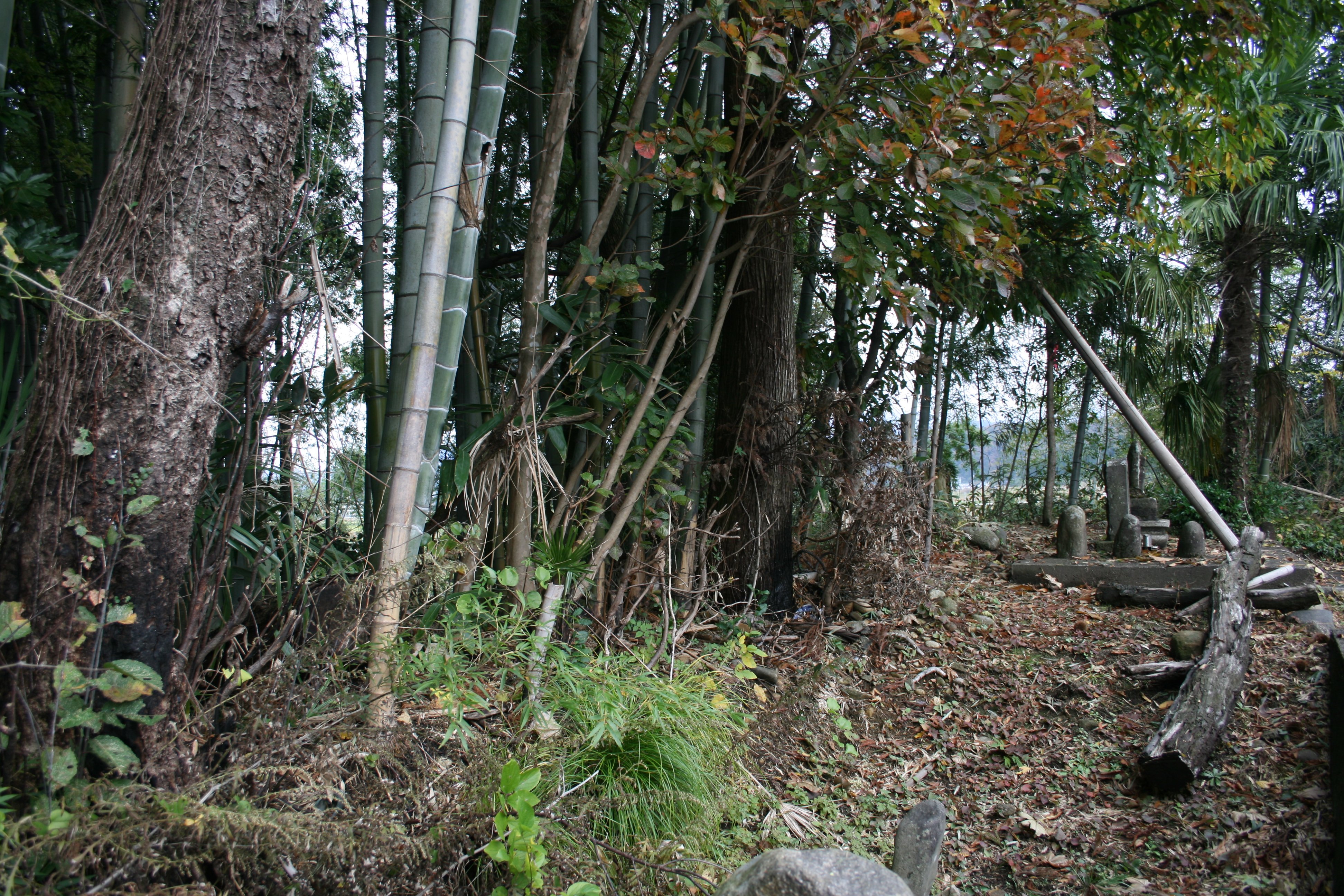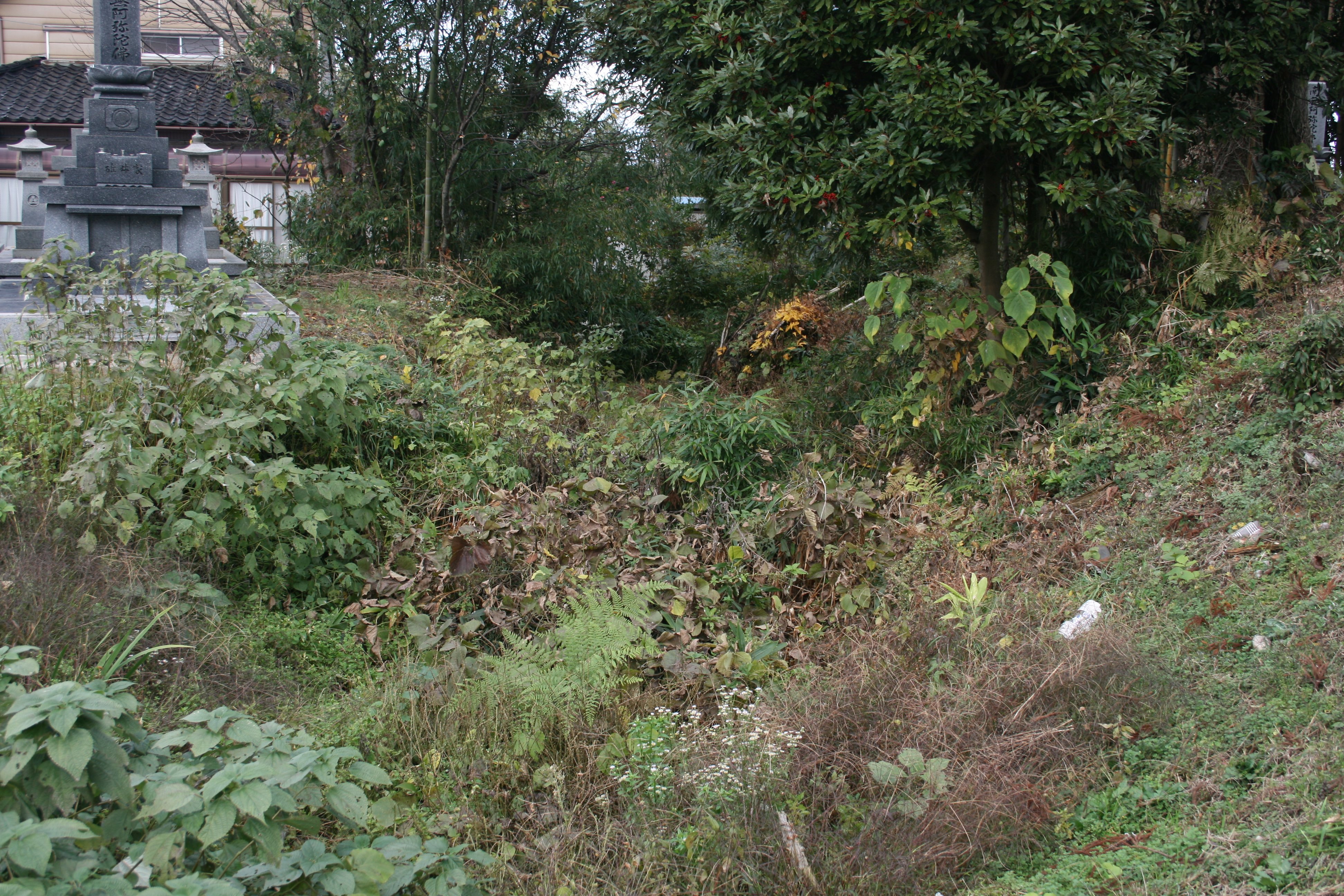 現在の日中城は、土塁と空堀と断崖に囲まれた郭と土橋が遺構としてよく残っていますが、困った事に郭の中が墓地となっているのが難点です。何でこんなところを墓地にしたのか・・・。