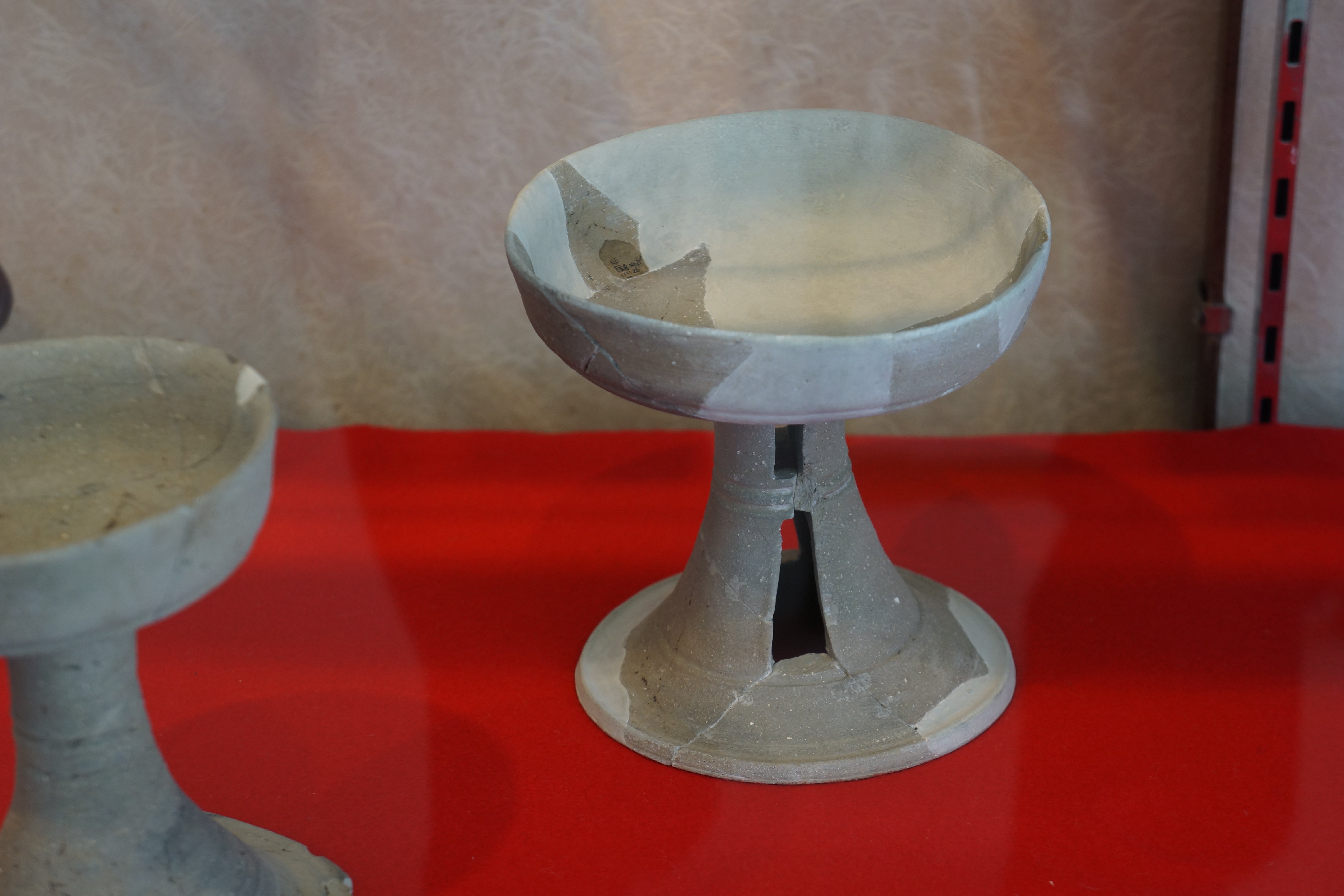 古墳の周りを廻る周溝は、幅1.2~2.4m、深さ0.2~0.4mで、葬儀で供えた甕・高杯などの須恵器を割り、周溝に廃棄した状態で見つかりました。