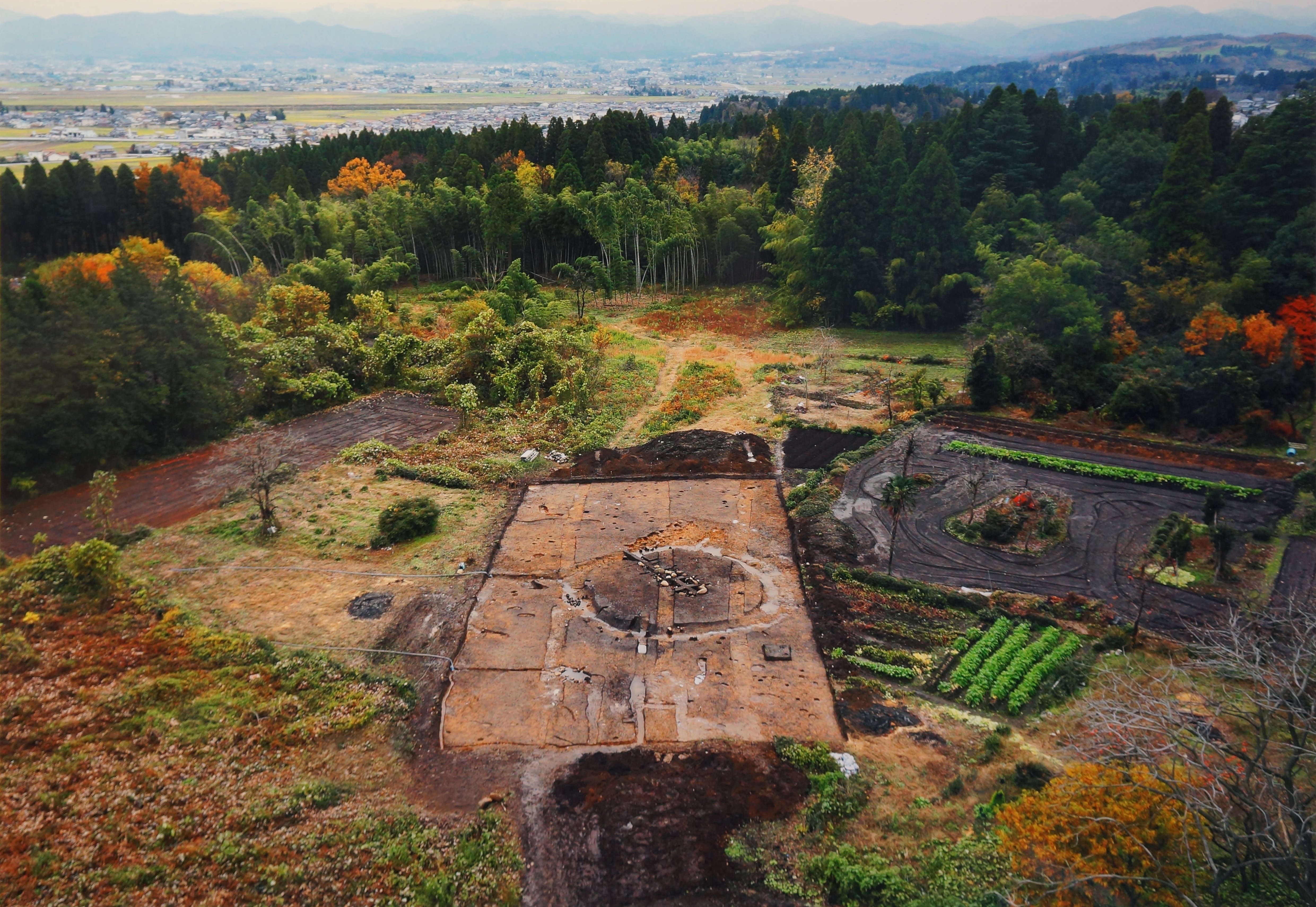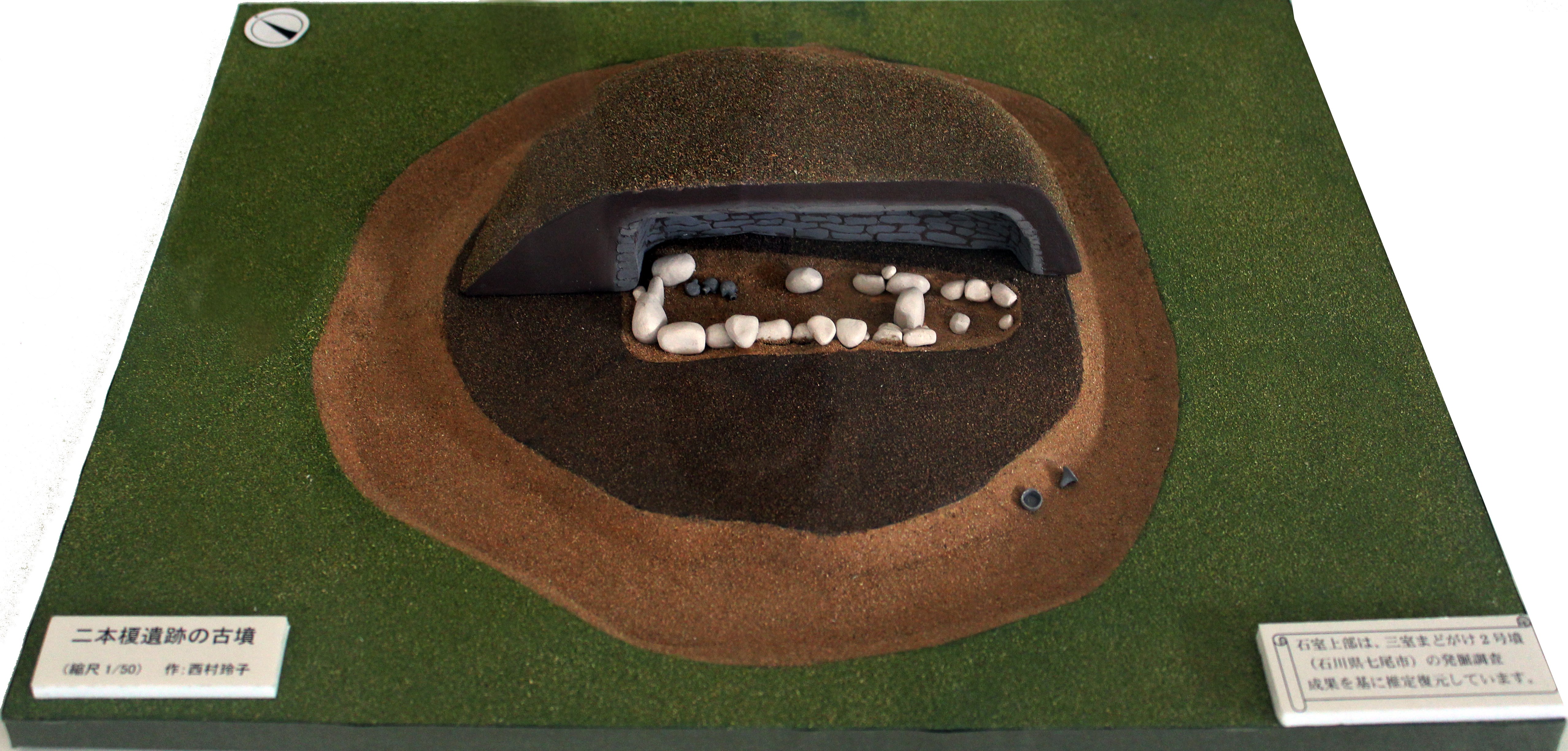二本榎遺跡は、富山県富山市婦中町小長沢地内に存在する古墳遺跡です。当遺跡は、呉羽丘陵の南西部、標高59~61mに位置しています。 周溝と横穴式石室が検出され、周溝を含めた全貌が分かる横穴式石室古墳としては県内で初めて発掘調査が実施されました。