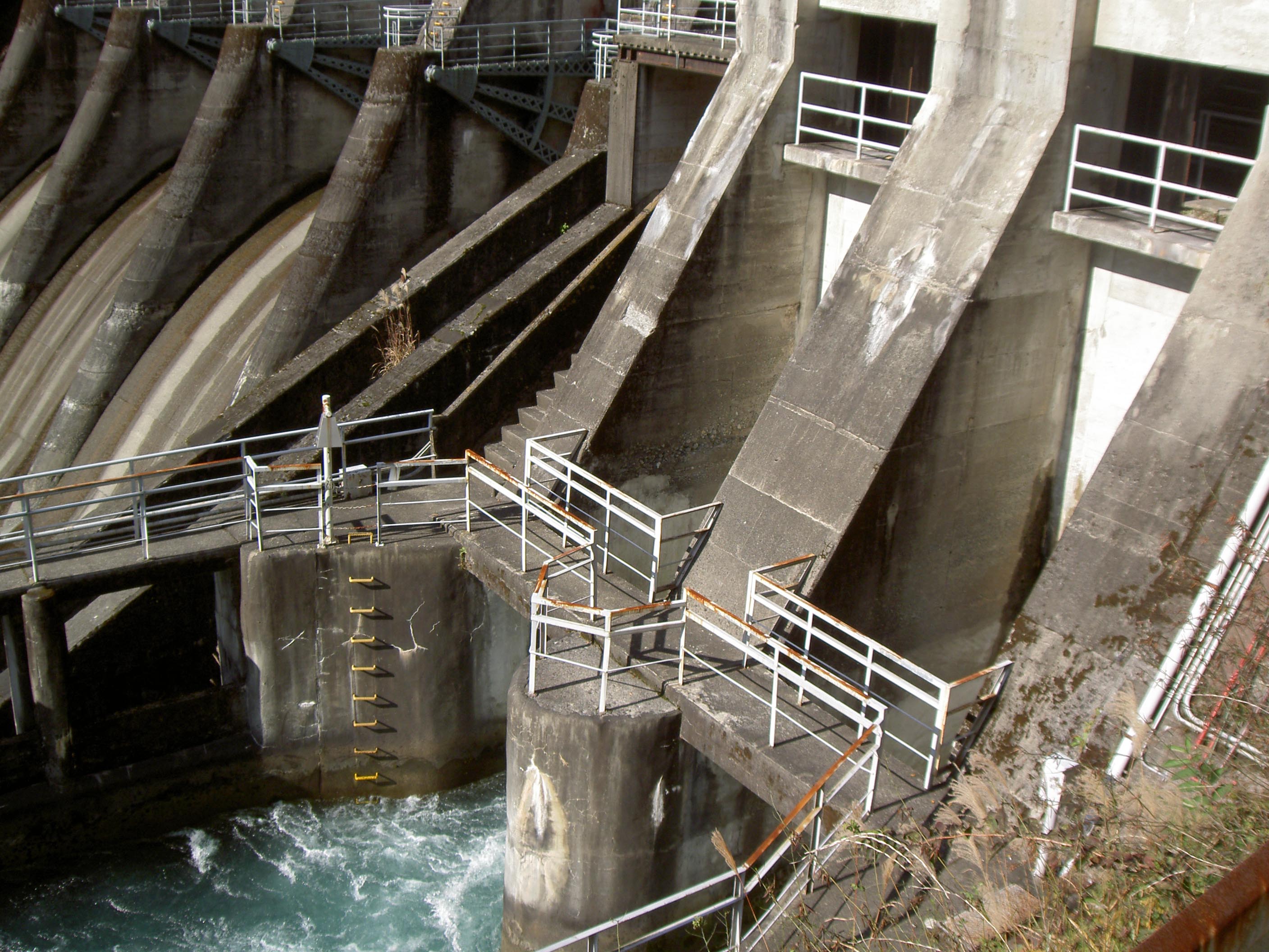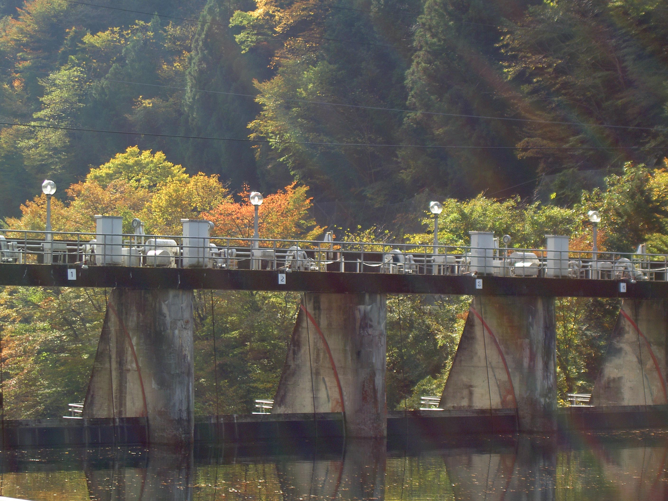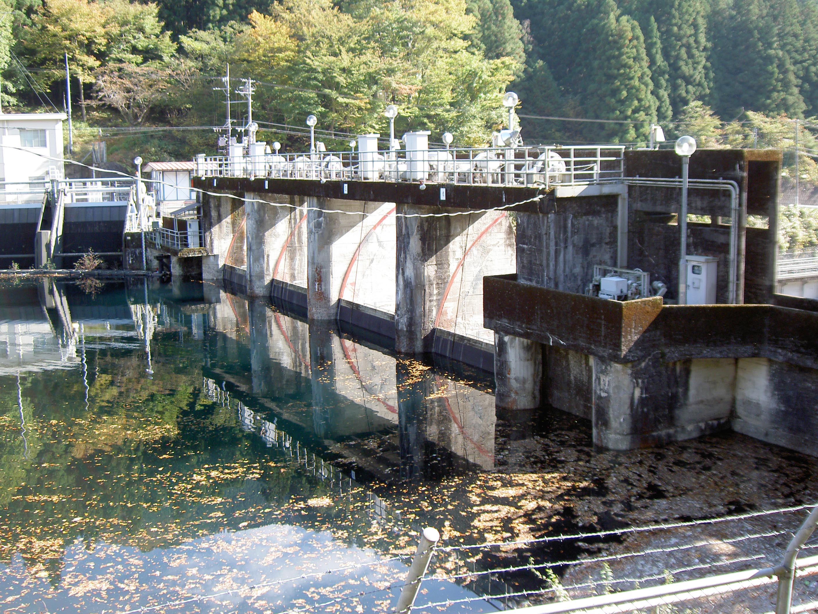 クレストにはラジアルゲートが4門あります。また左岸側には発電所に送水するためのゲートがありますが、この程度の規模のダムには珍しく水圧鉄管ではなく開放された水路になっていました。
