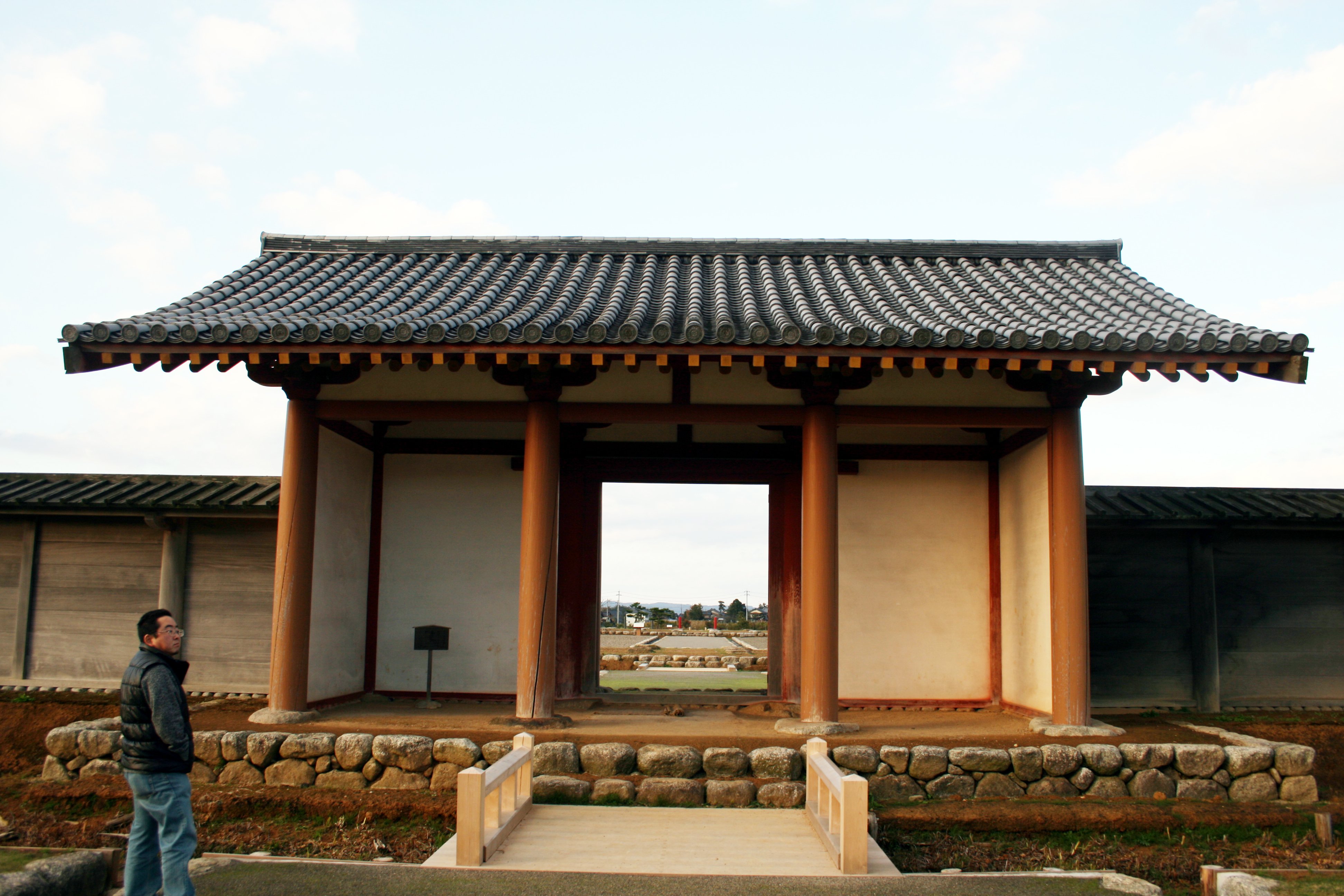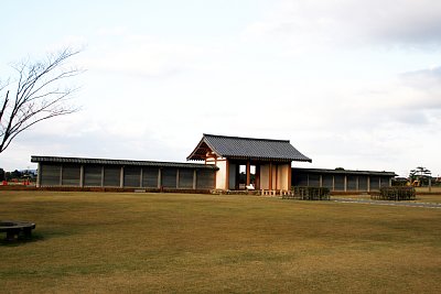 北門側から見た復原南門と講堂跡 |