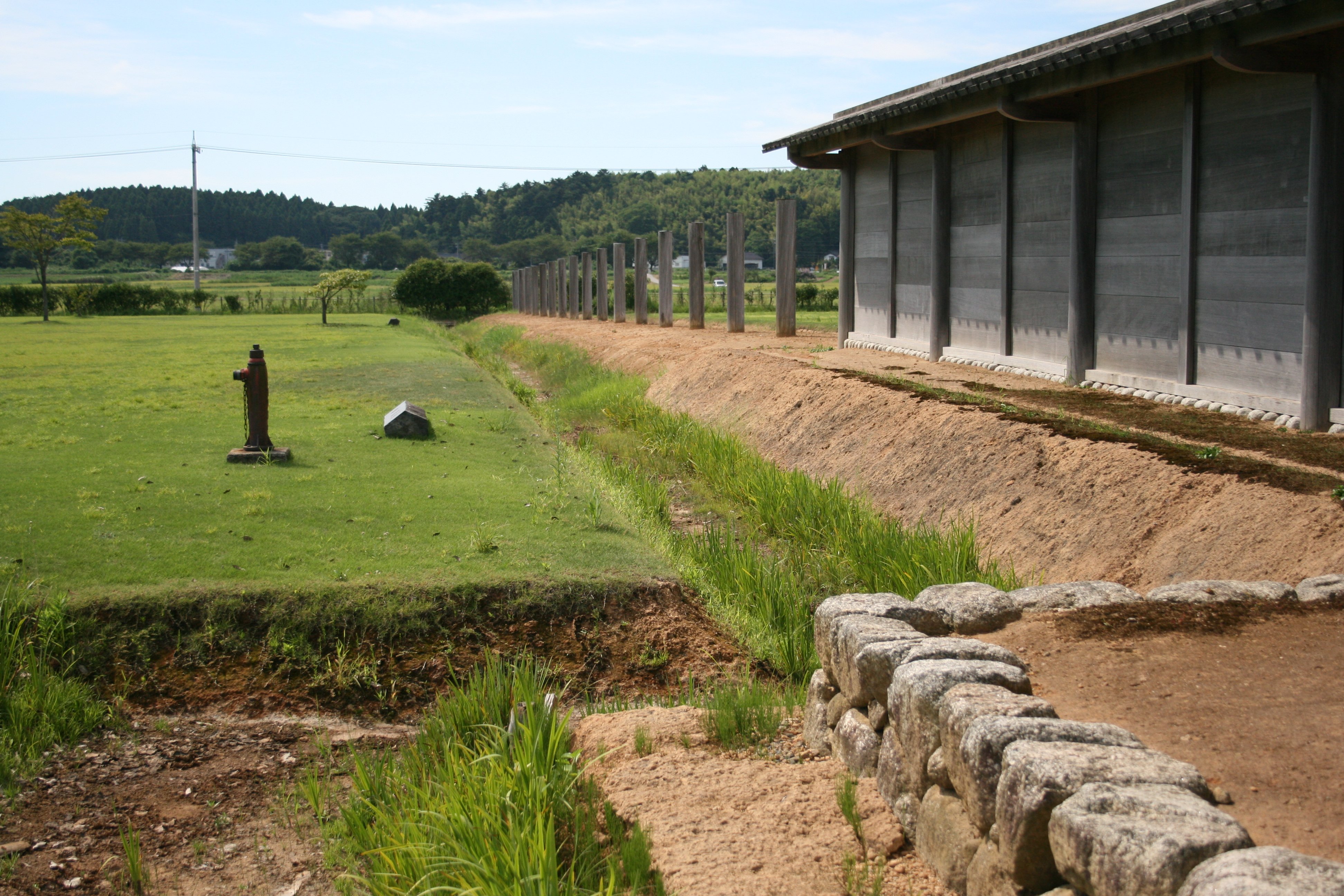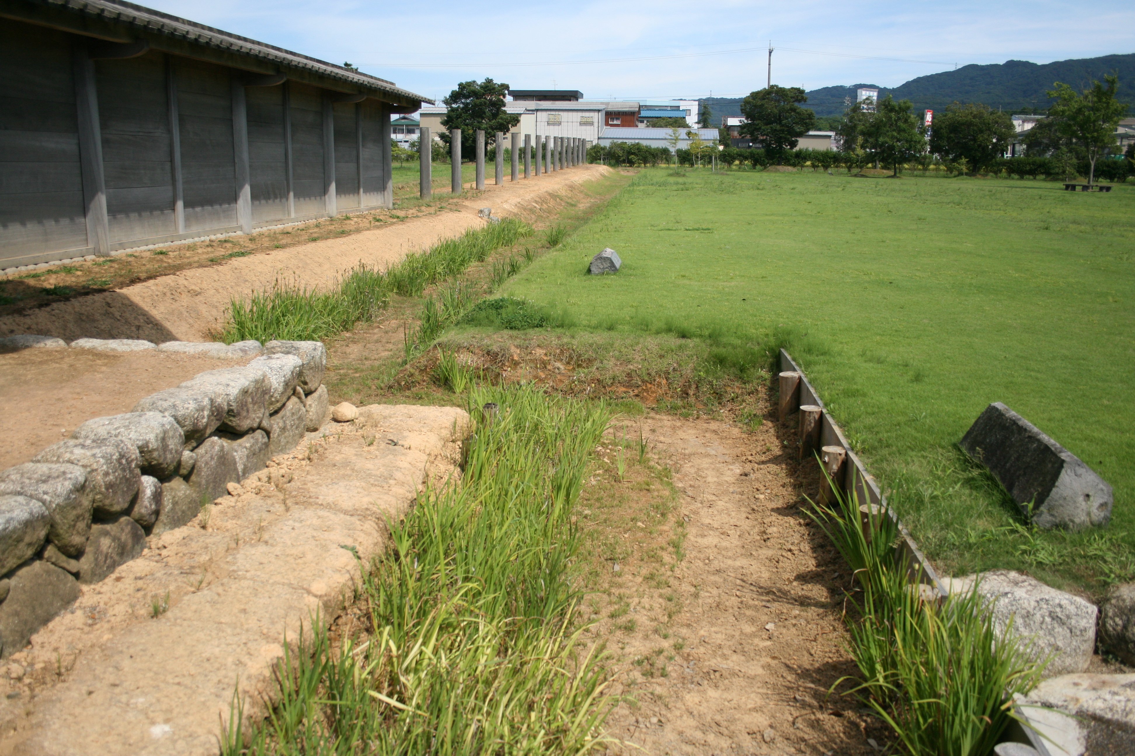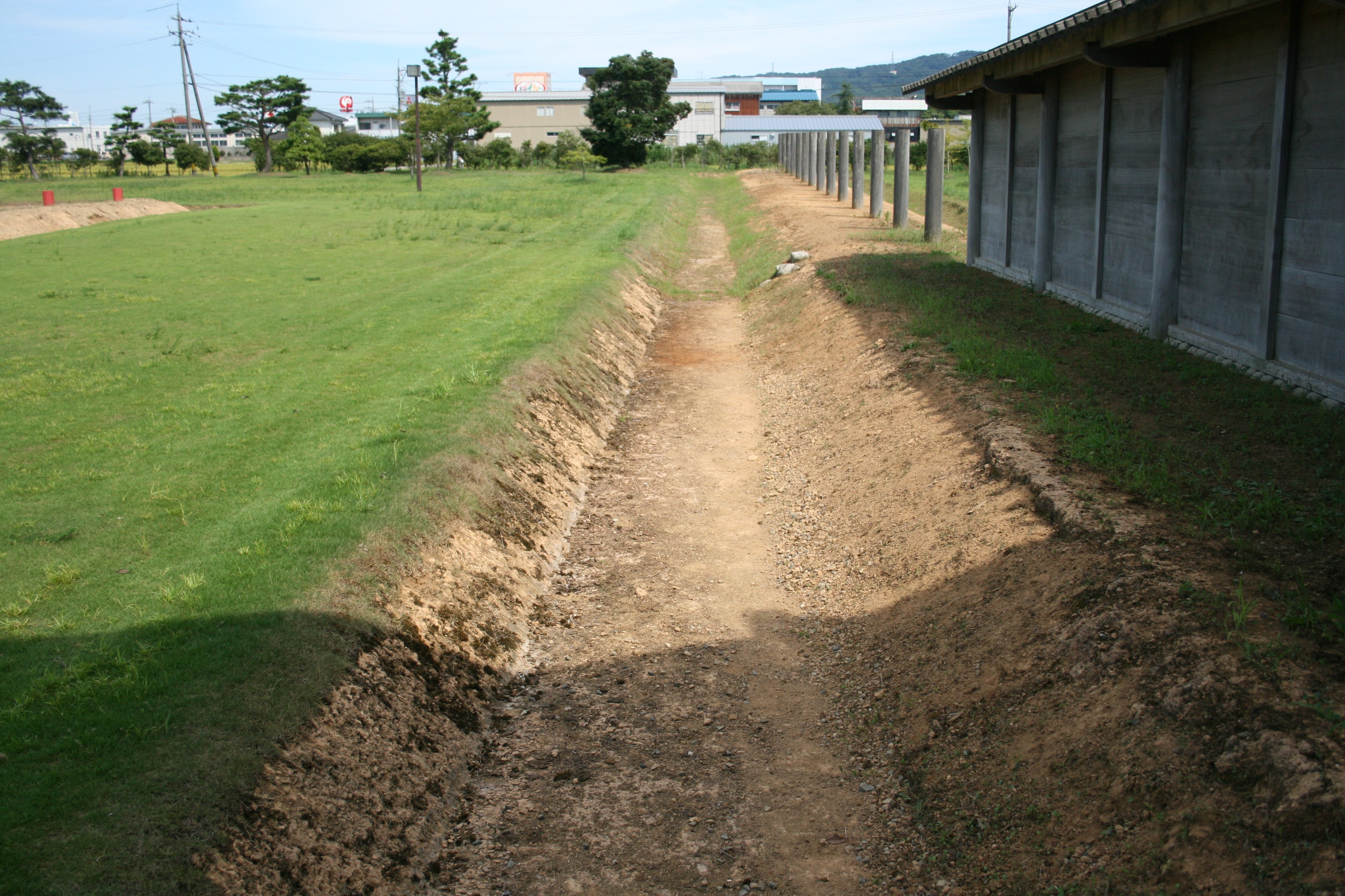 南西側の復原塀と溝跡 |