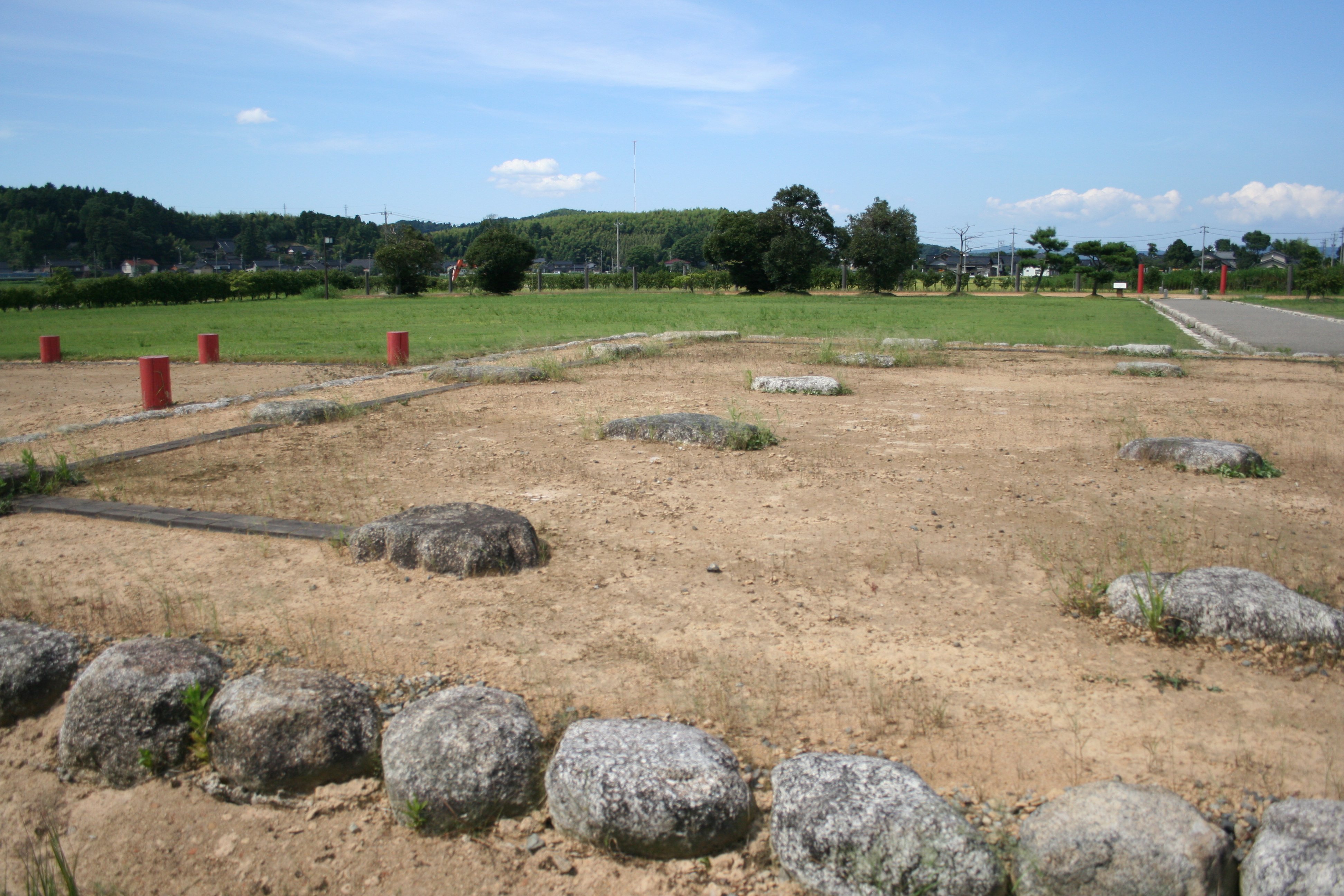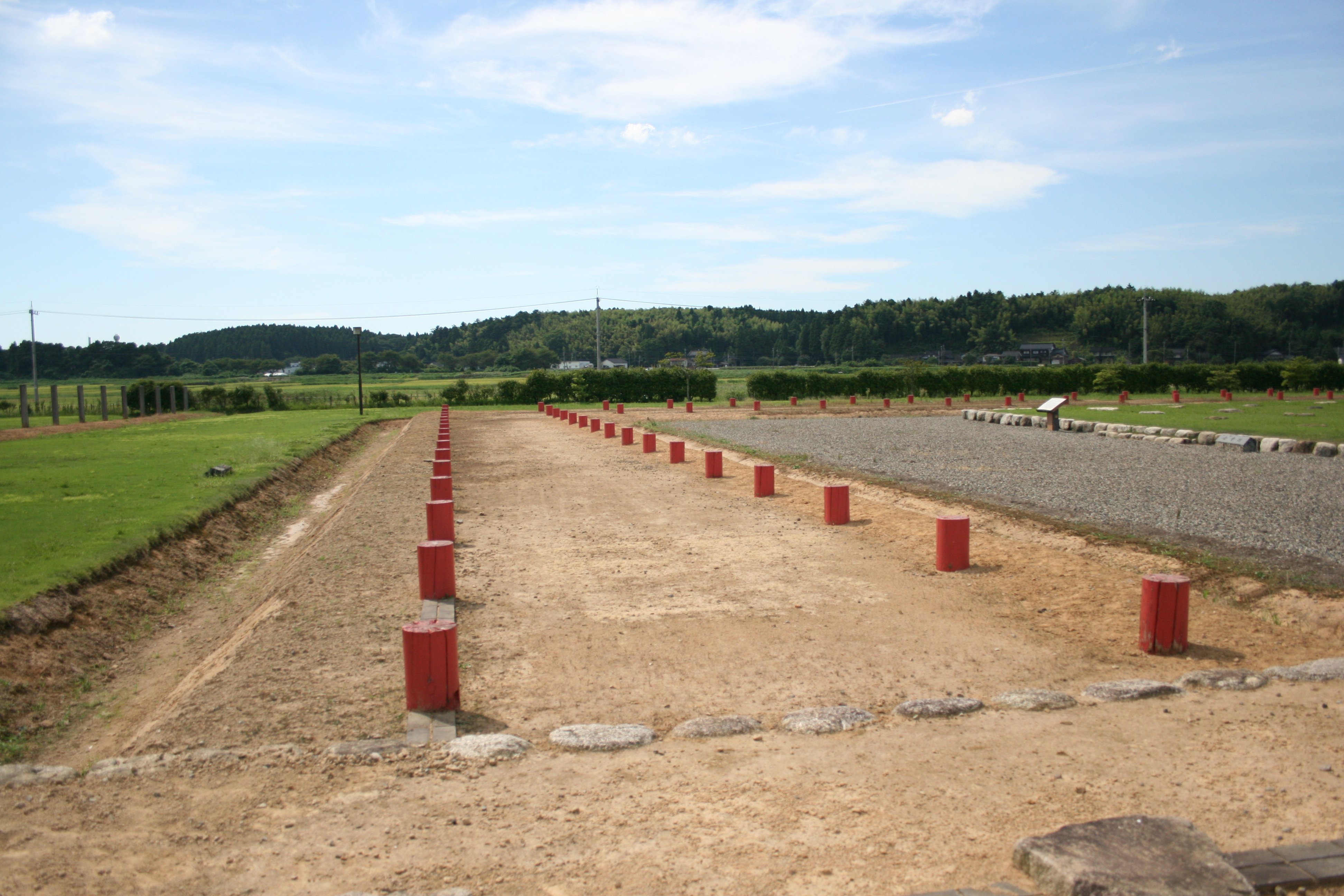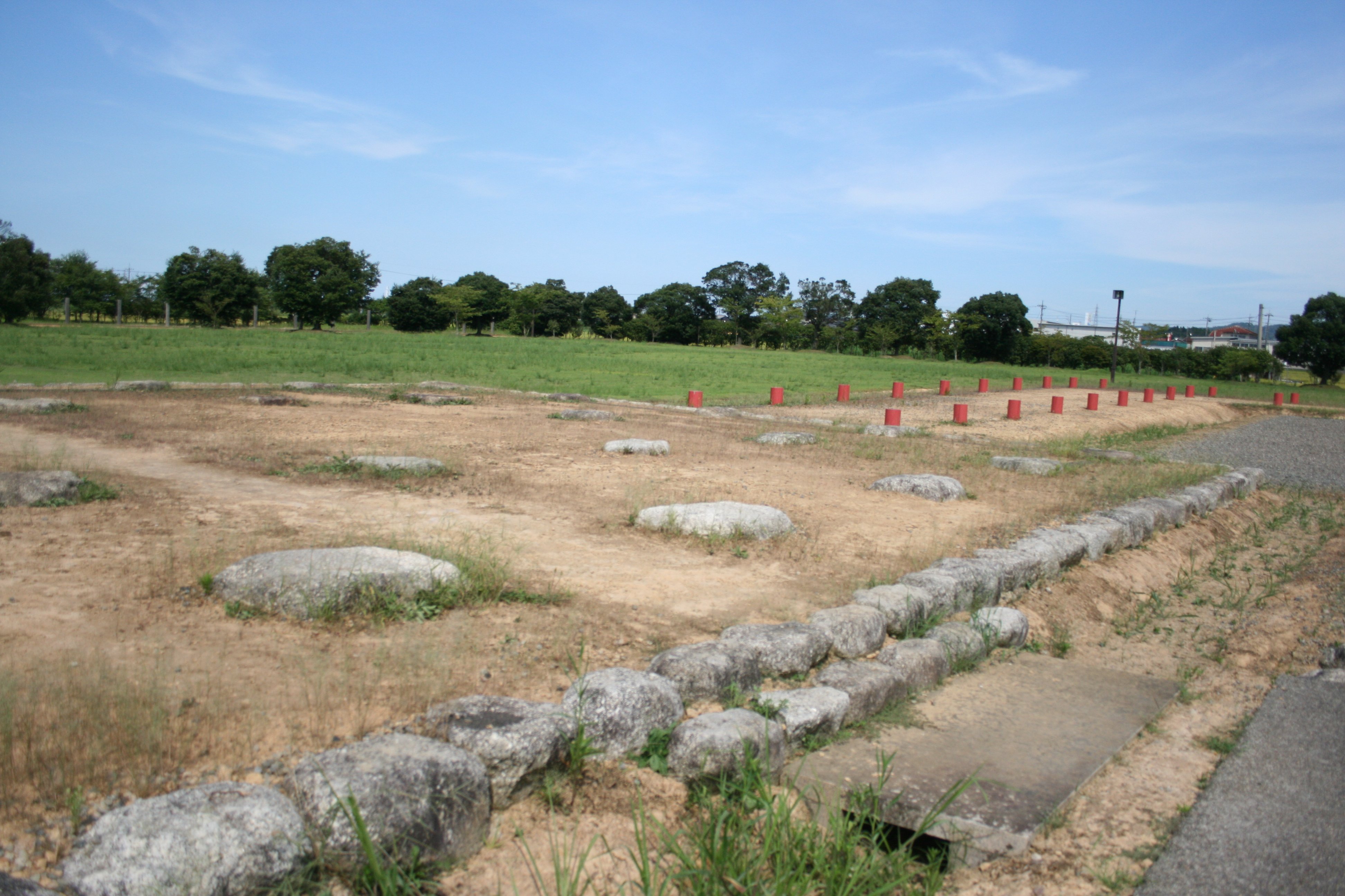 | 北門跡から見た南門及び塀の様子 |