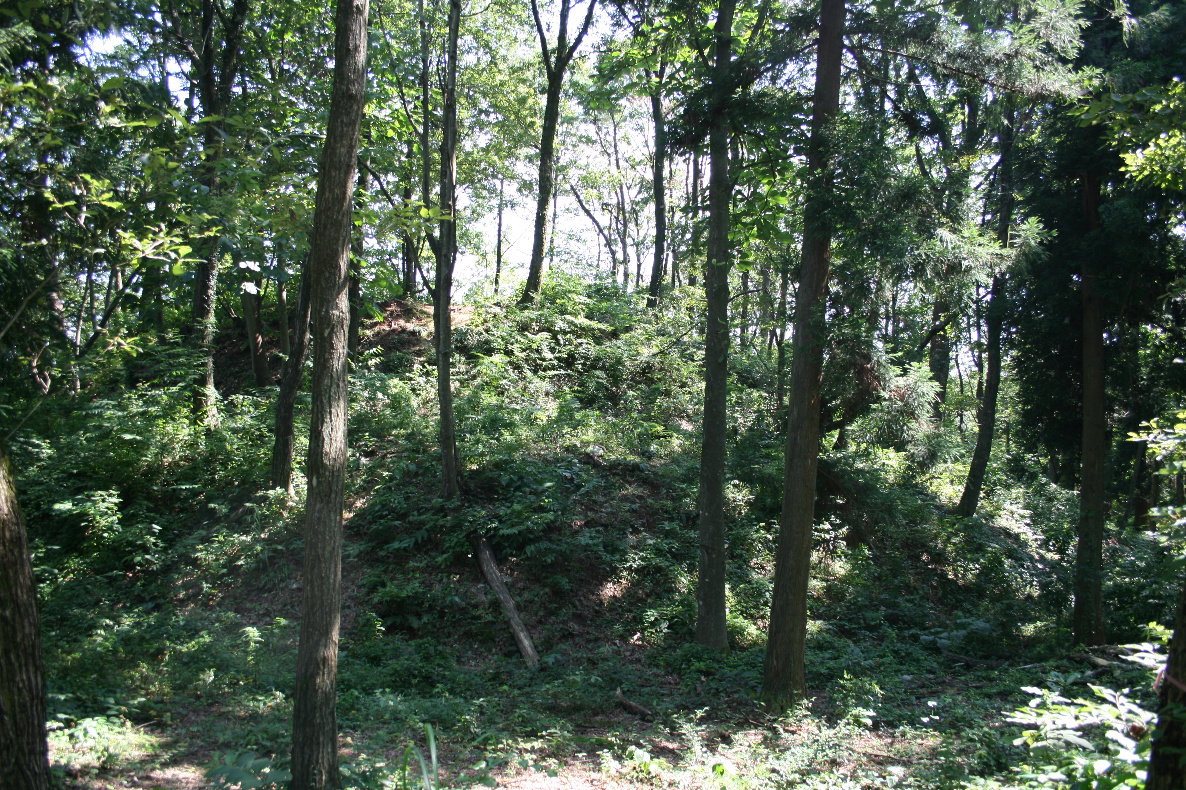 六治古塚墳墓も四隅突出型墳丘墓です。弥生時代終末期に築かれたと思われます。河岸段丘南縁辺部にあり、南には辺呂川が流れています。一辺24.5m、高さ5.1mと大型で、突出部は長さ7.2m、幅10.6mです。墳丘周囲には、丘陵側を中心に溝が巡っています。居住域は平野側にある千坊山遺跡と考えられます。