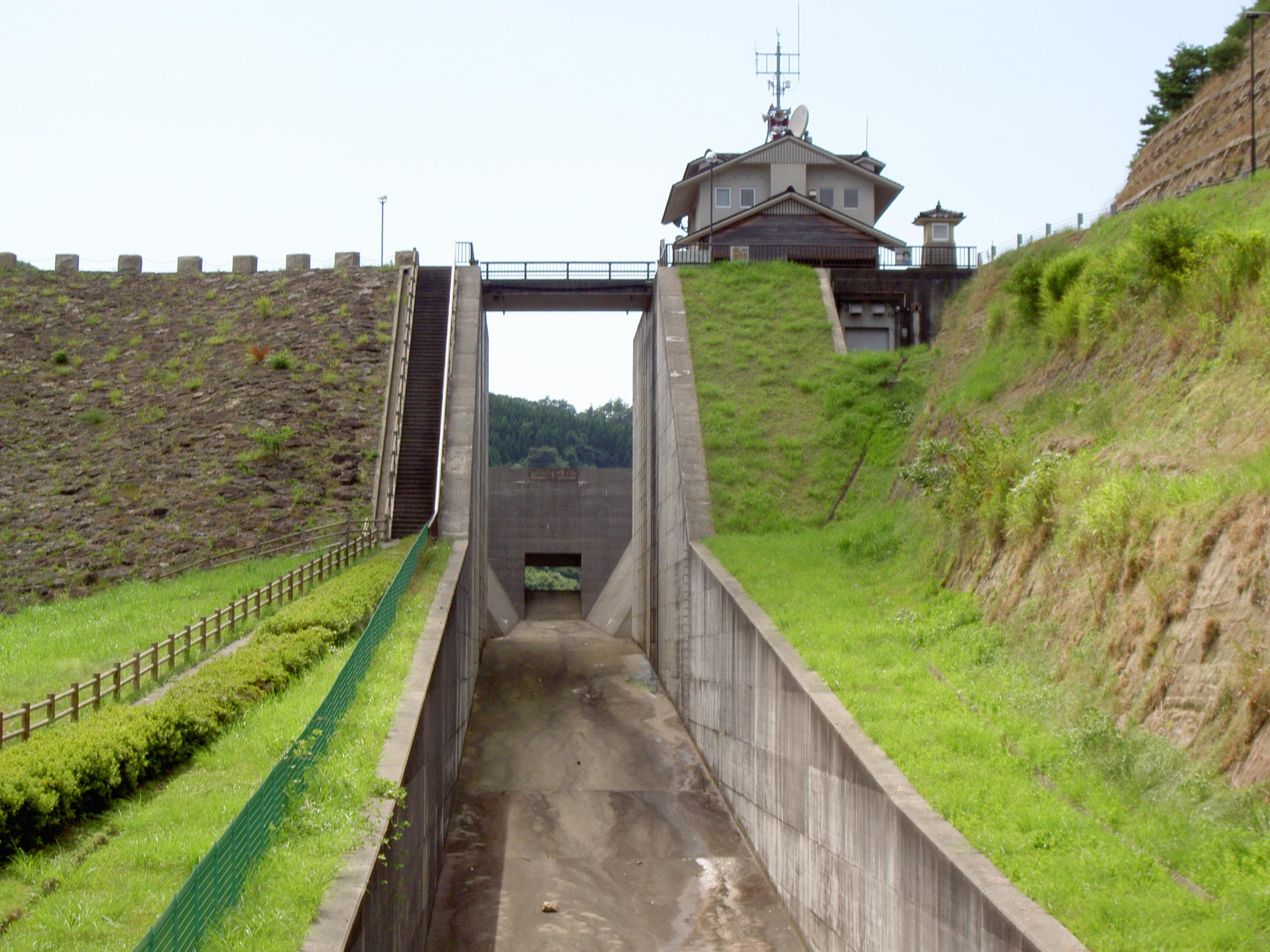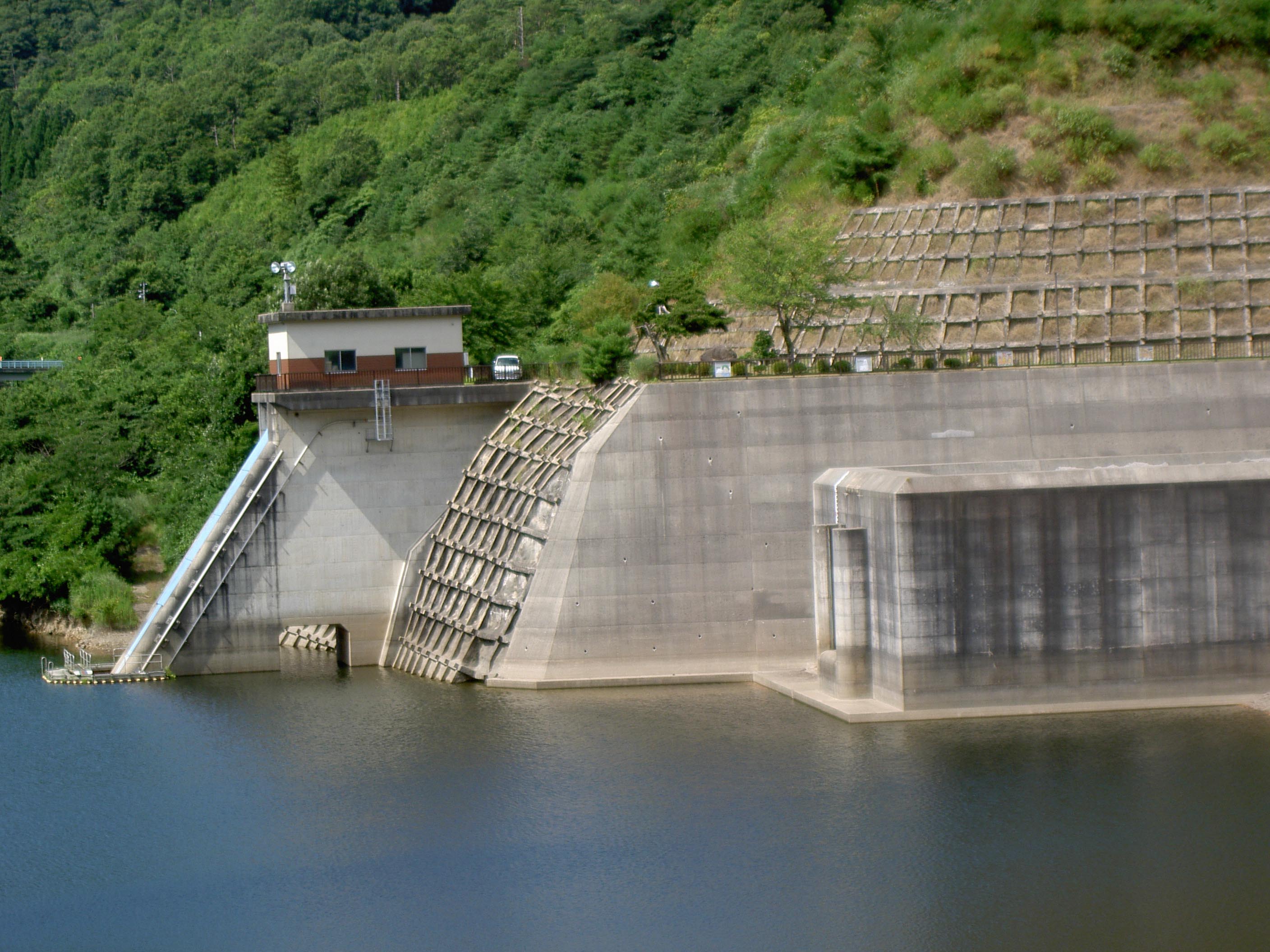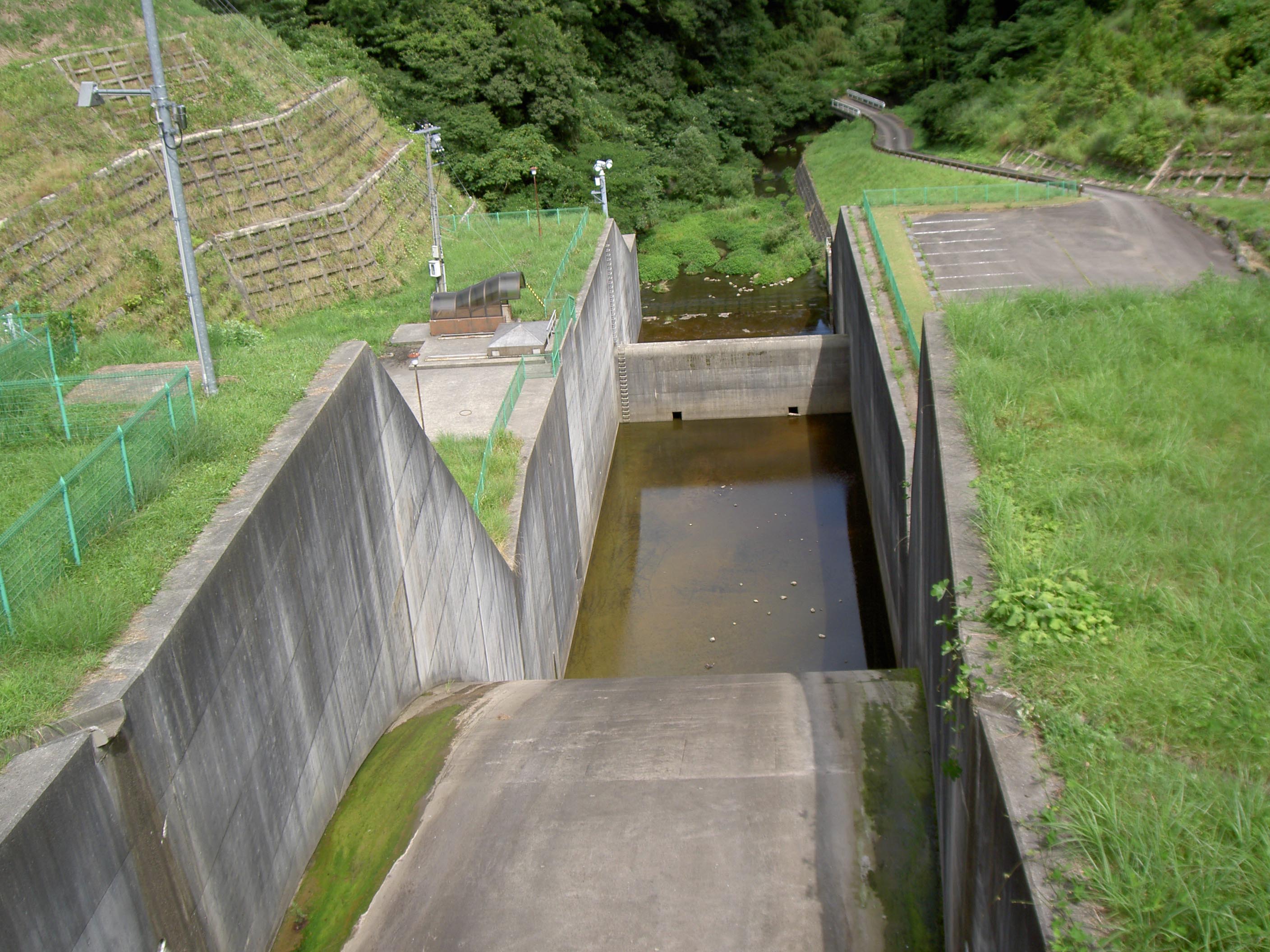 このダムには、自由越流式洪水吐がありますが、ちょっと珍しいのは下部にも穴が開いていて、常用洪水吐と非常用洪水吐の機能を持っていることでしょう。