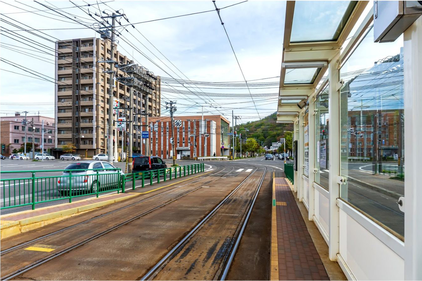 電車車輌センター(市電車庫)から出庫した電車は、停留場のすぐ南の交差点から中央図書館前停留場へ向かって内回り本線に合流しています。入庫の際はやはり中央図書館前停留場から外回り本線の途中で分岐して入庫します。