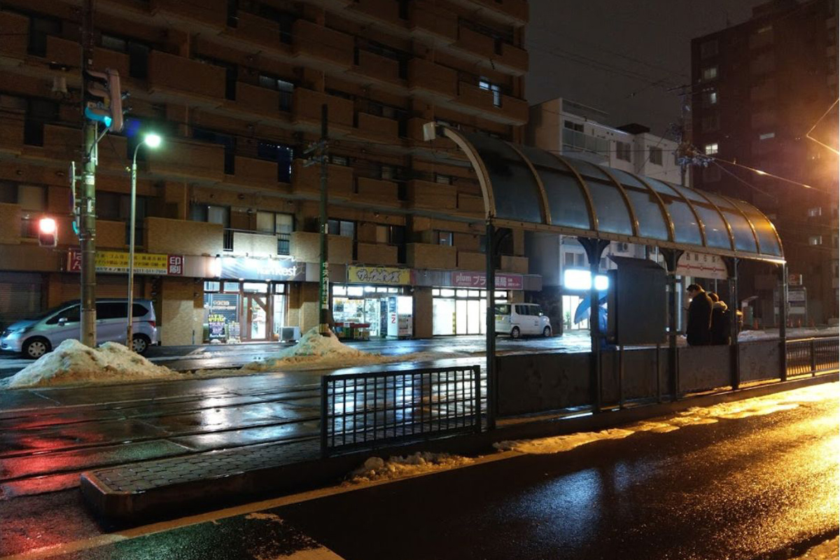 交差点を挟んで北側に内回り(西線9条旭山公園通方面)、南側に外回り(西15丁目方面)の乗り場があり安全地帯が設けられています。安全地帯にはロードヒーティングが施され、上屋が設置されています。