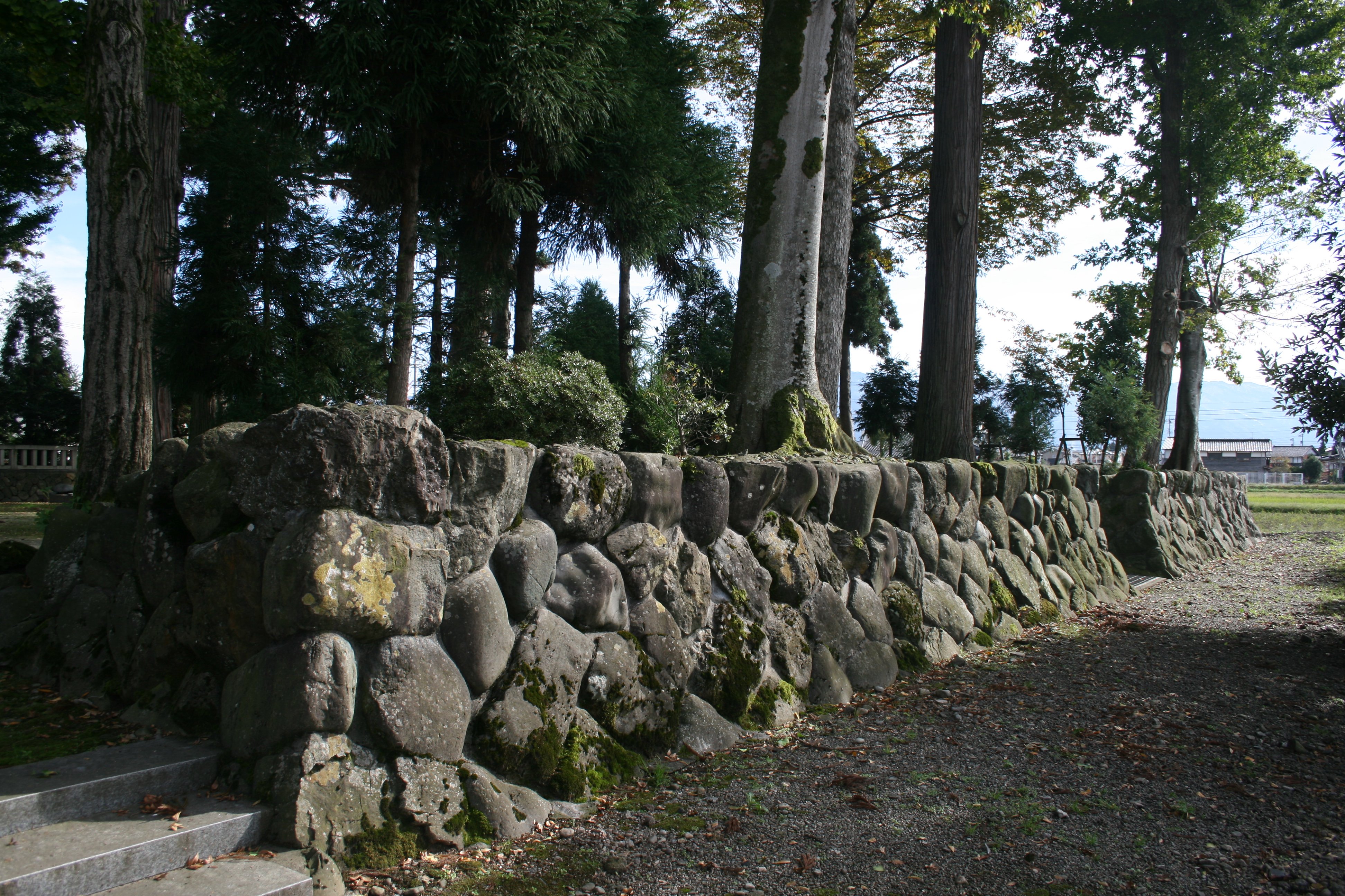 当時の城域は、ほぼ正方形で周囲に土塁を巡らせていました。現在、城域には日吉社が建っていて、土塁と郭跡が遺構として残っています。さらにおそらくは空堀が土塁の周りを囲んでいたのだと思われますが、現在では埋没してしまっていて遺構としては残っていません。現在残っている石垣は後世のものでしょうがけっこう立派なものです。