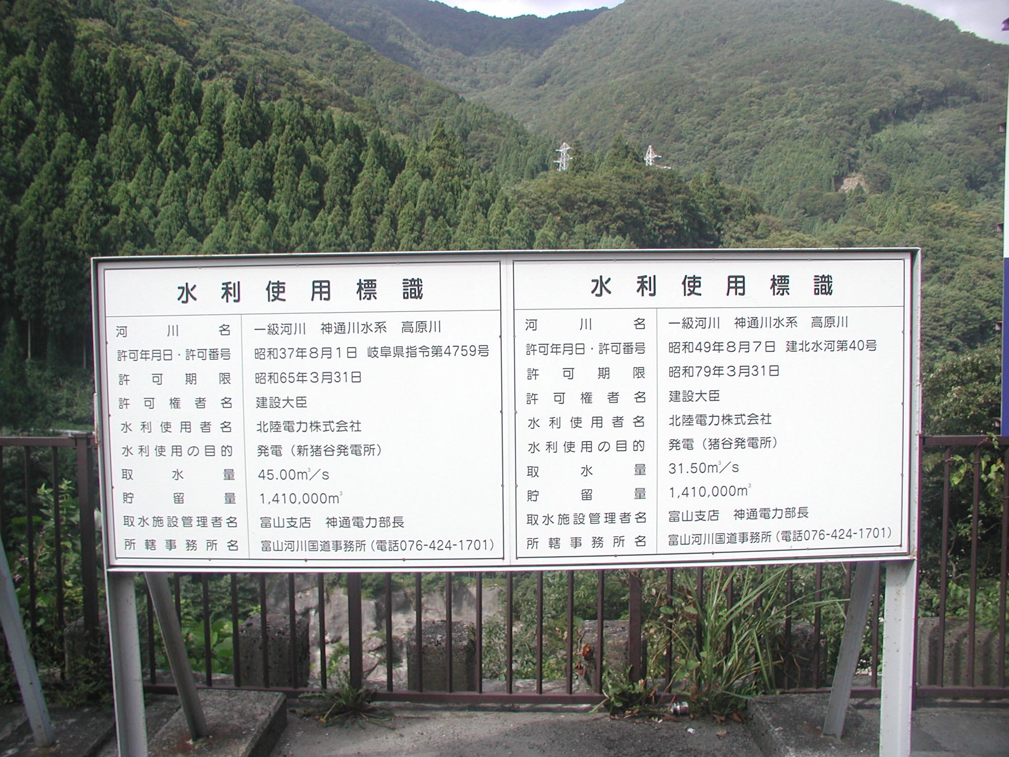 水利使用標識から新猪谷発電所には45m3/s、猪谷発電所には31.5m3/sの発電水利権が設定されています。