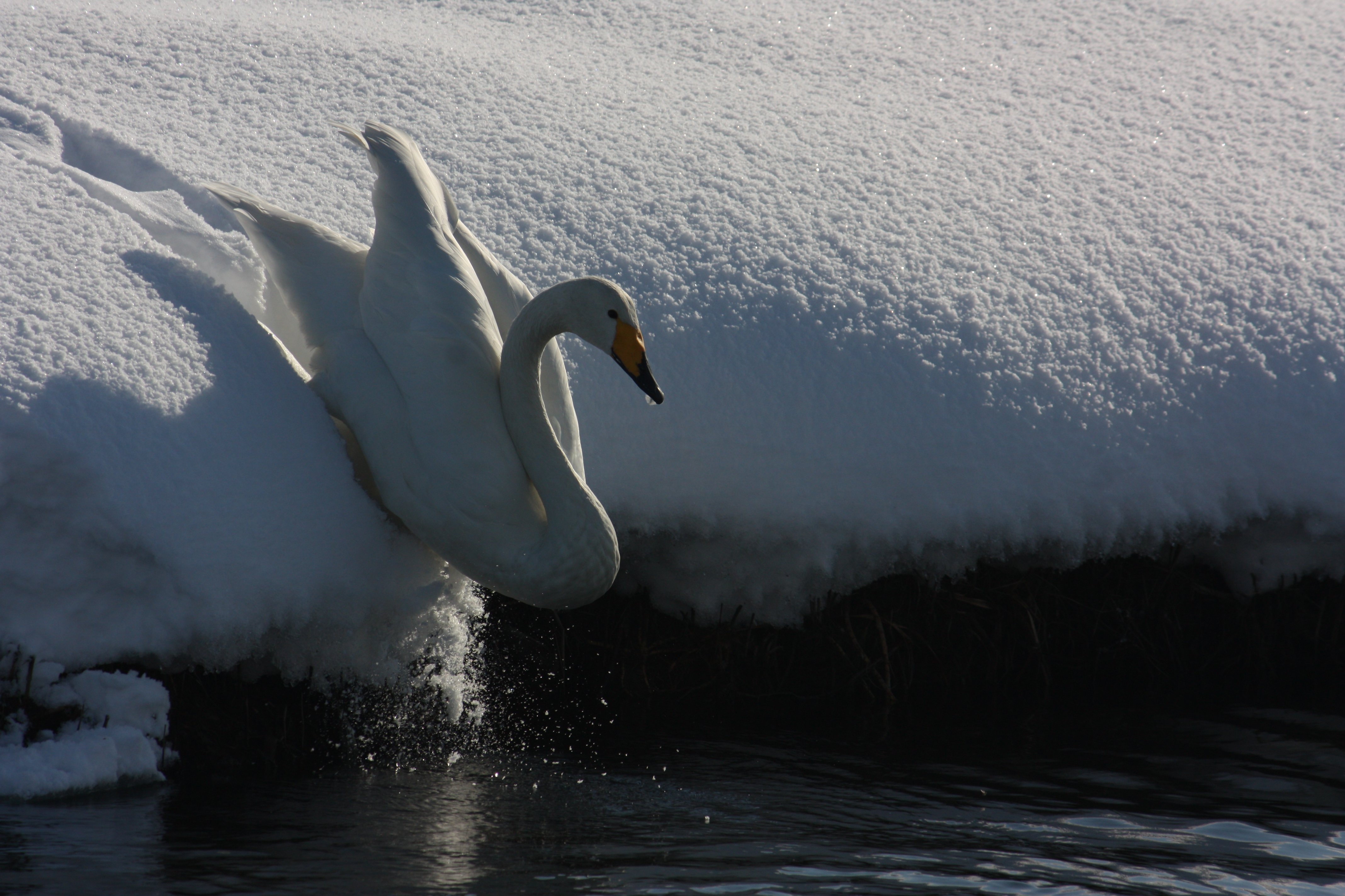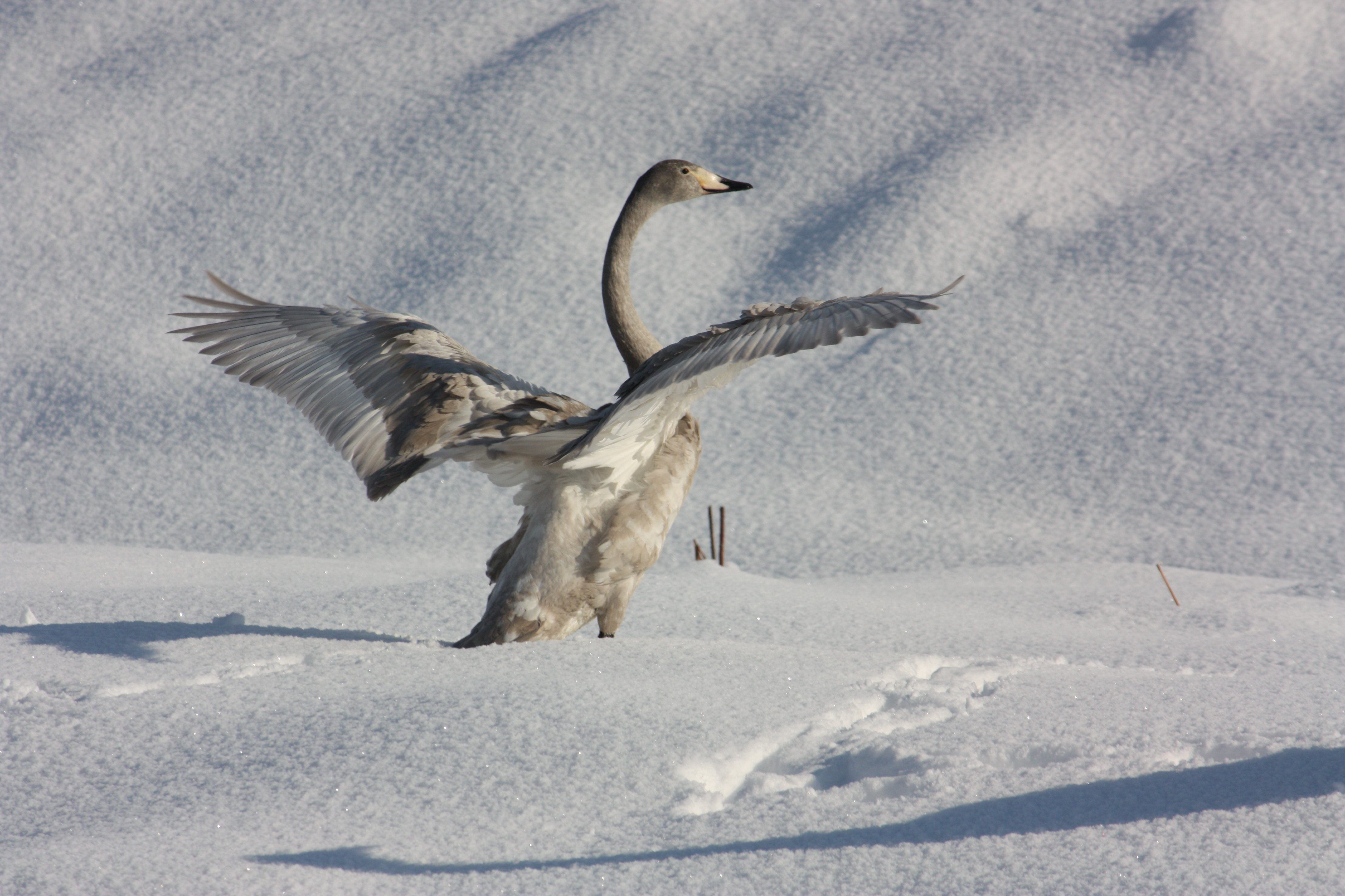 産卵期には4-7個の卵を産みます。抱卵期間は36-40日。雛は孵化してから2か月で飛翔できるようになる。オオハクチョウの成鳥は、体重が10kgを越えるので、空を飛ぶ生物としては最大級の重さです。そのため飛び立つ時は助走が必要となります。