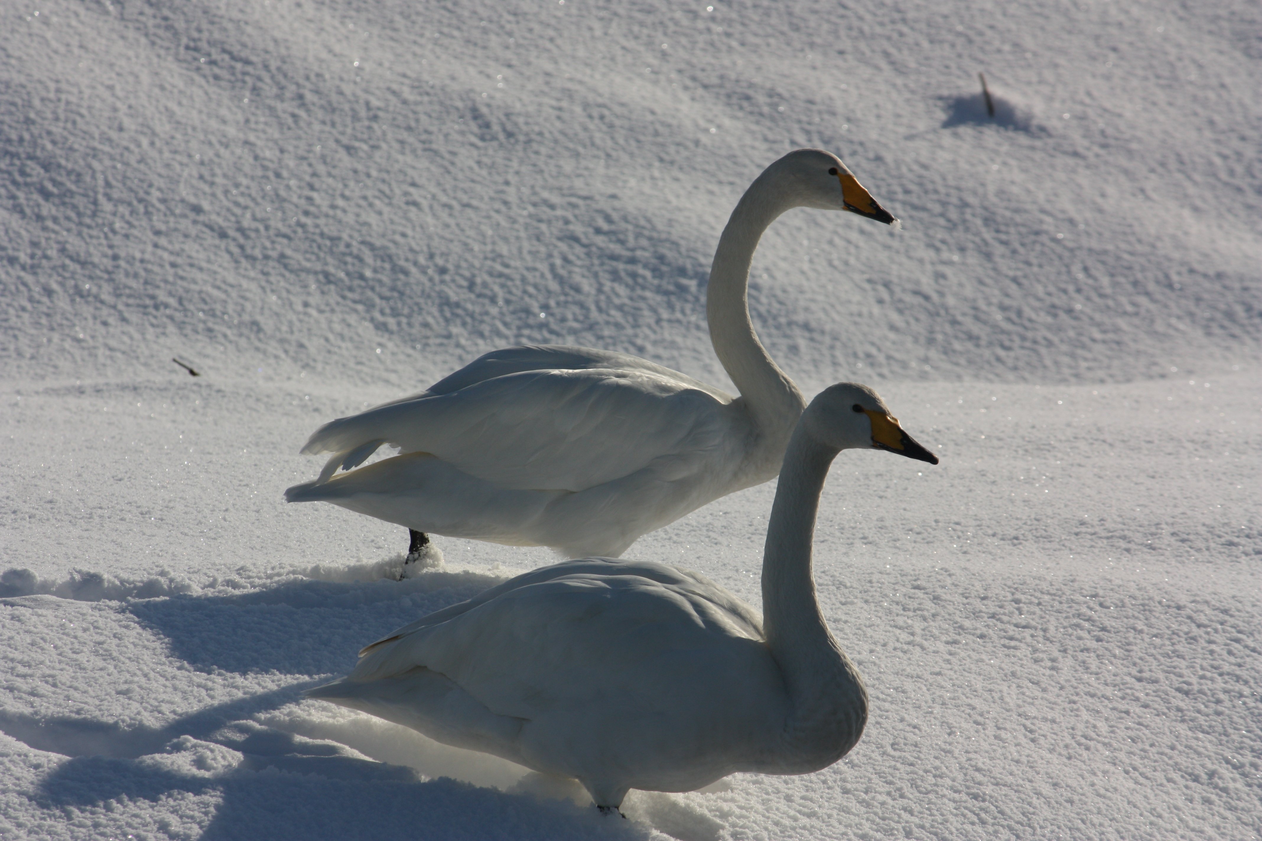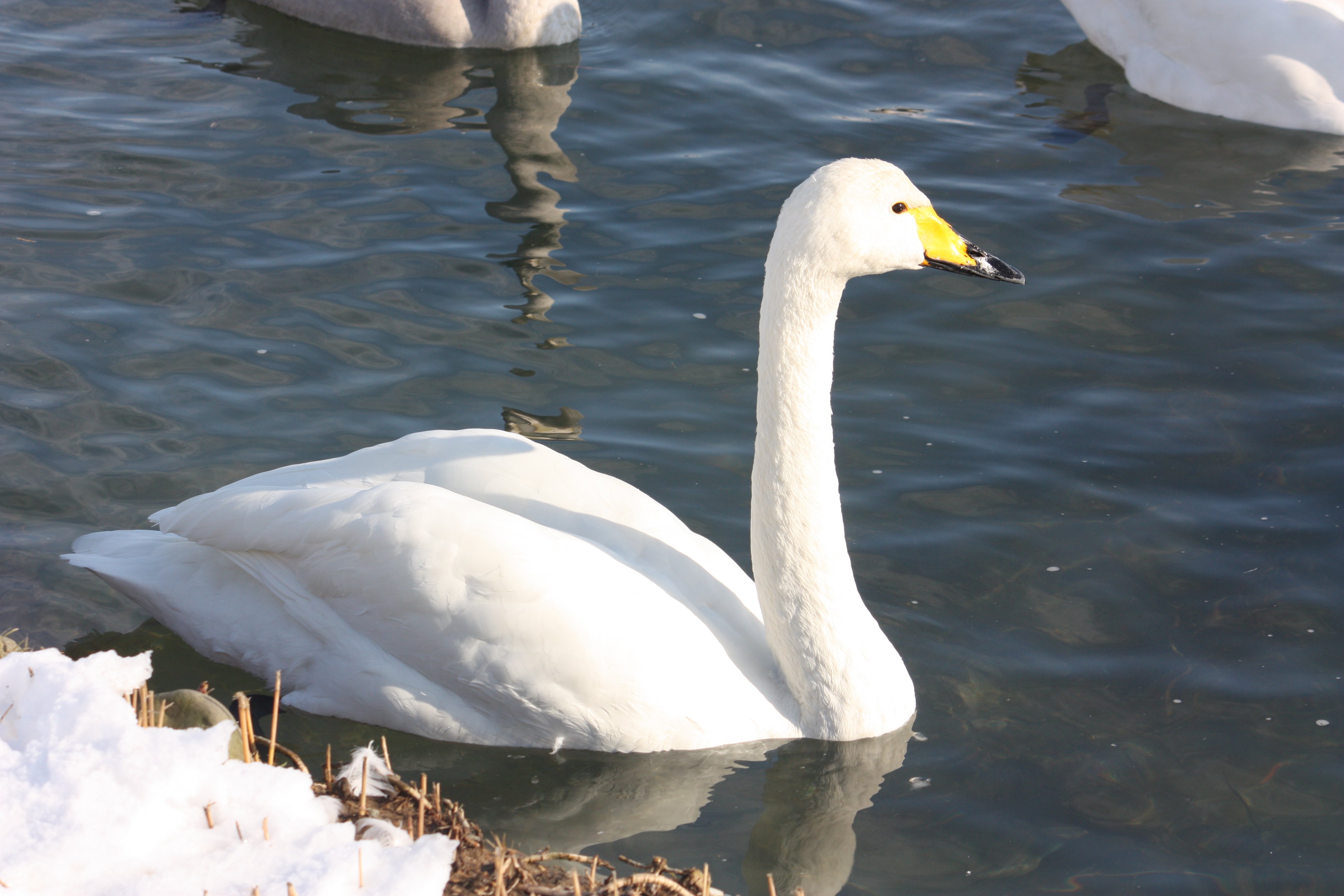 コハクチョウには、亜種にアメリカコハクチョウがあります。コハクチョウは、翼長オス51.5-53.5cm、メス47.5-52.5cm。上嘴基部から鼻孔にかけて黄色い斑紋が入る。