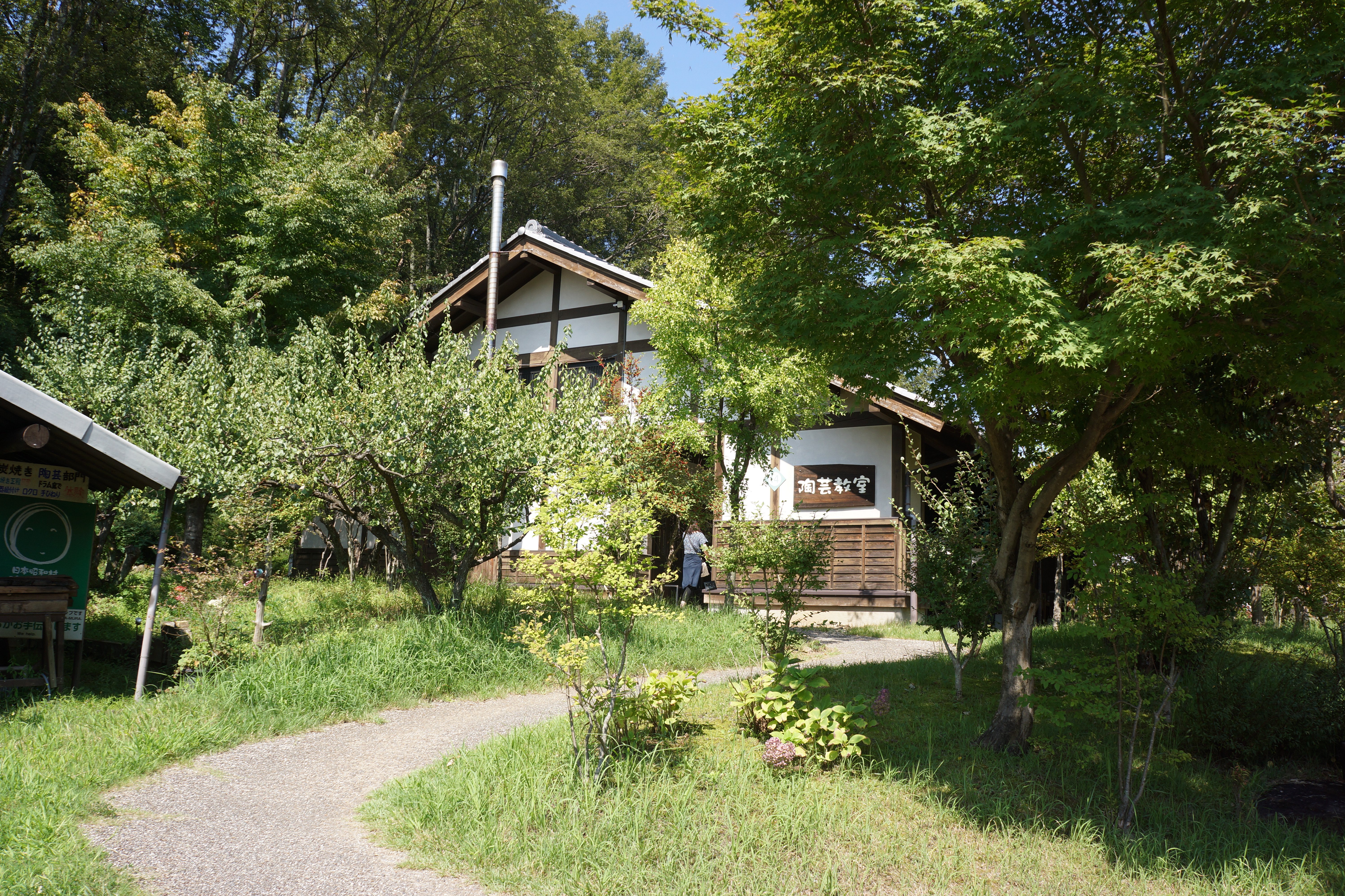 園内には木造校舎や遊具、万華鏡作りなどの体験教室、桑畑、茶畑等が広がり、各地に池も点在していて、自然に恵まれた里山を再現しています。岐阜県内に現存した朝日町旧庁舎が移築されて昭和村役場として、展示されています