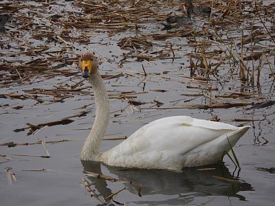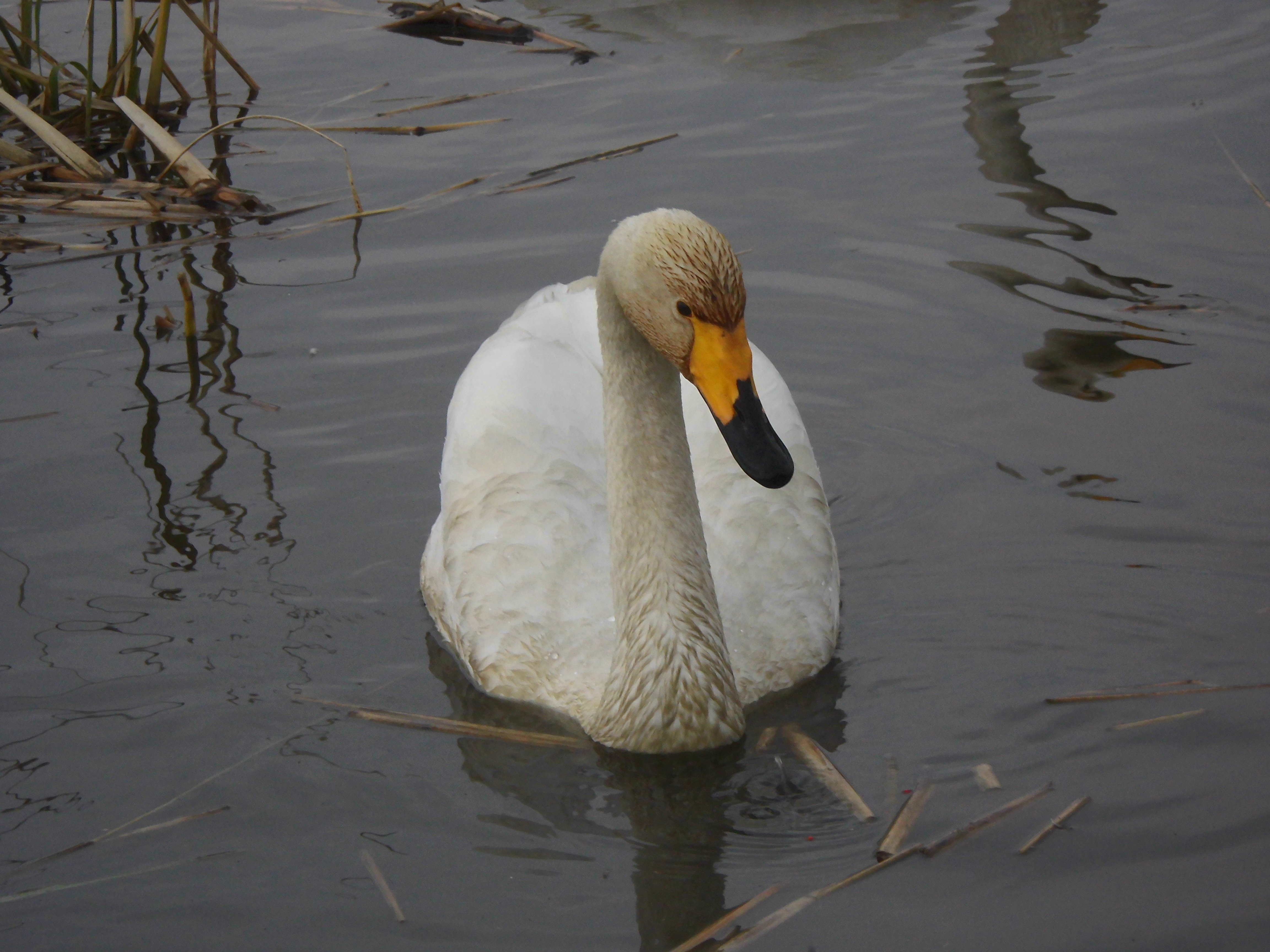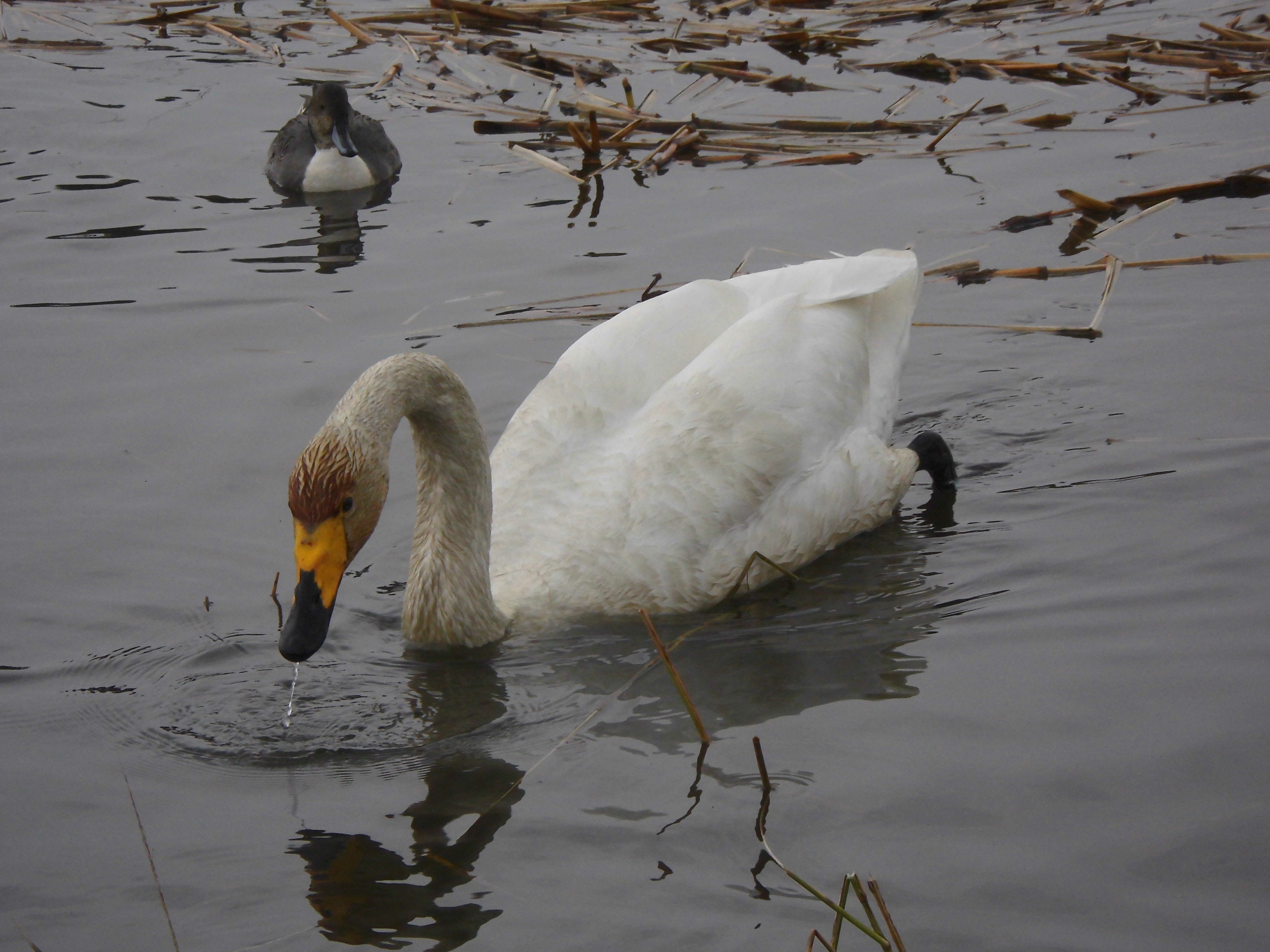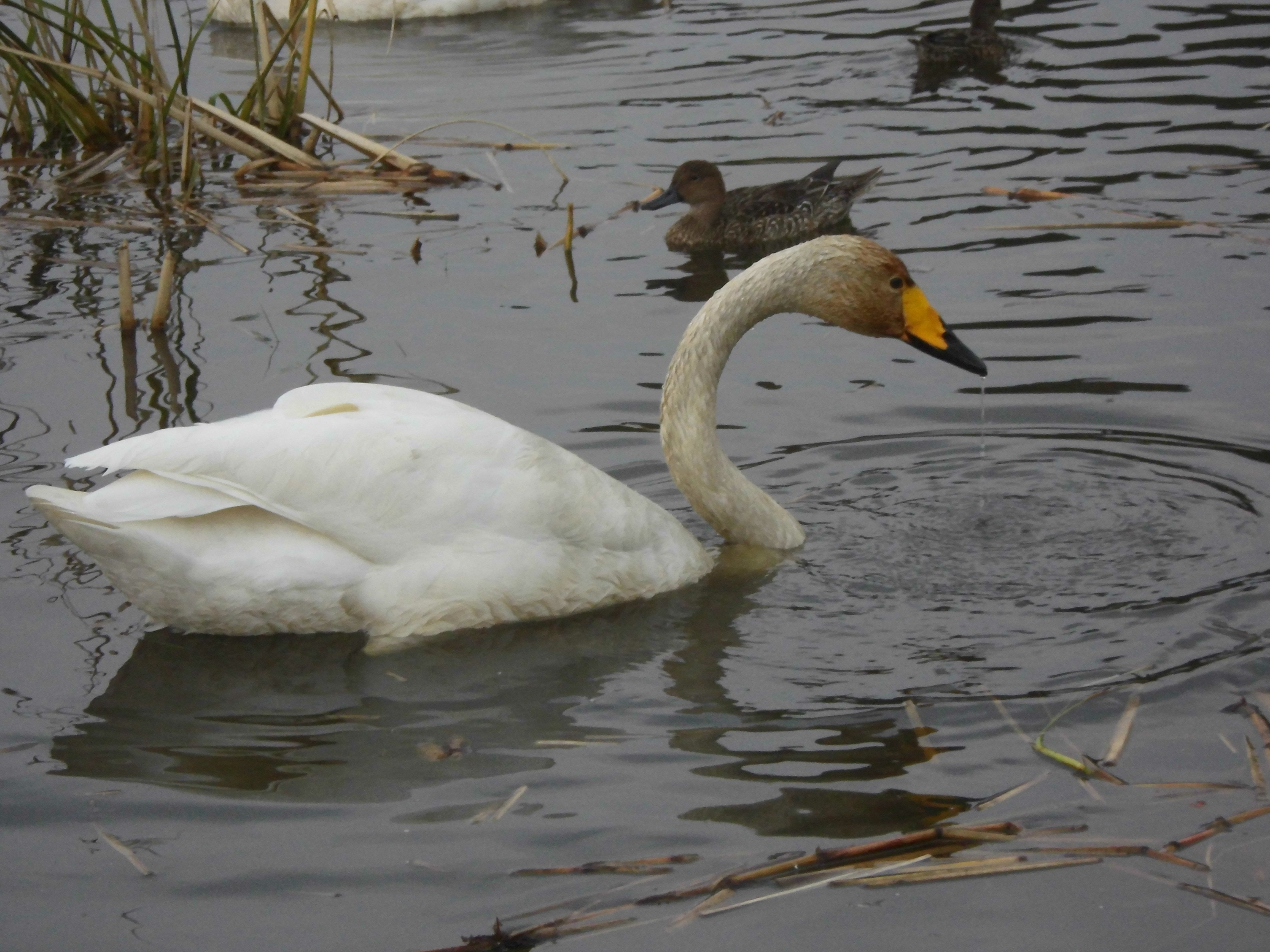 コハクチョウには、亜種にアメリカコハクチョウがあります。コハクチョウは、翼長オス51.5-53.5cm、メス47.5-52.5cm。上嘴基部から鼻孔にかけて黄色い斑紋が入る。