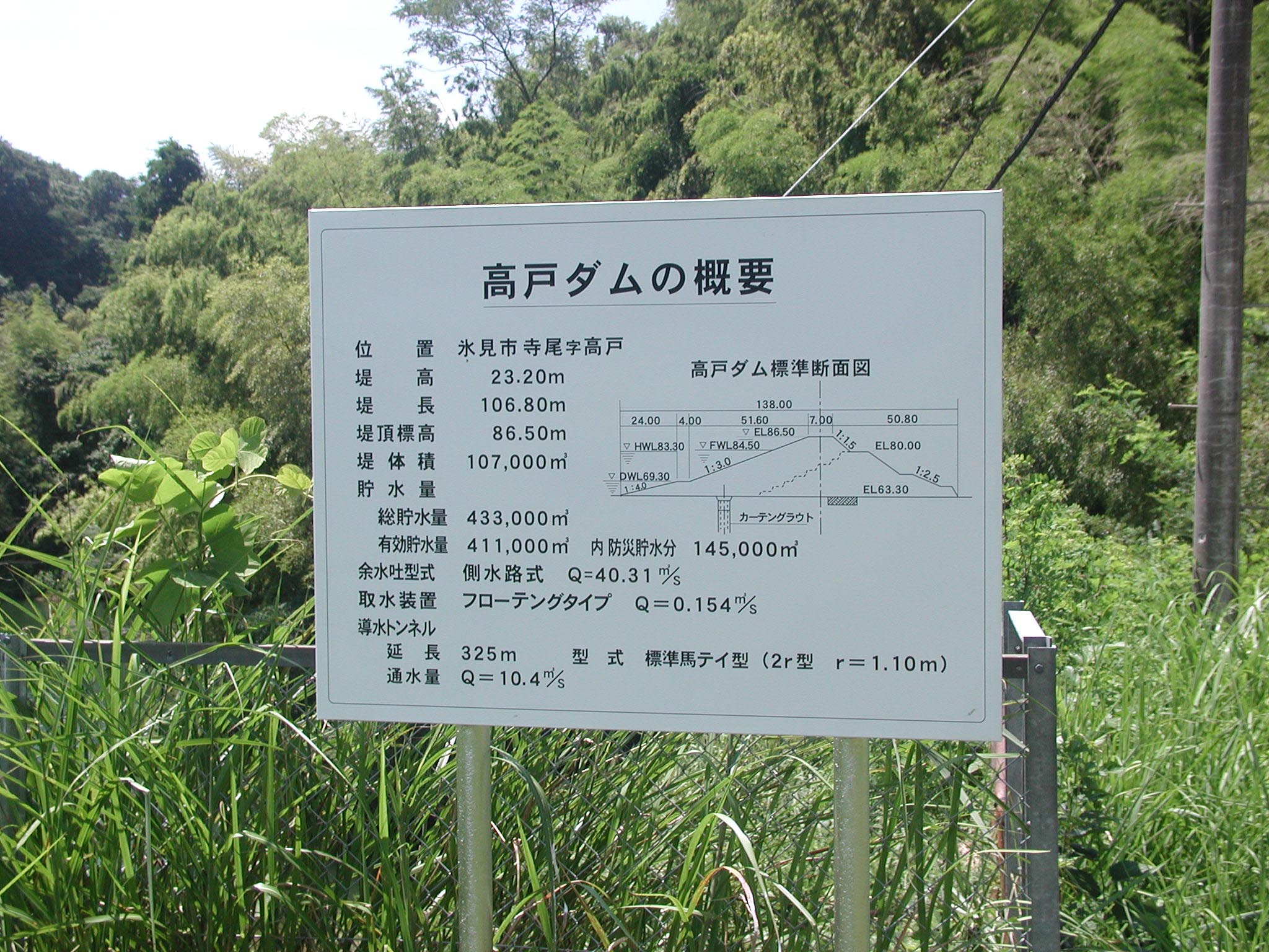 高戸ダムは、灌漑用ダムです。ダム便覧では、当初ロックフィルダムとありましたが、2007年版ではアースダムと変更されていました。現物はどう見てもアースダムでした。