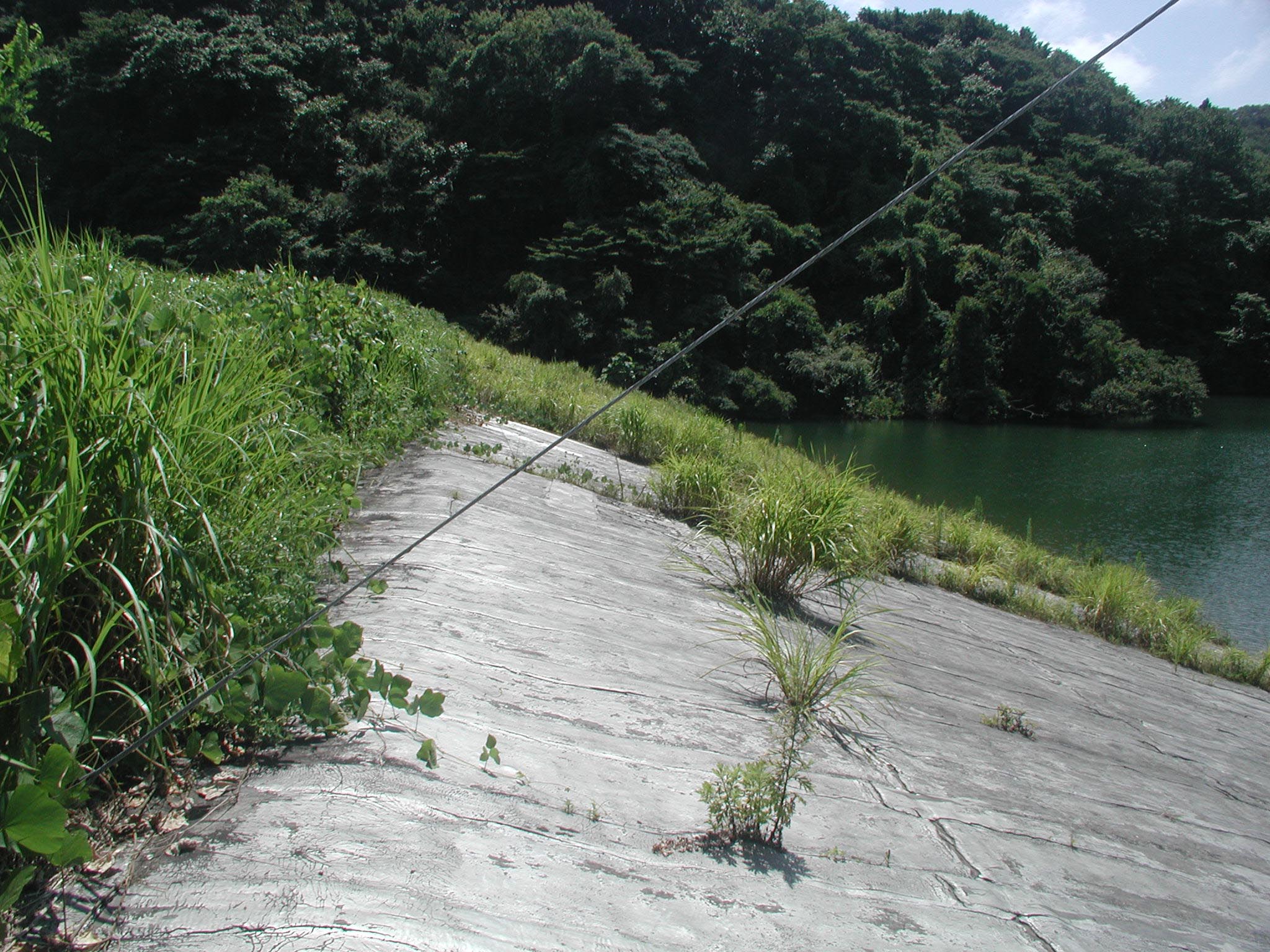 堤体の上流側には何かカバーがかぶせてありました。堤体上は草が生い茂っていて入れる状態ではありませんでした。