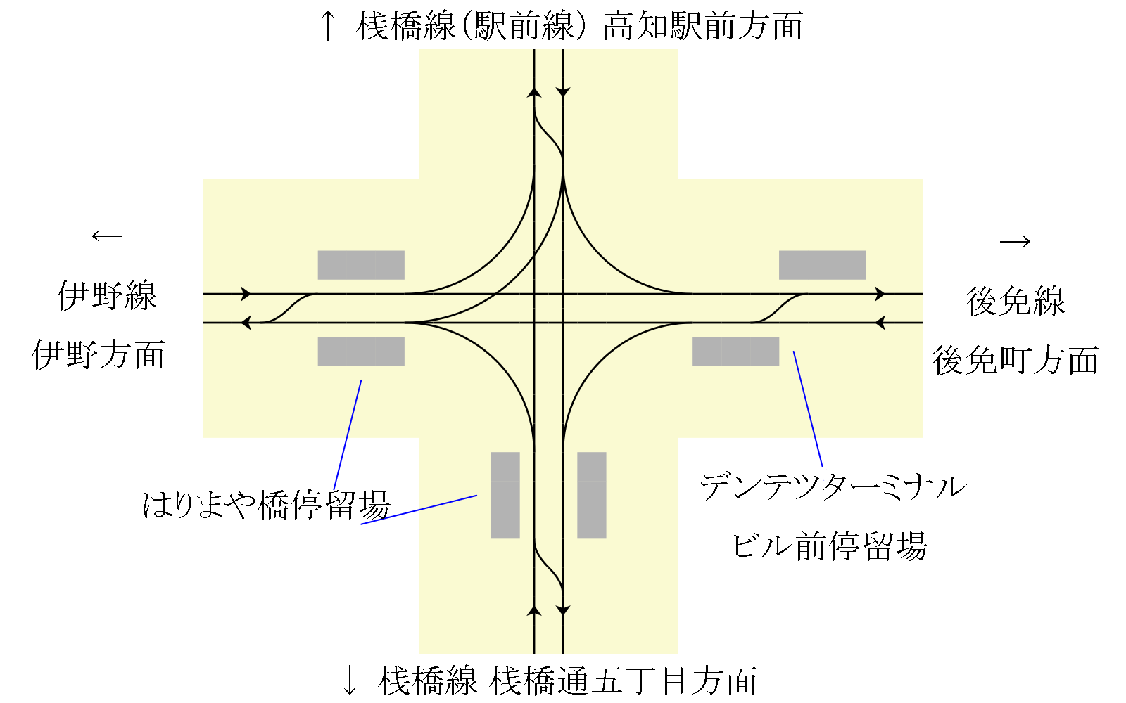 交差点から東に後免線、西に伊野線、南北に桟橋線の複線軌道が通じ、東西方向と南北方向の路線は平面交差するダイヤモンドクロッシングとなっています。互いの路線は単線の連絡線で結ばれ、各方向とも平面交差の手前から左折により転線が可能。このうち交差点の北、桟橋線上り(駅前線)方面からは左折して東行きの後免線に転線できるだけでなく、右折して西行きの伊野線にも転線できるよう連絡線が敷かれています。かつては全方向に右折軌道が敷かれていたが、1951年までに撤去されています。転線した先には各方向とも渡り線が設けられています。