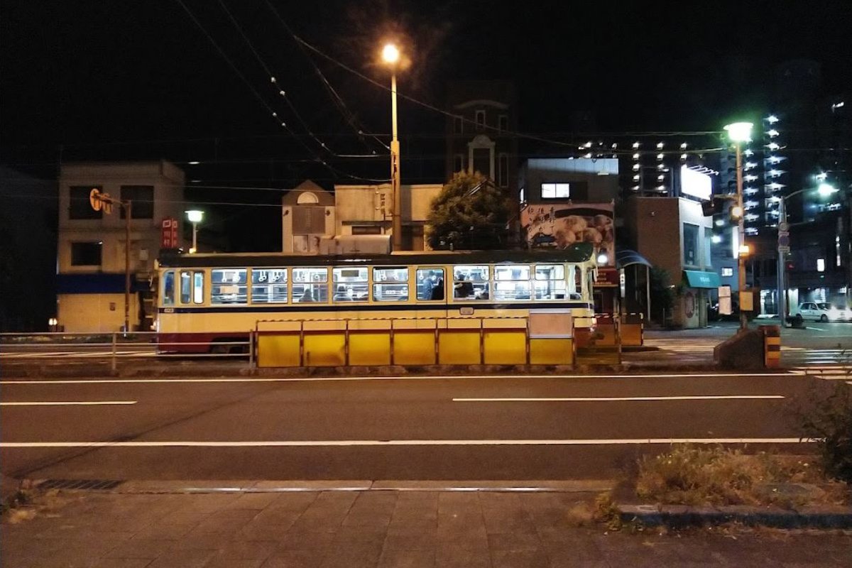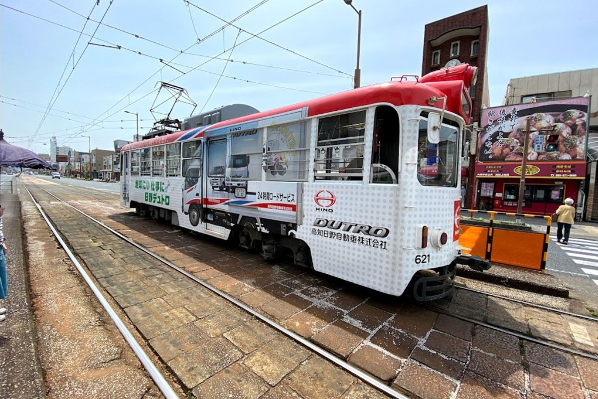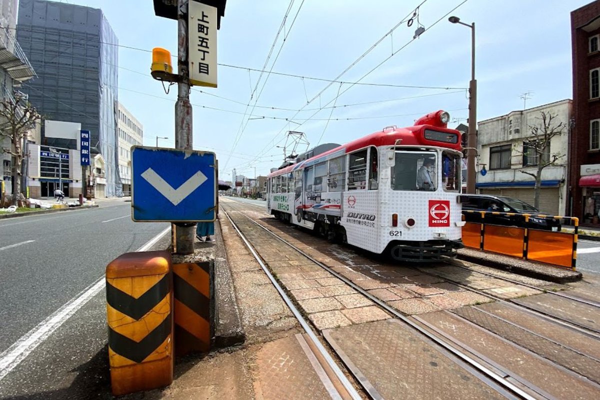 上町四丁目との間に渡り線があり、はりまや橋・高知駅前方面行の一部が当停留場発着で運行されています。これは1975年(昭和50年)5月に折り返し用の渡り線を旭町一丁目から移設したもので、渡り線がはりまや橋寄りにあることから折り返しの上り列車は上りホームに入線できず、下りホームで降車を扱った後そのままの位置で反対側のドアを開き、乗客は上りホームから線路を跨いで乗車します。なかなか難しいことをやっていますね。