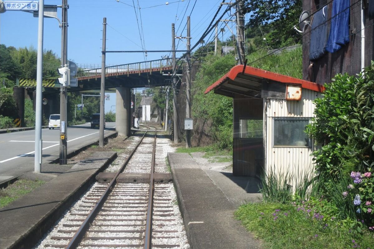 上記の写真にもあるように停留場西側で土讃線が交差し、その先で高知自動車道が跨いでいます。そのあたりが咥内坂の頂点で、そこから宇治団地前にかけて勾配29パーミルの下り坂に転じ、並走する県道とともに掘割の中を進みます。この勾配は、軌道線としてはほぼ規格外の急こう配でよくこんなところを通れますねと言いたくなるほどです。