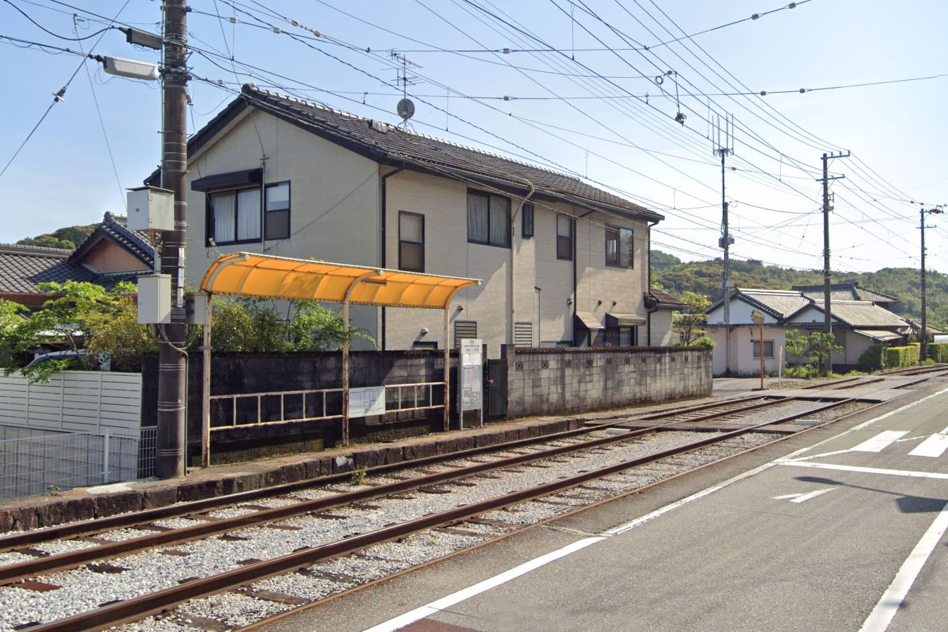 はりまや橋方面は安全地帯にホームが設置されるが、後免町方面は道路上に白線で乗り場が示されるペイント電停となっている。この駅もホームが軒先にありますが、こういうのは他の路線ではなかなか見かけません。