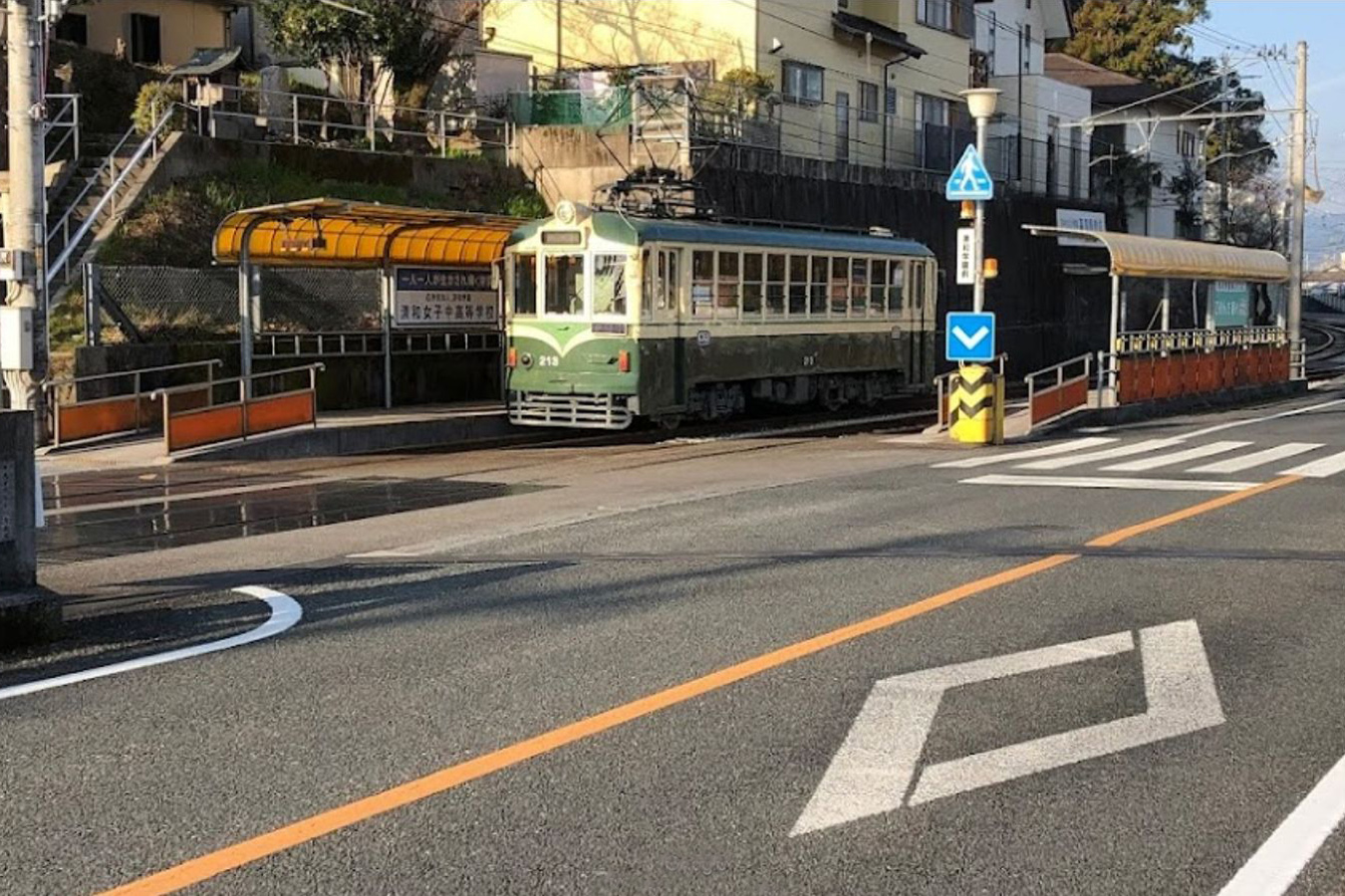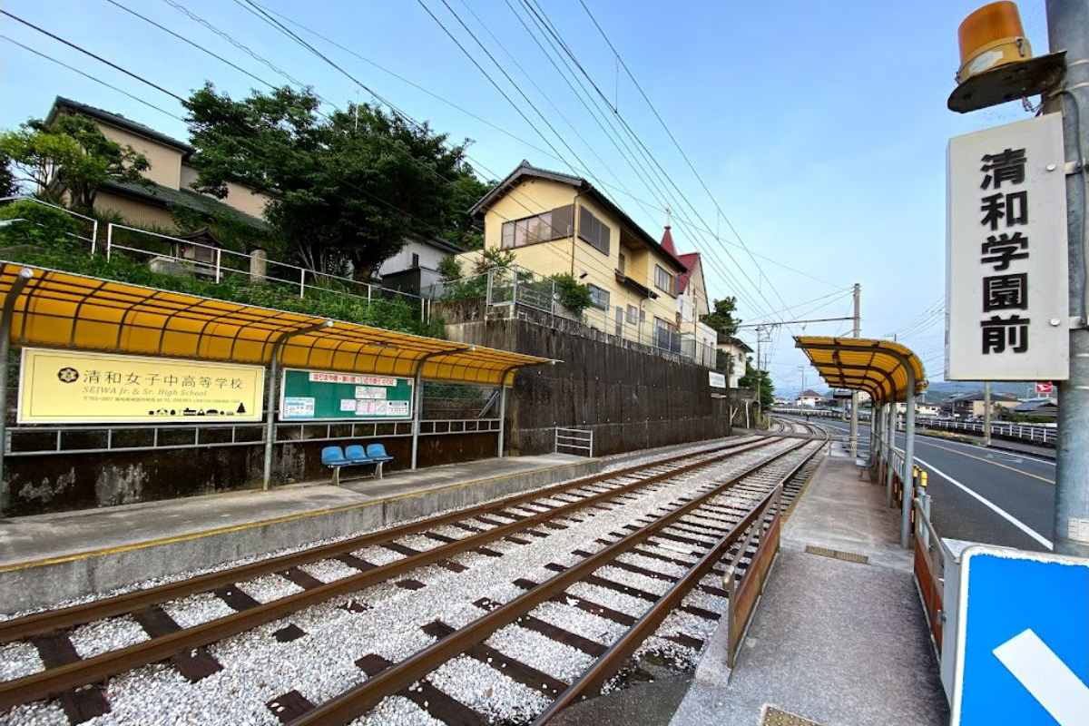 清和学園前停留場は、1985年(昭和60年)9月に高知市本宮町から当地へ移転した清和女子中学校・高等学校への通学利便性向上のため、新設された停留場です。隣の一条橋停留場はこの時すでに存在していましたが、地域住民の要望もあり廃止されることはなく、結果として両停留場が非常に近接して並び立つという事態になっています。写真でも舟入川を挟んだ向こうに一条橋停留場が見えます。