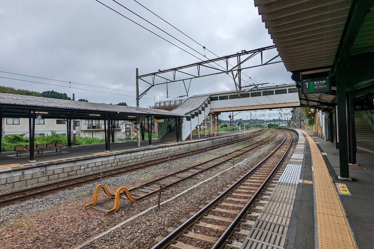 駅構造 地上駅である。駅舎側から、単式ホーム1面1線(1番線)と島式ホーム1面2線(2・3番線)、計2面3線のホームを有する。ホームはカーブしている。互いのホームは跨線橋で連絡している。また、1番線と2番線の間に横取線が1線あり、保線用車両の留置に利用されている。