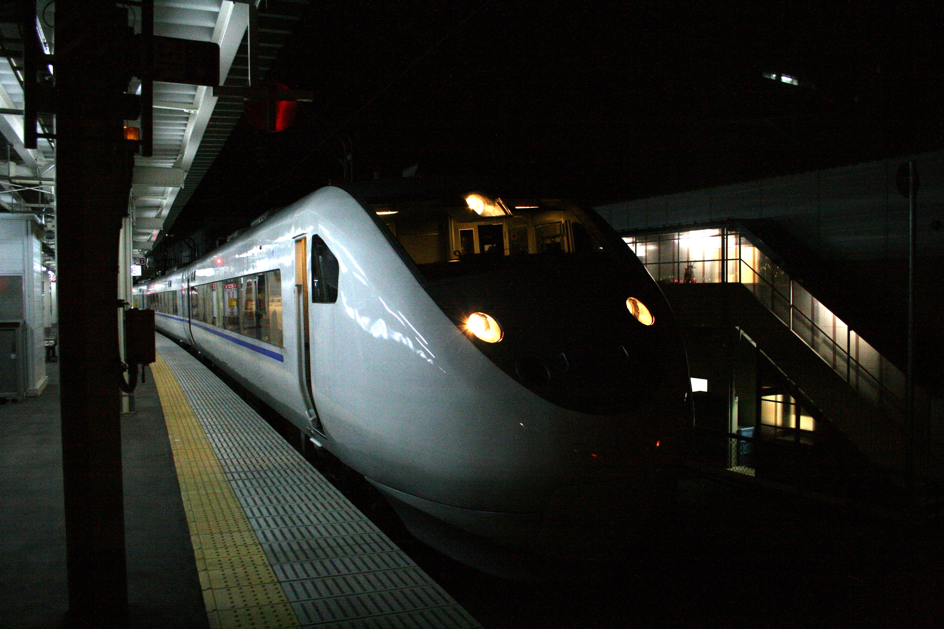深夜、富山駅に到着した特急「サンダーバード」 |