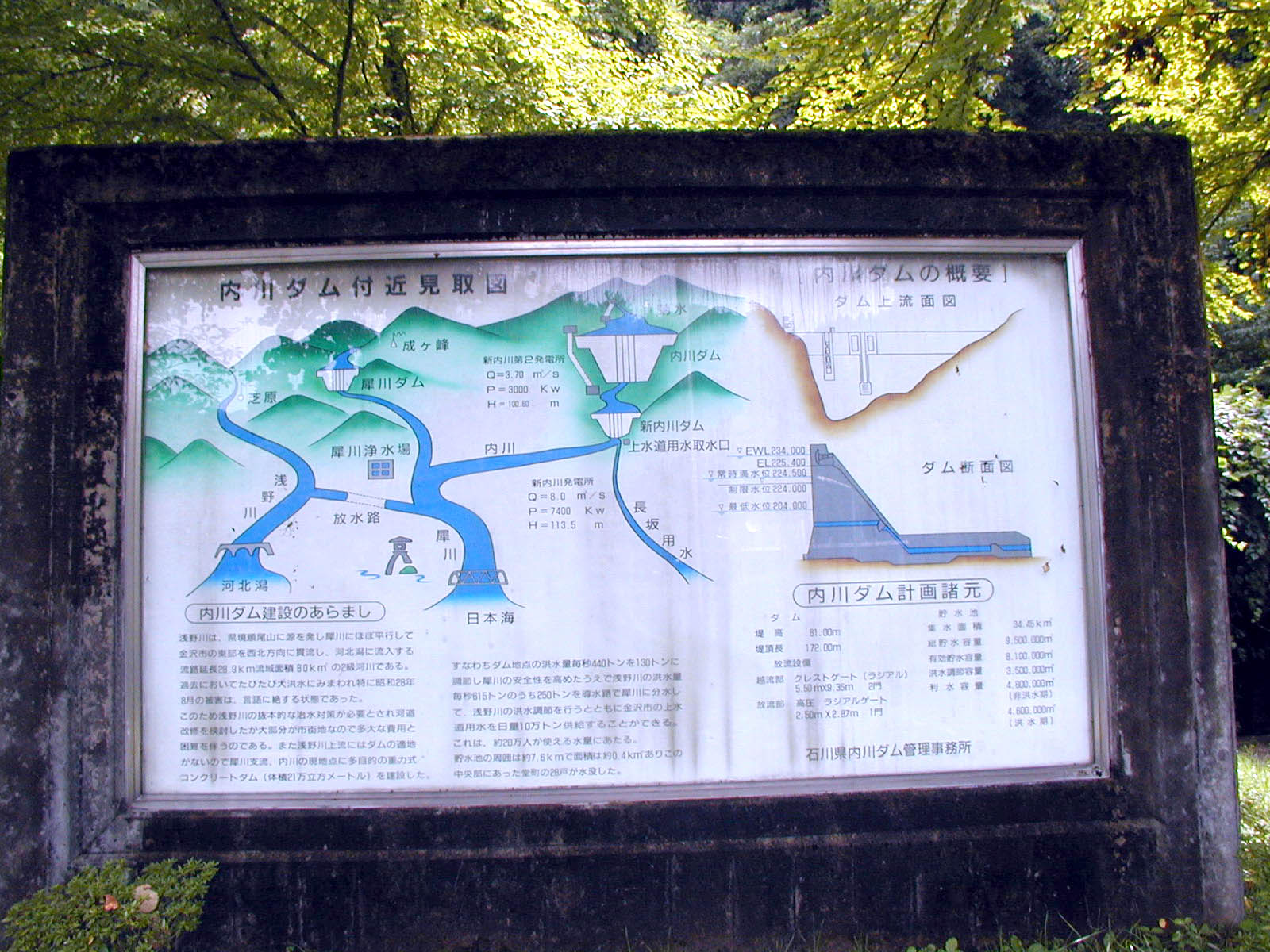 内川ダムは、石川県が管理する多目的ダムです。このダムで取水する新内川発電所は、全国でも珍しい市営水力発電所で最大出力7400kwです。市営の水力発電所は、この犀川水系にある5箇所しかありません。