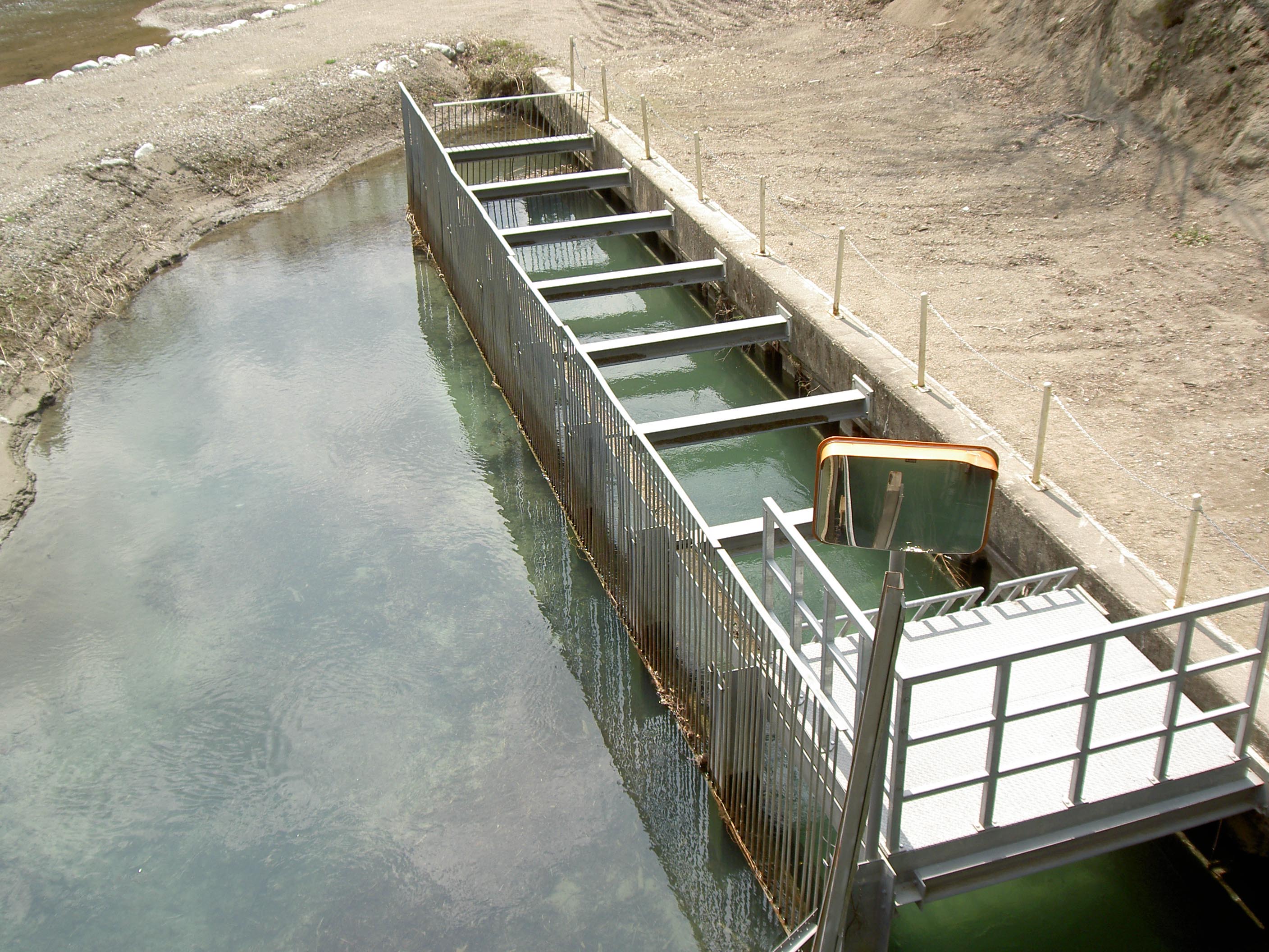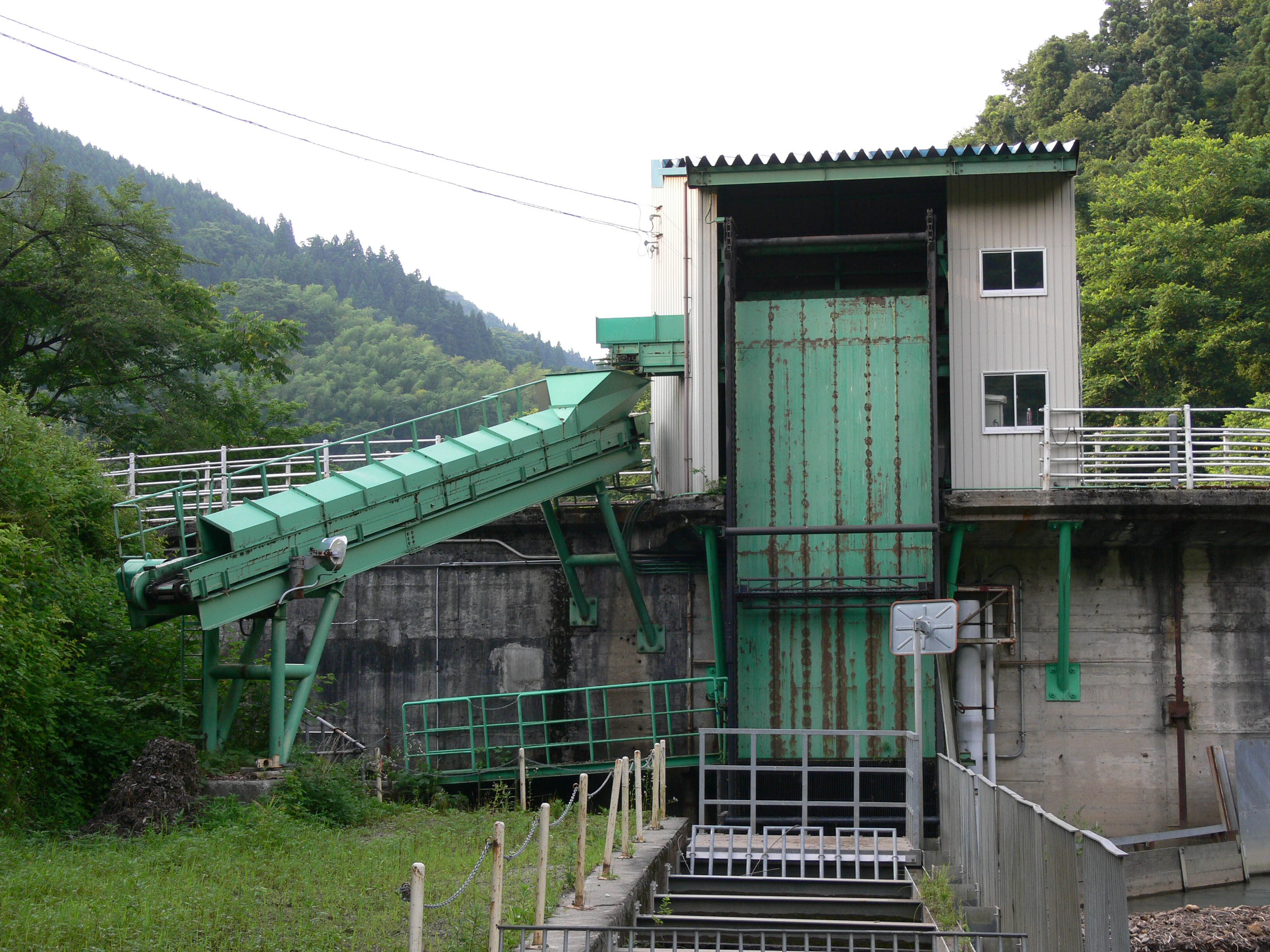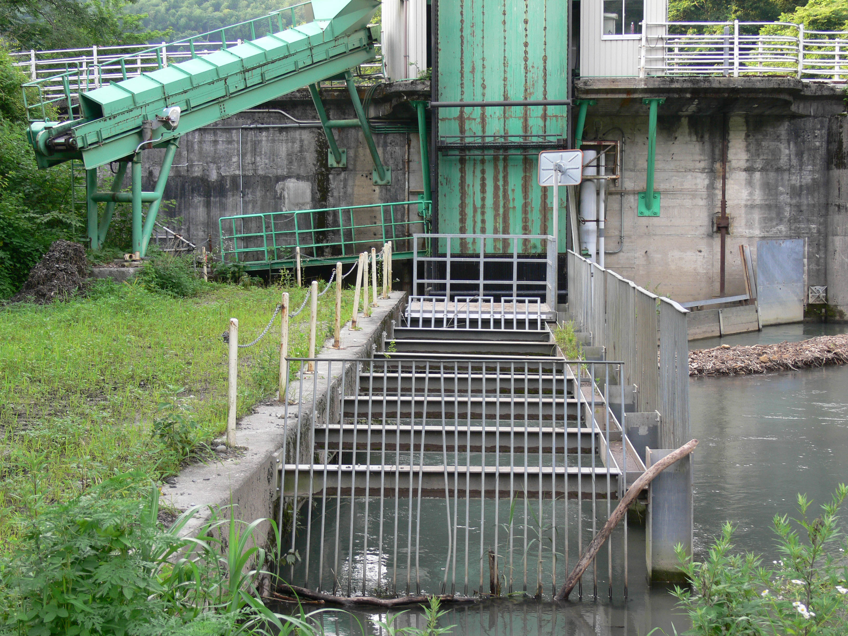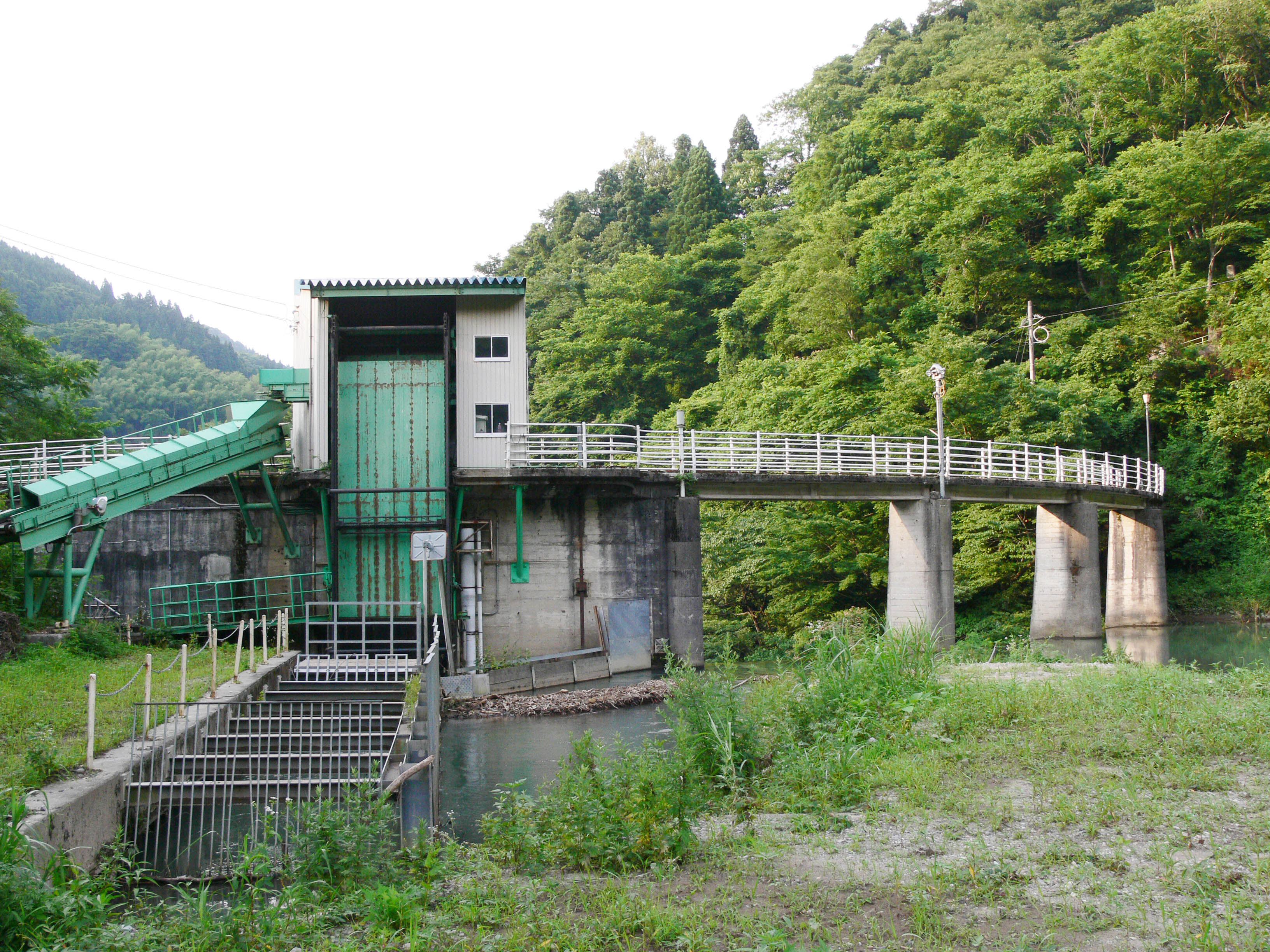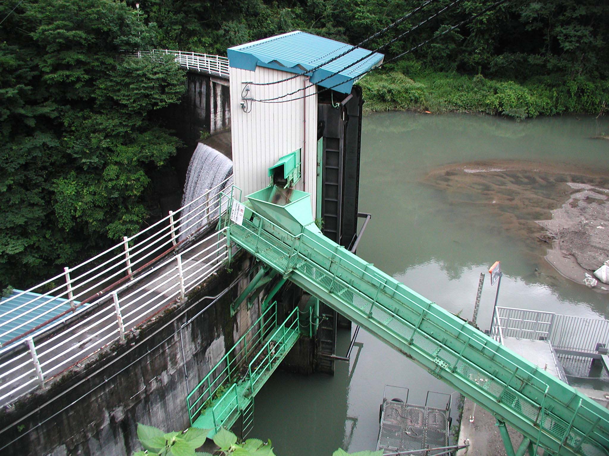 流木採取用のリフトとコンベア 自由越流式洪水吐