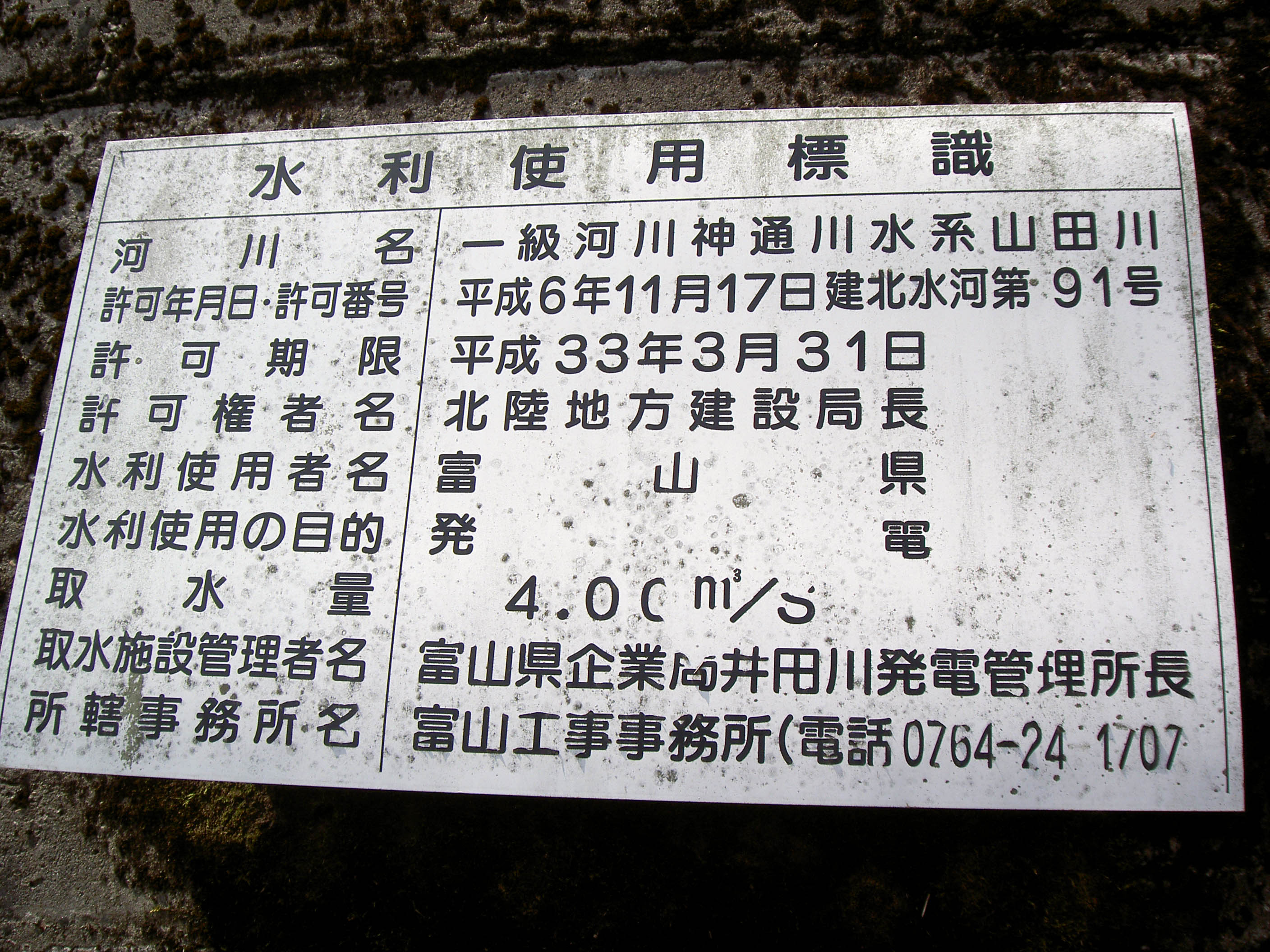 ほとんど満水で越流しています 水利使用標識