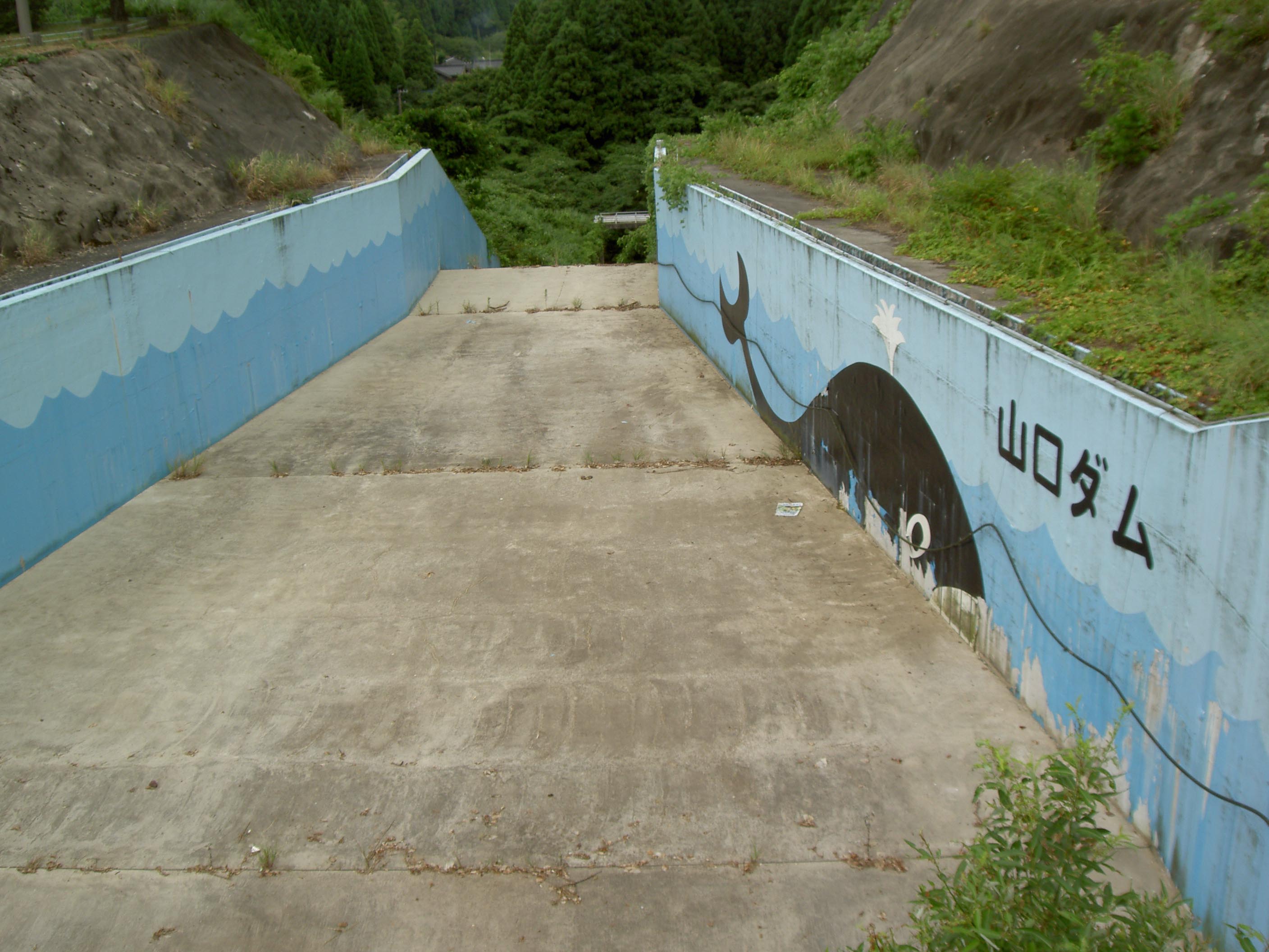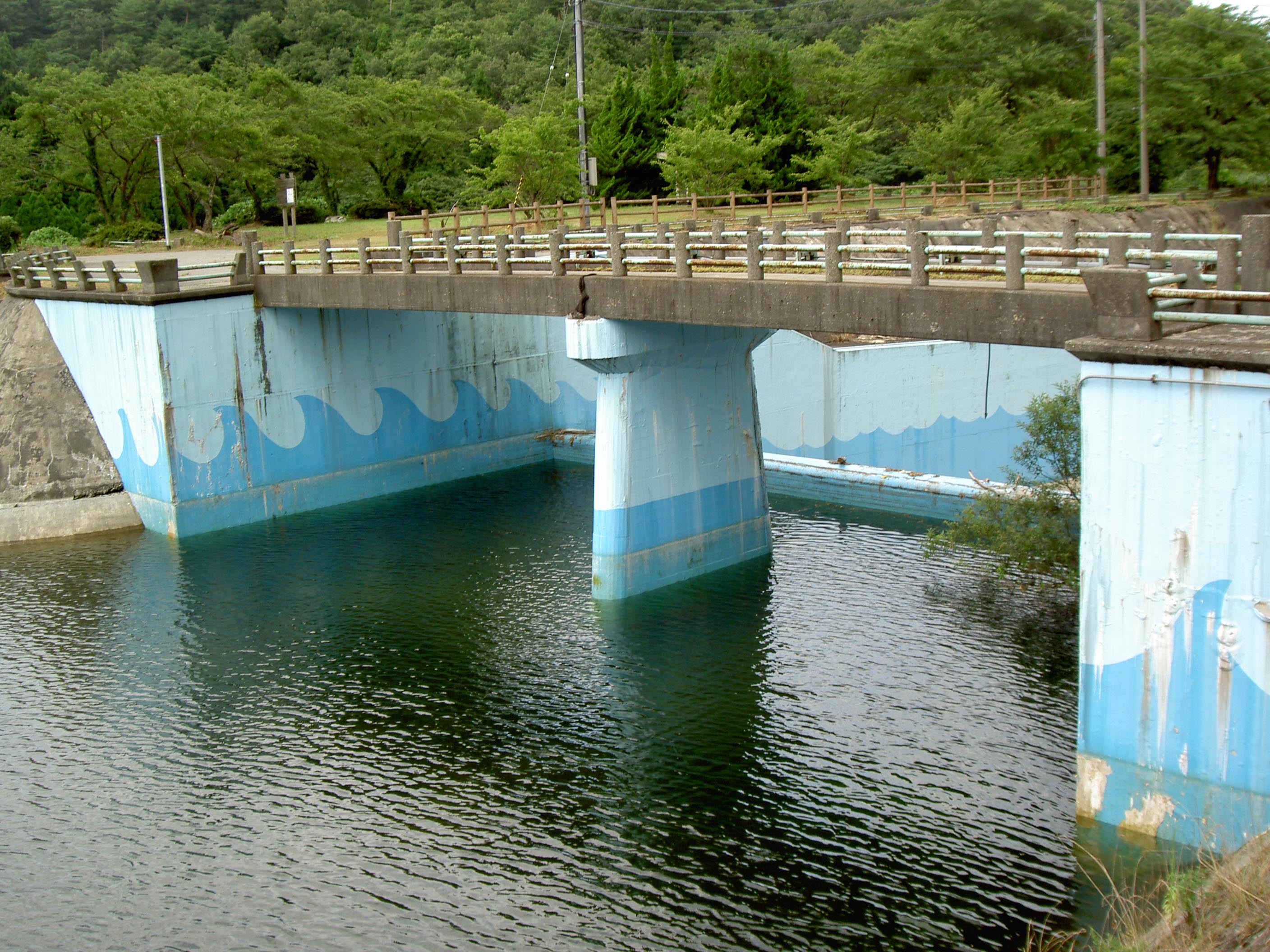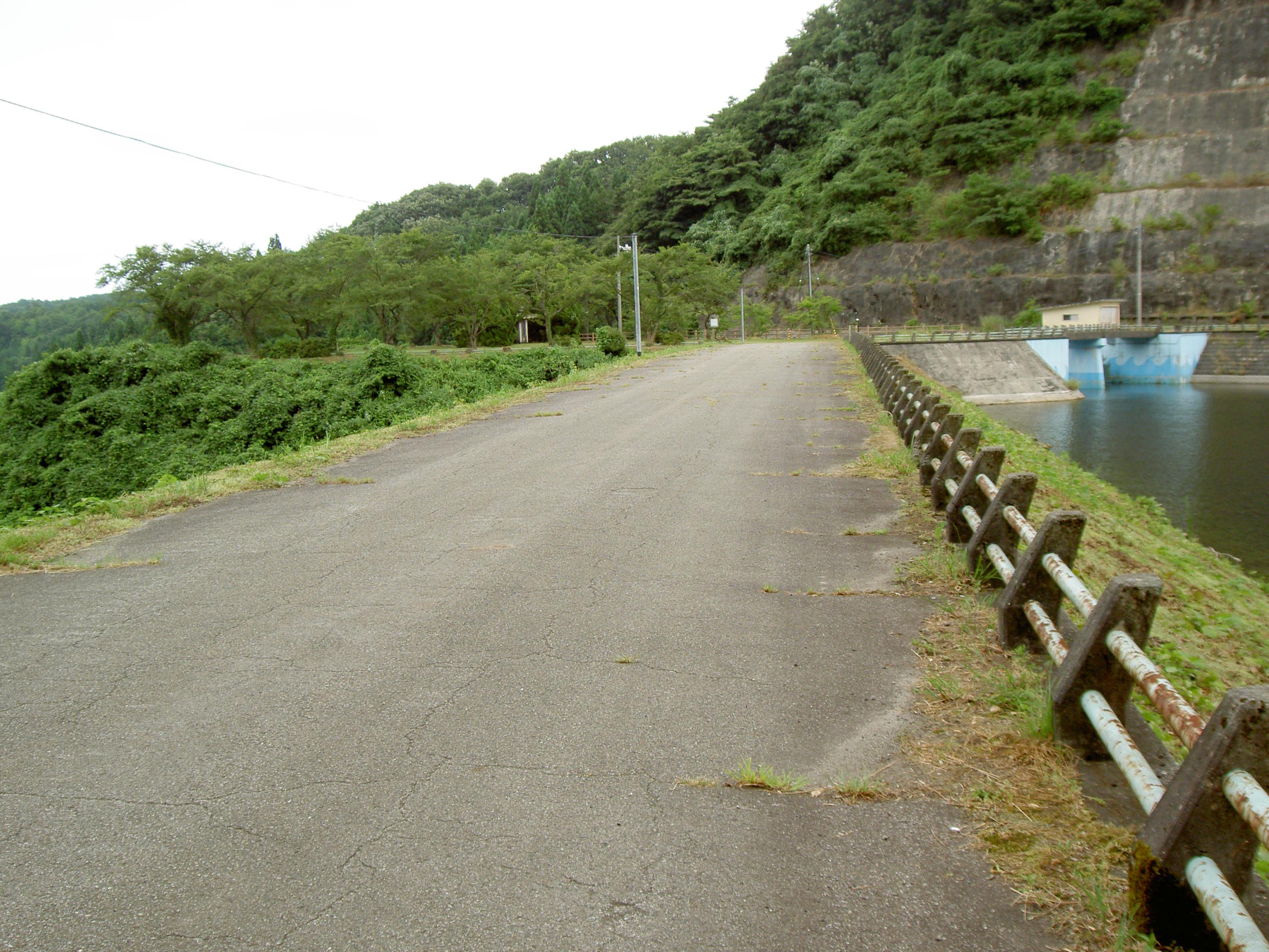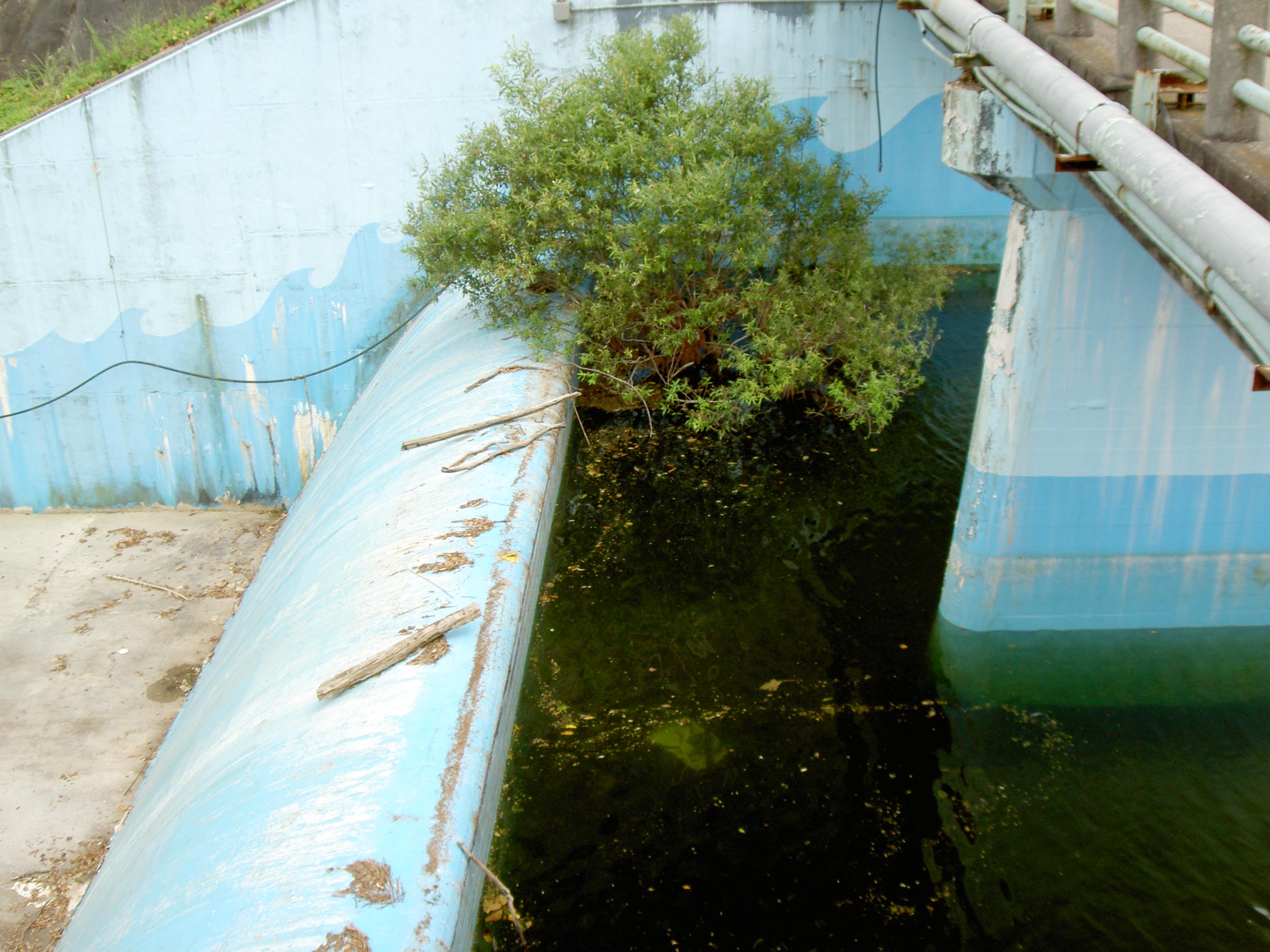 このダムには、自由越流式洪水吐がありますが、ゲートはありませんでした。しかし洪水調節が用途なのにゲートがなくては微妙な調節ができないので本当に役に立つのかどうか・・・。もっとも元々貯水量が小さいのでこれでいいのでしょう。