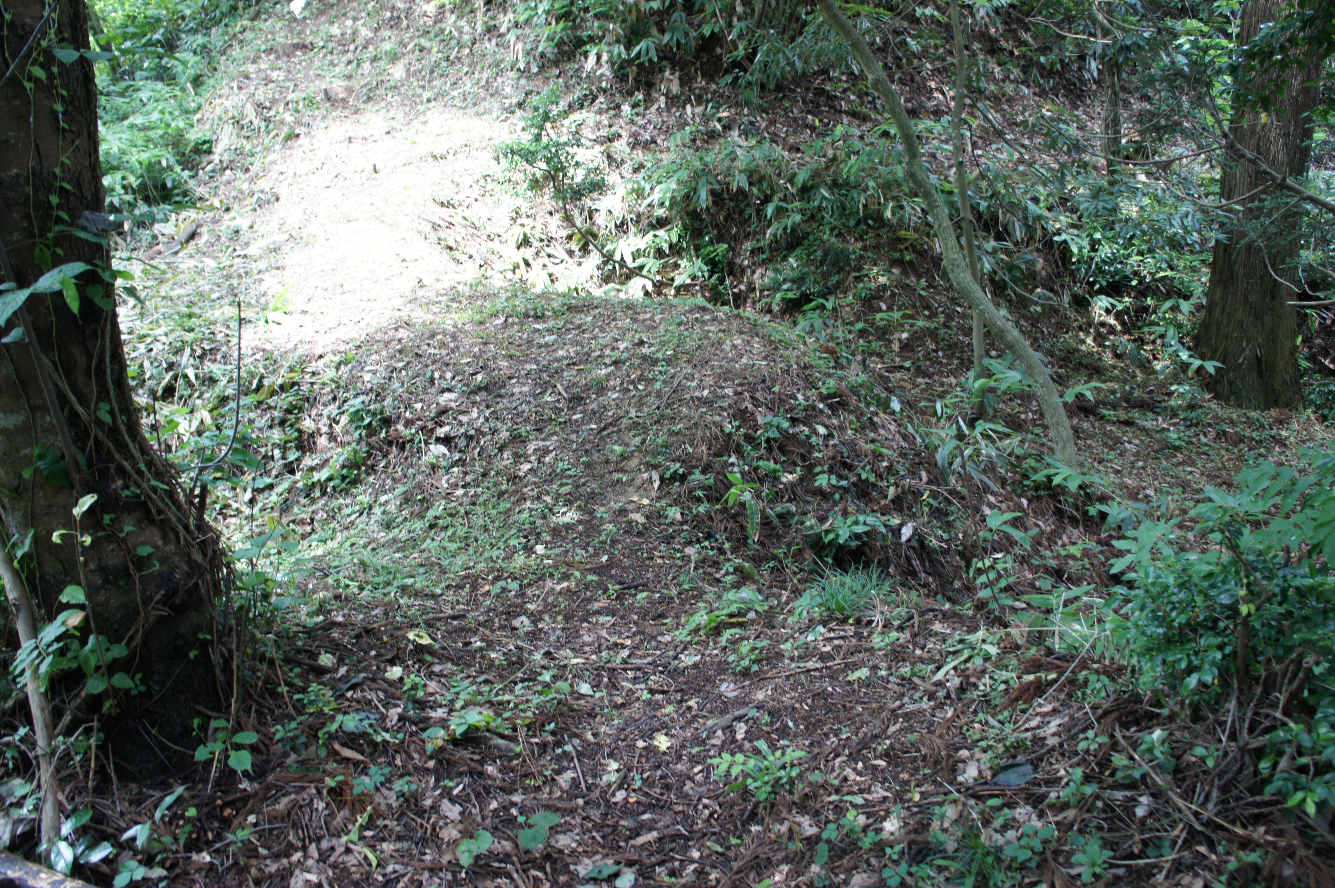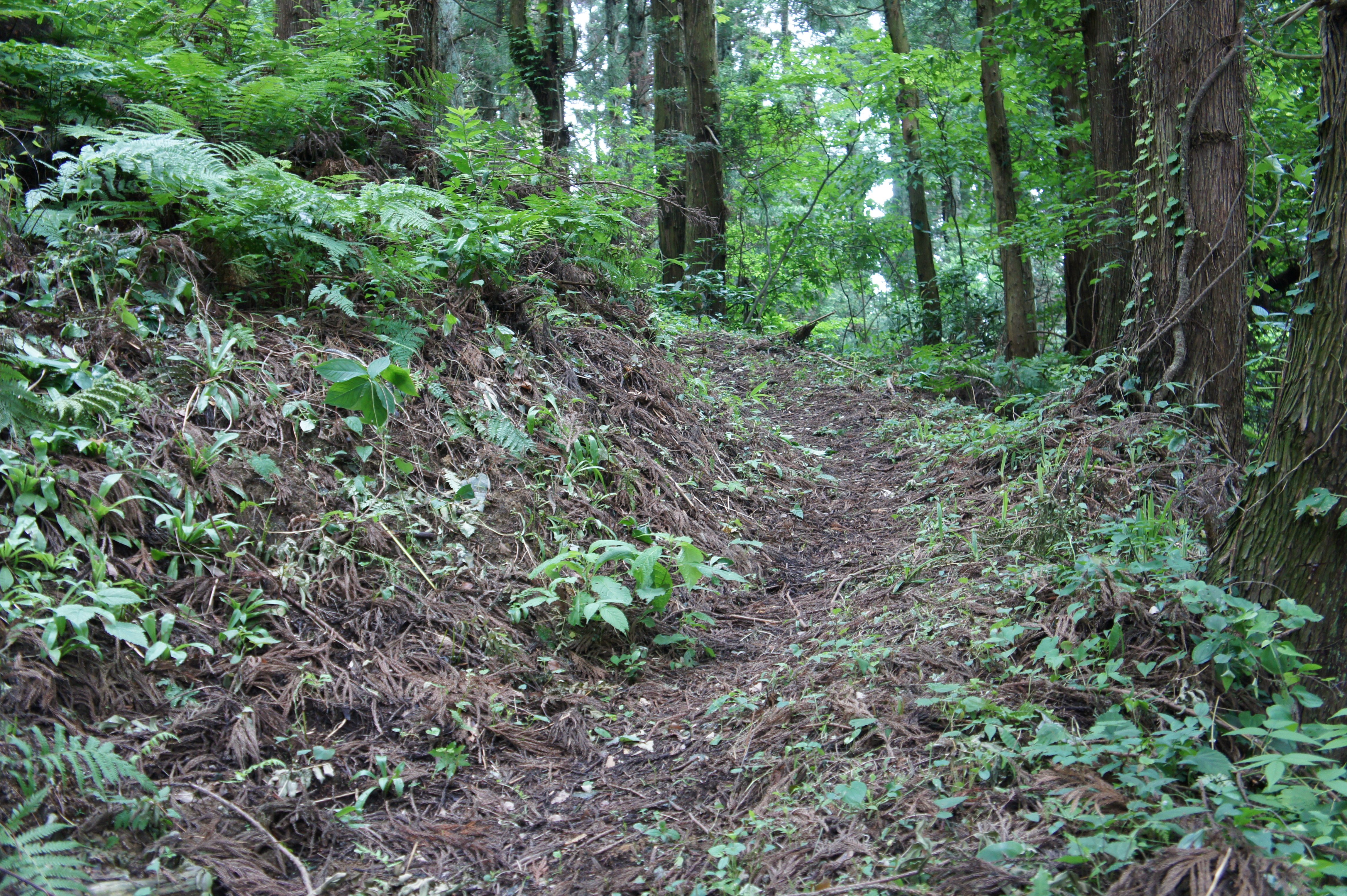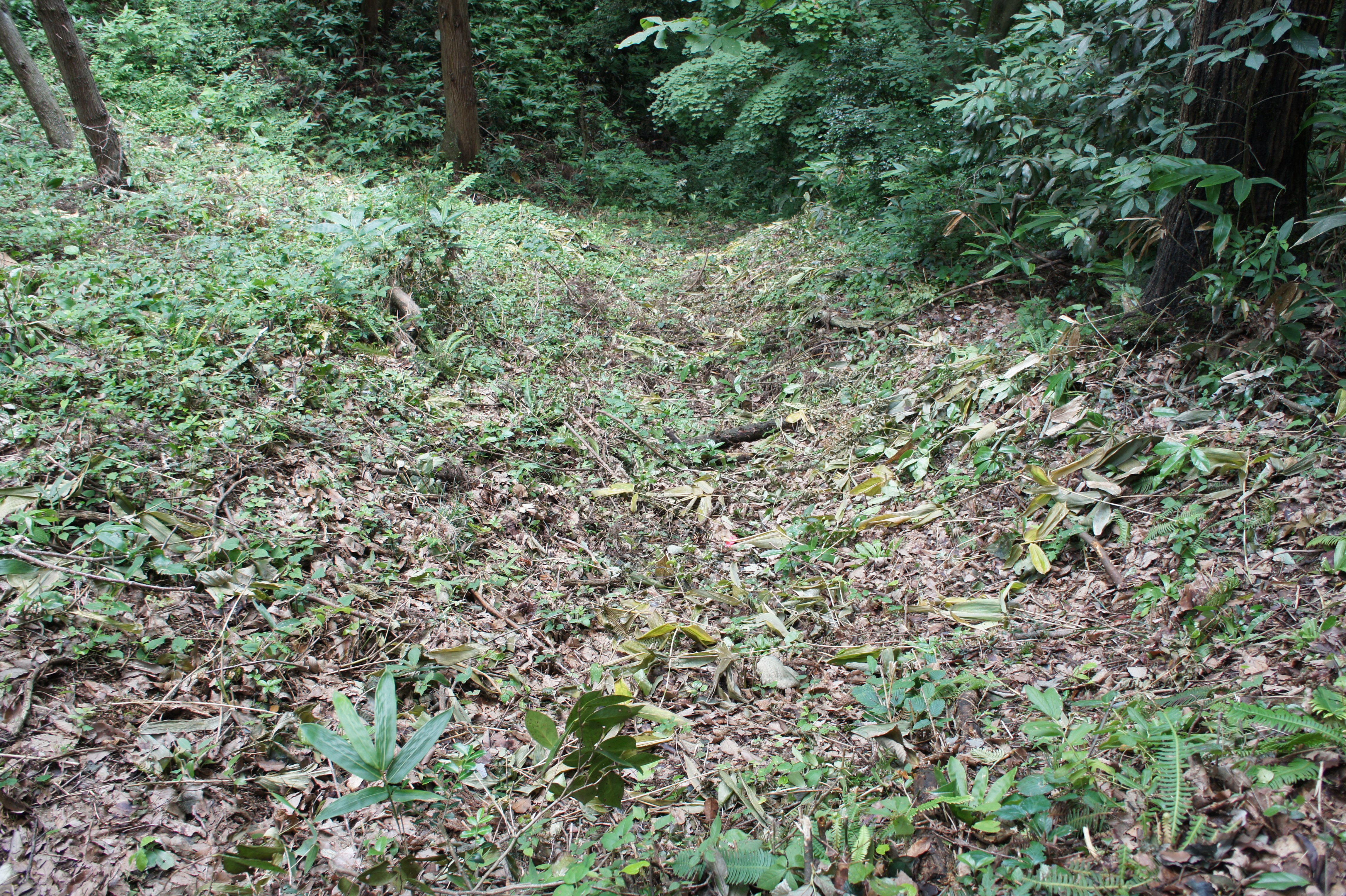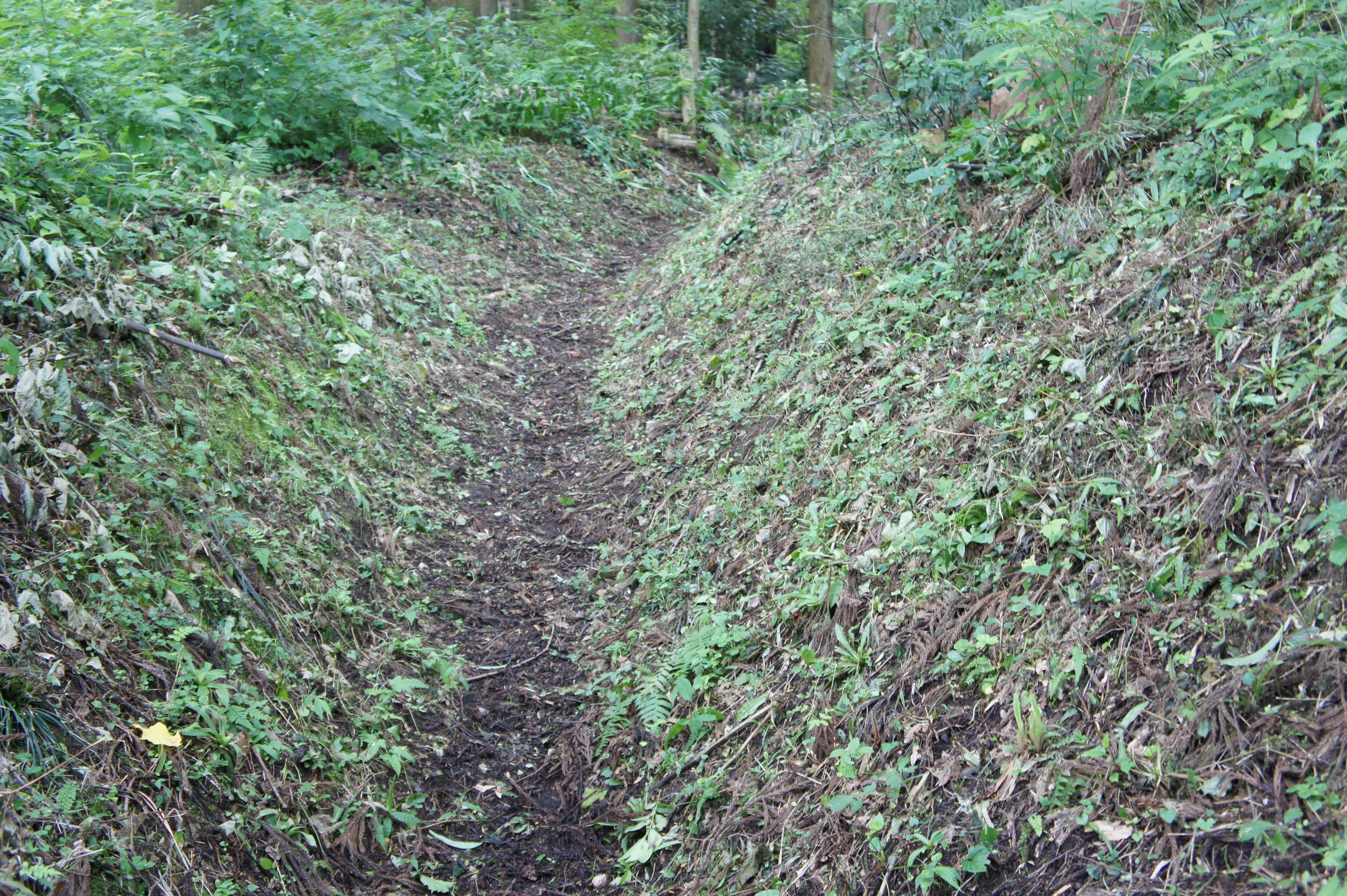 主郭手前の堀切と古池跡はこの城随一の遺構ですが、実はここからすぐに主郭に入るのではなく、右へ迂回して段郭側から主郭に入るのが大手なのですが、そこまでの整備はまだ進んでいないのが残念です。